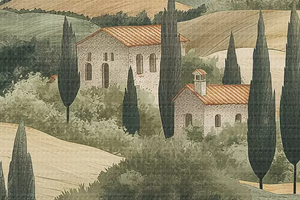 Foto Paisaje de la Toscana con casas antiguas, colores pastel, colinas y árboles, rústico Nr r40082
