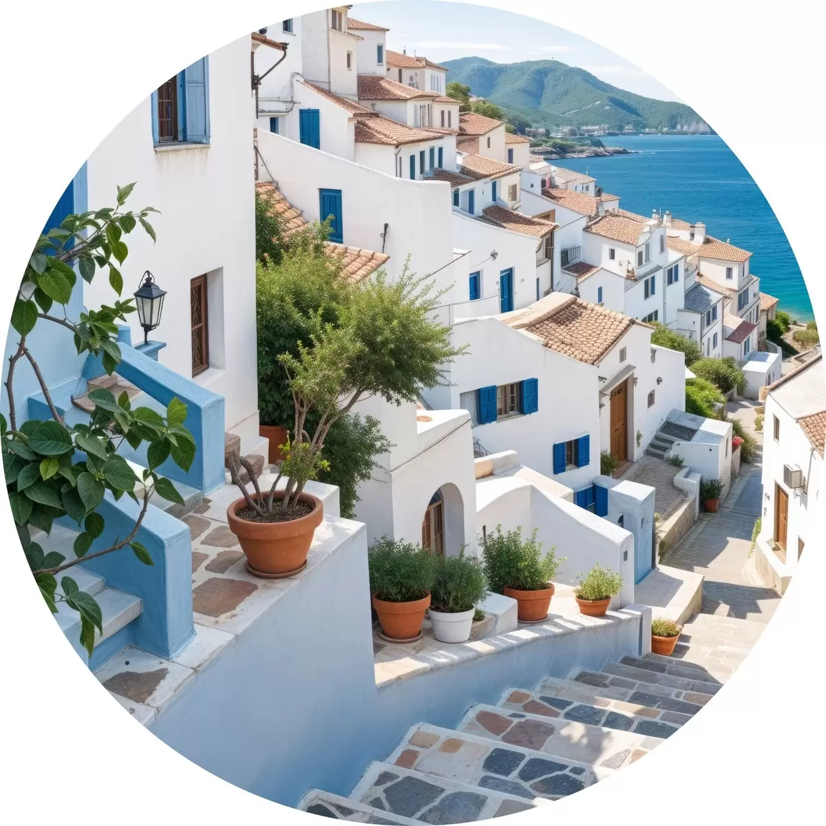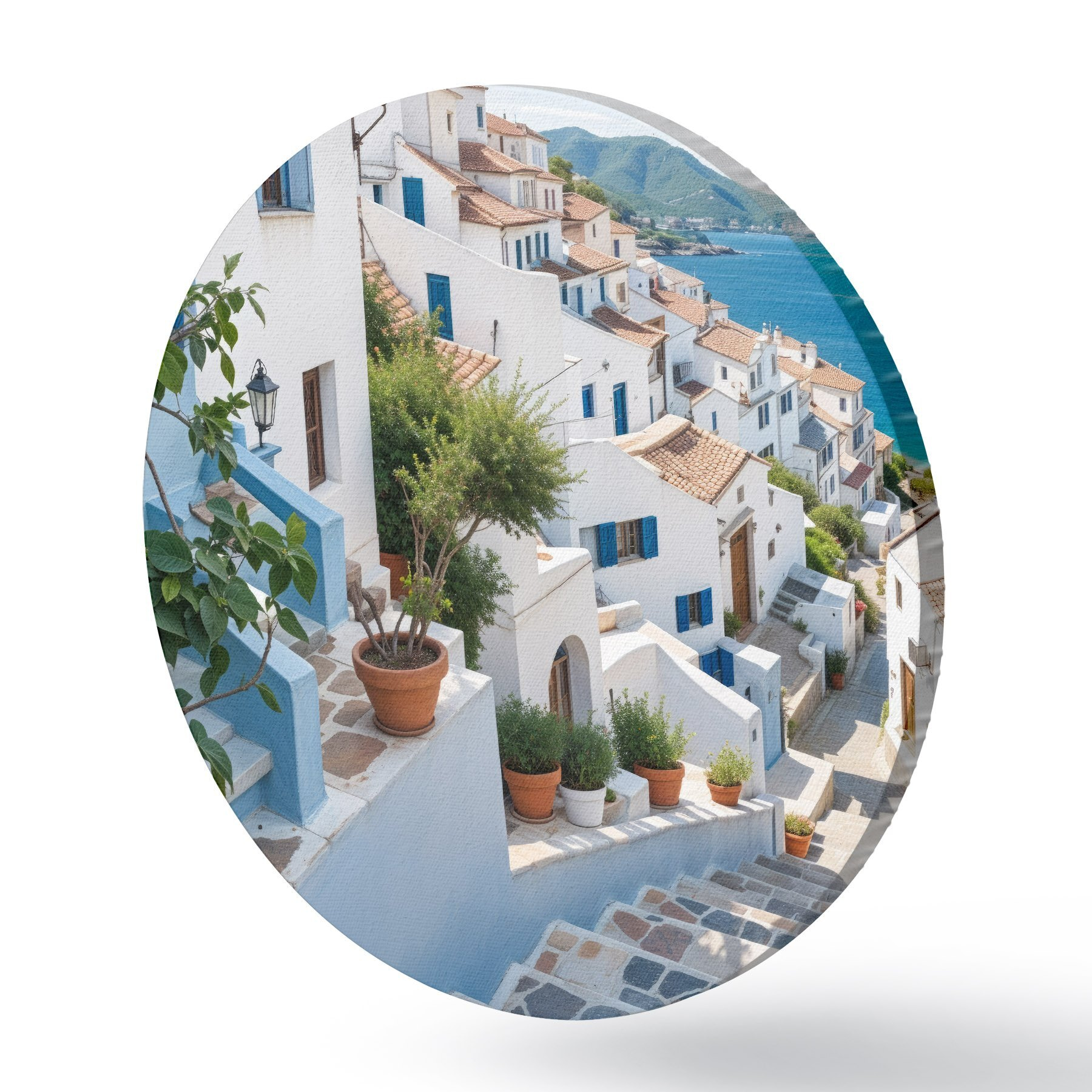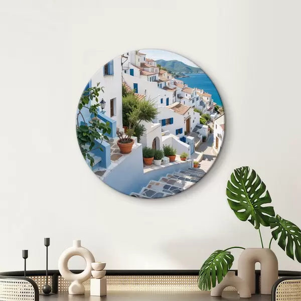 Cuadros redondos Una pintoresca ciudad costera con edificios blancos, ventanas azules y plantas en macetas que bordean las calles estrechas r40148