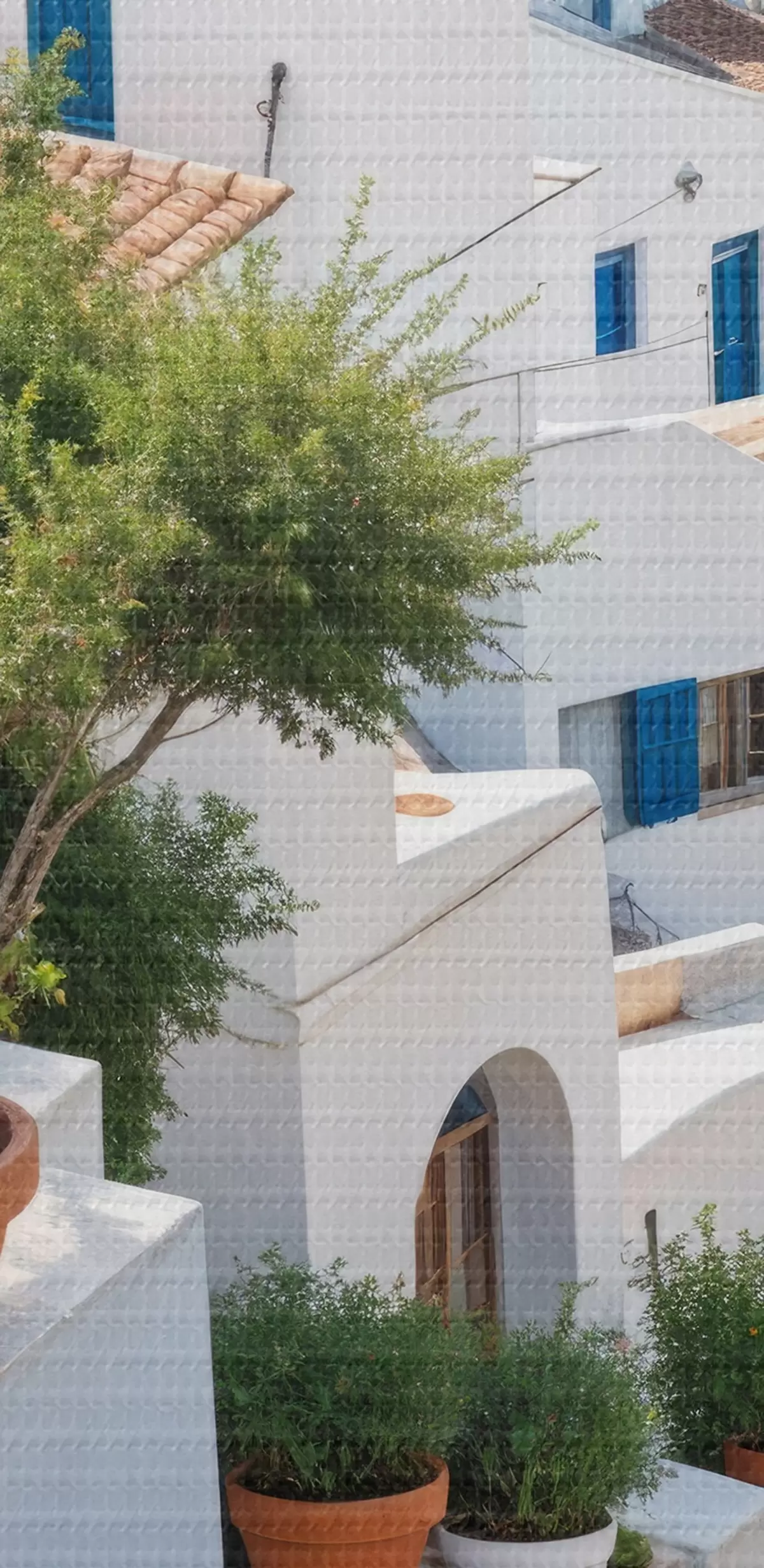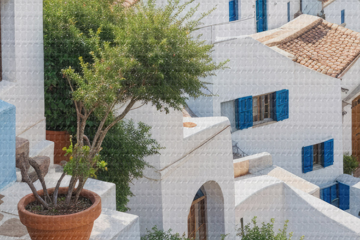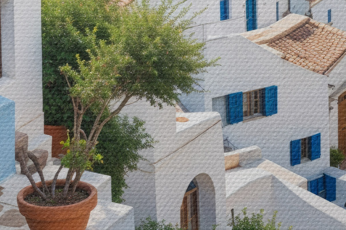 Foto Una pintoresca ciudad costera con edificios blancos, ventanas azules y plantas en macetas que bordean las calles estrechas Nr r40148