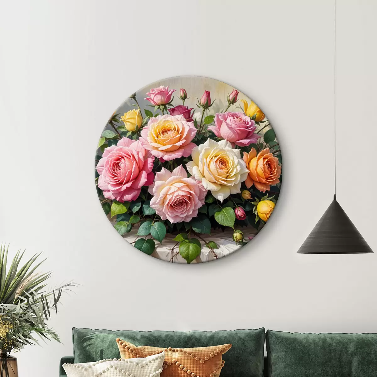 Cuadros redondos Un ramo de rosas coloridas en varios tonos de rosa, amarillo y naranja, arregladas con hojas verdes r40149