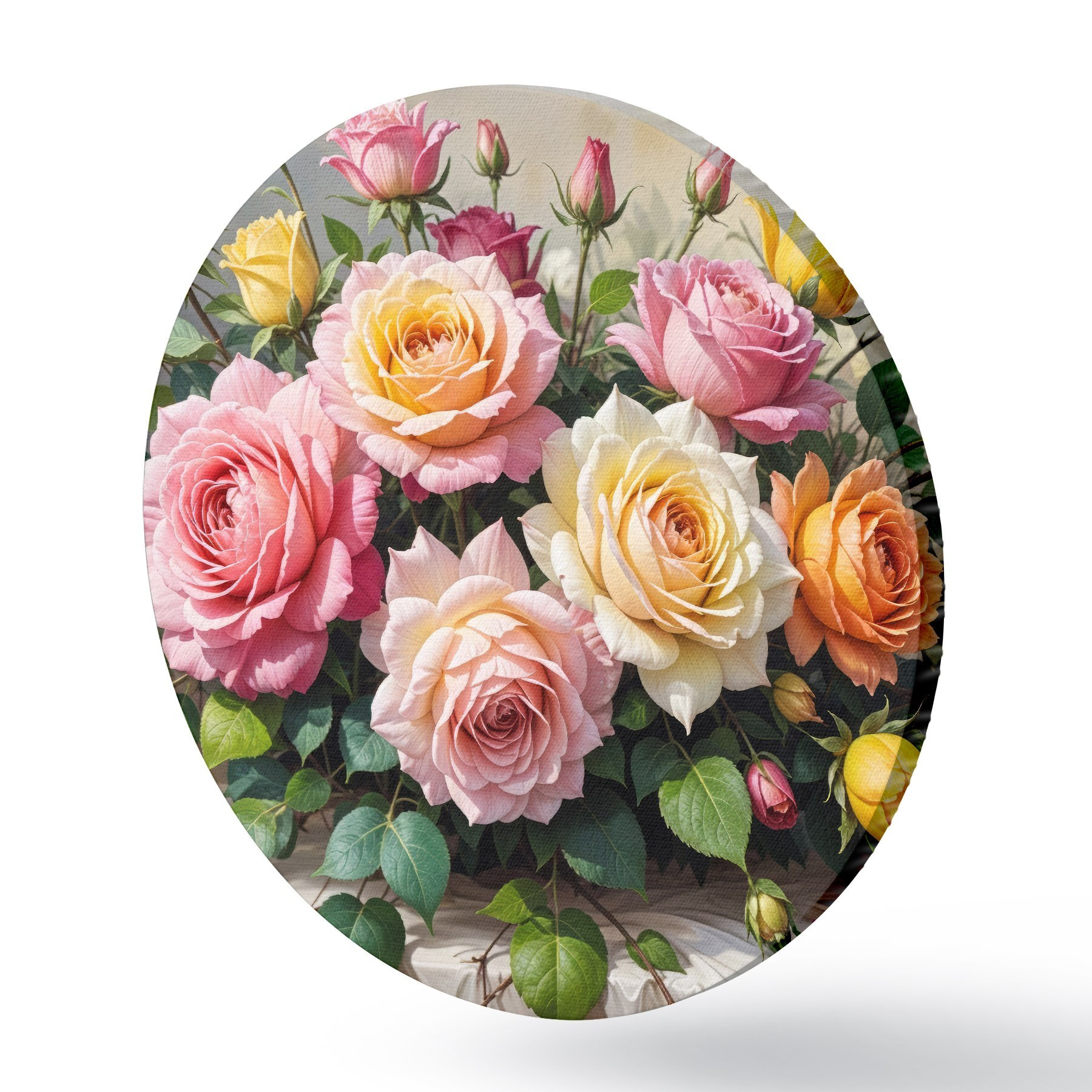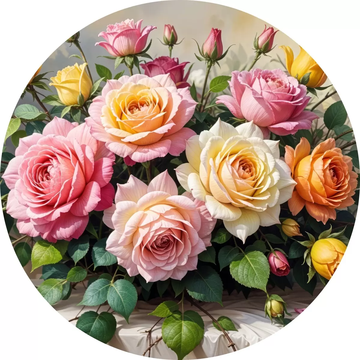 Cuadros redondos Un ramo de rosas coloridas en varios tonos de rosa, amarillo y naranja, arregladas con hojas verdes r40149