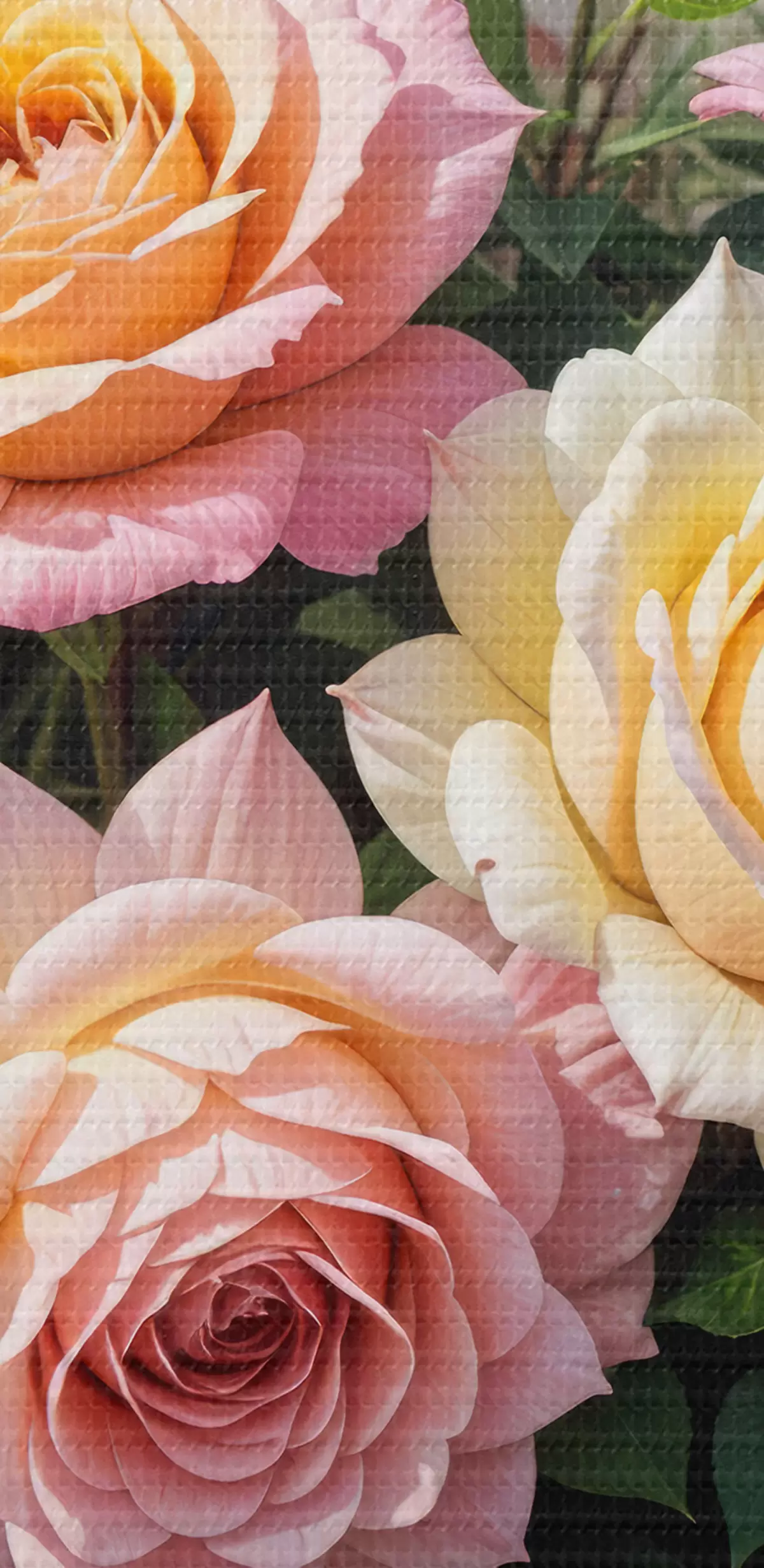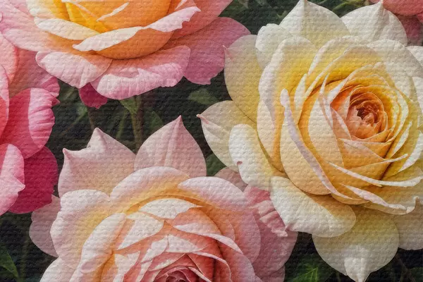 Foto Un ramo de rosas coloridas en varios tonos de rosa, amarillo y naranja, arregladas con hojas verdes Nr r40149