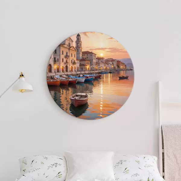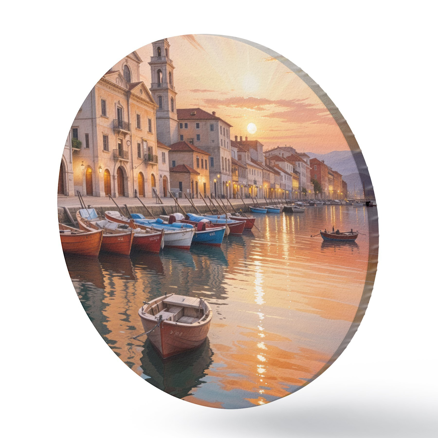 Cuadros redondos Ciudad costera italiana al atardecer, con edificios coloridos a lo largo del paseo marítimo y barcos flotando en las tranquilas aguas r40150