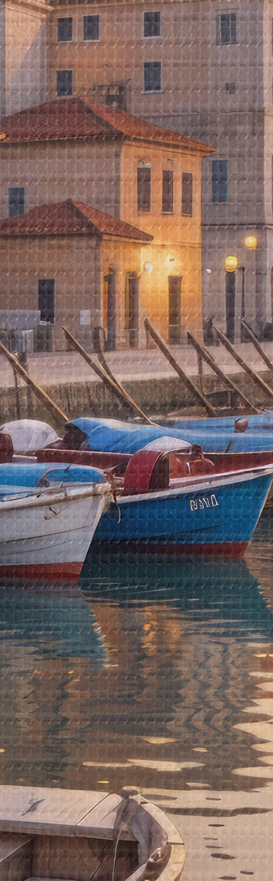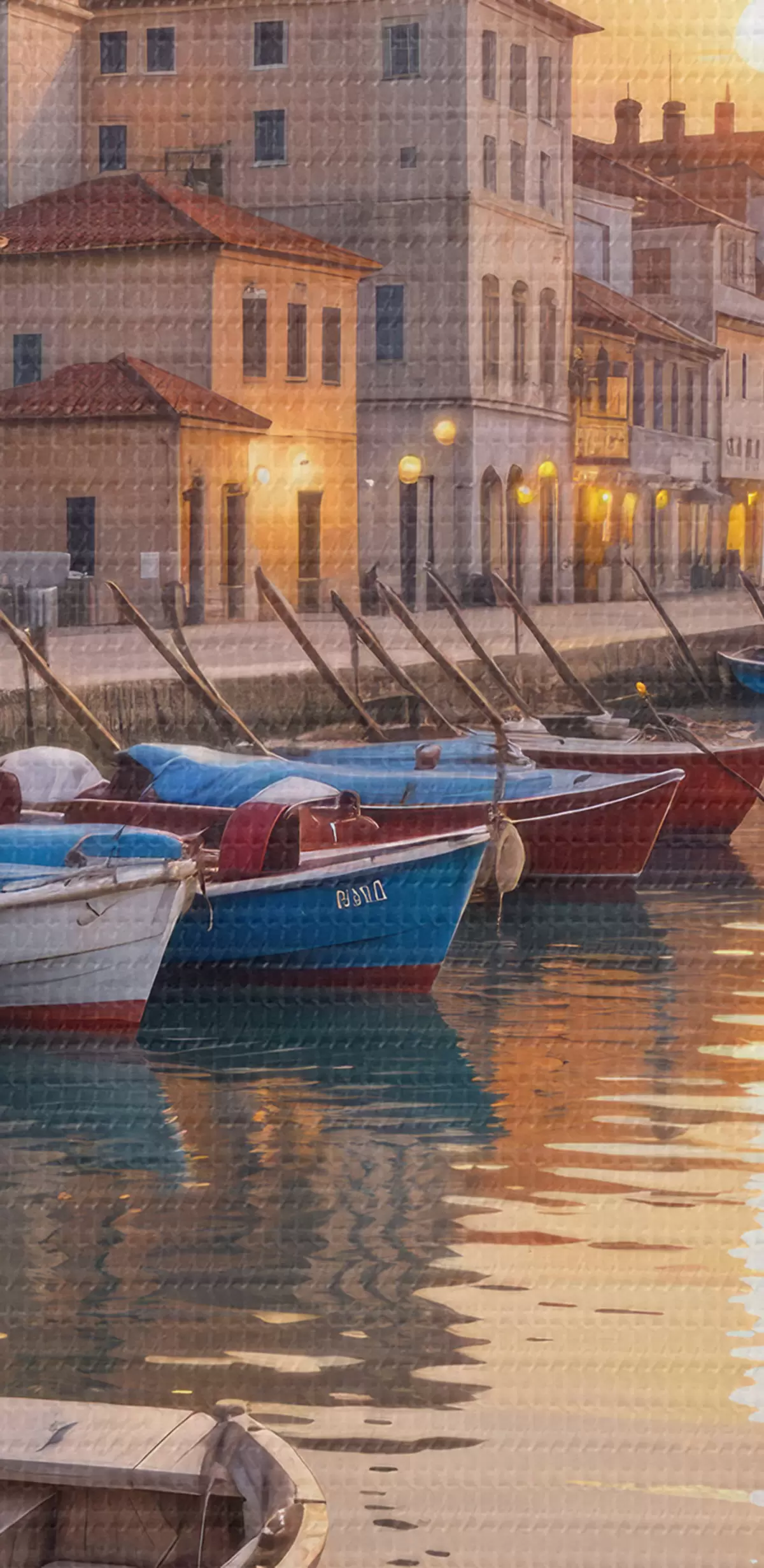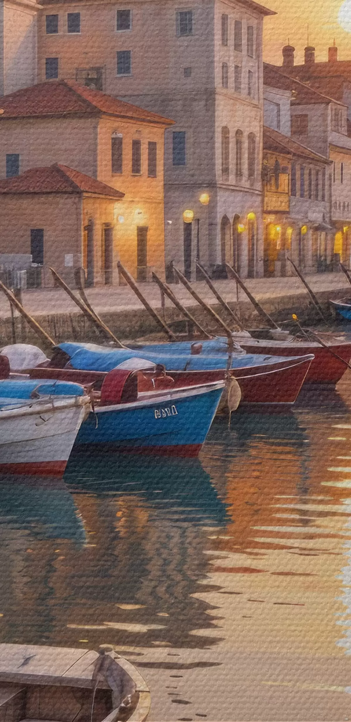Foto Ciudad costera italiana al atardecer, con edificios coloridos a lo largo del paseo marítimo y barcos flotando en las tranquilas aguas Nr r40150