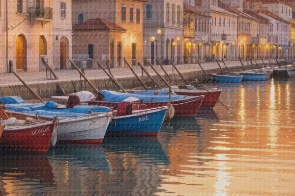 Foto Ciudad costera italiana al atardecer, con edificios coloridos a lo largo del paseo marítimo y barcos flotando en las tranquilas aguas Nr r40150