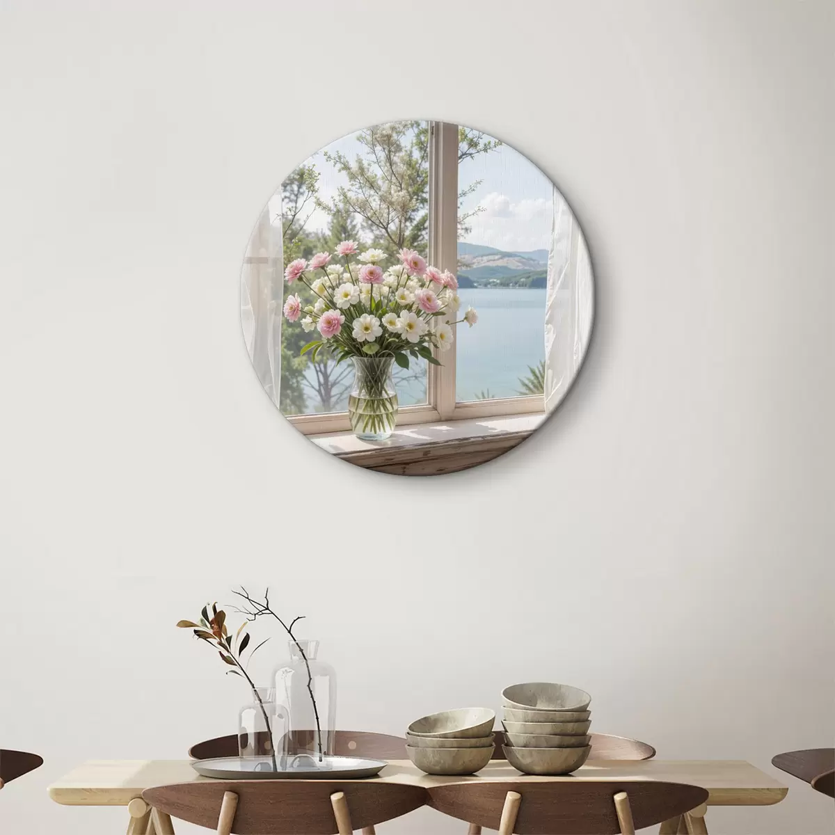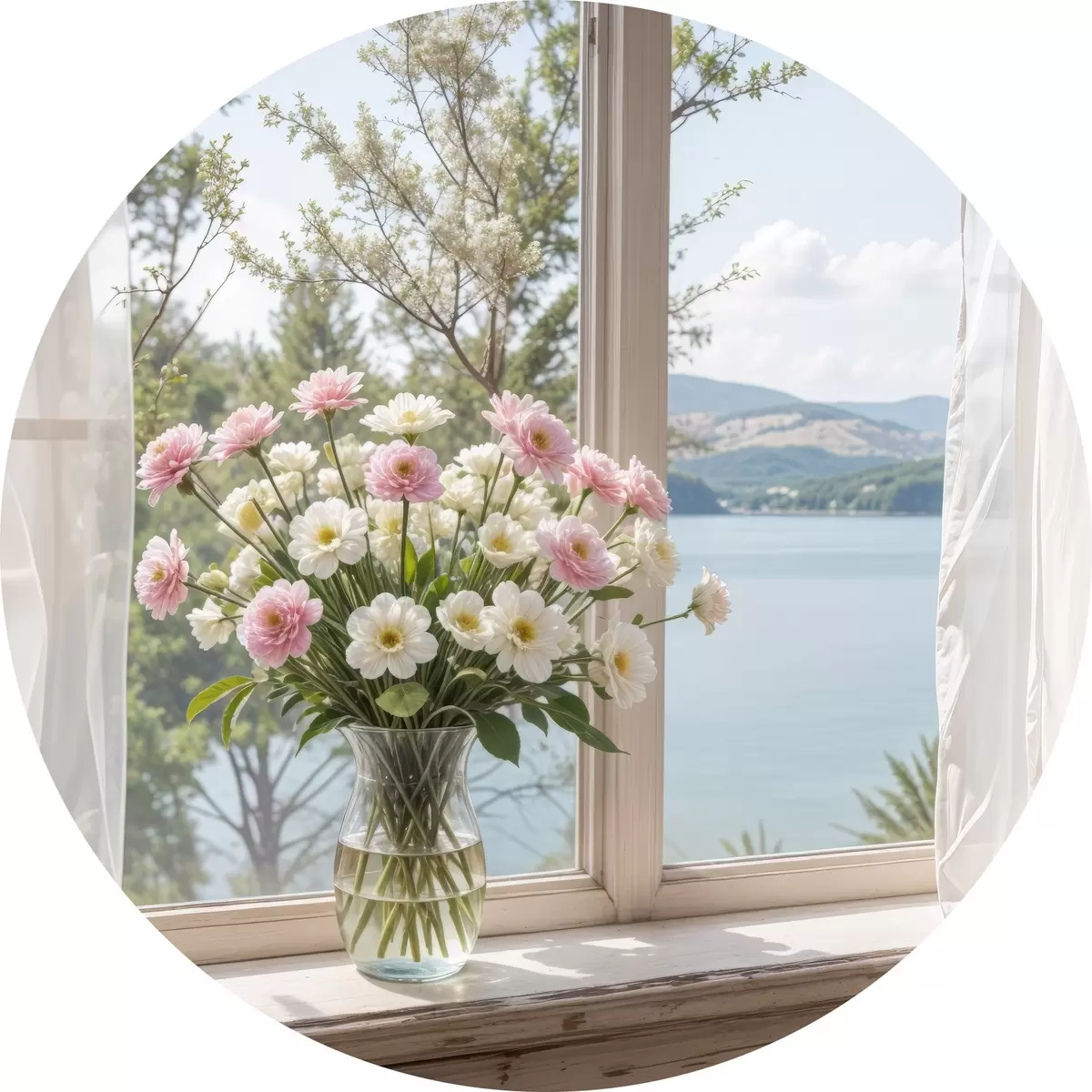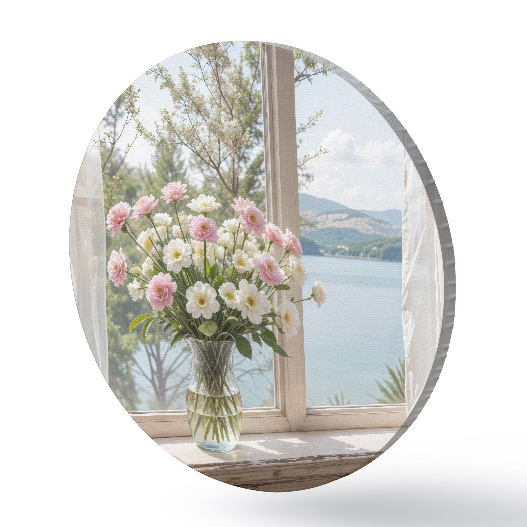 Cuadros redondos Un ramo de flores rosas y blancas en un jarrón de vidrio colocado en el alféizar de una ventana, con un pintoresco lago y montañas r40151