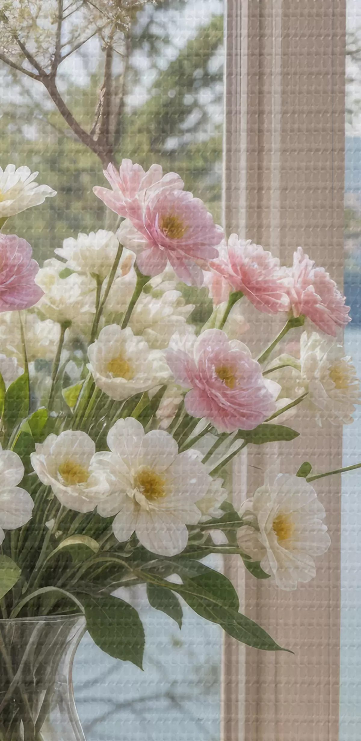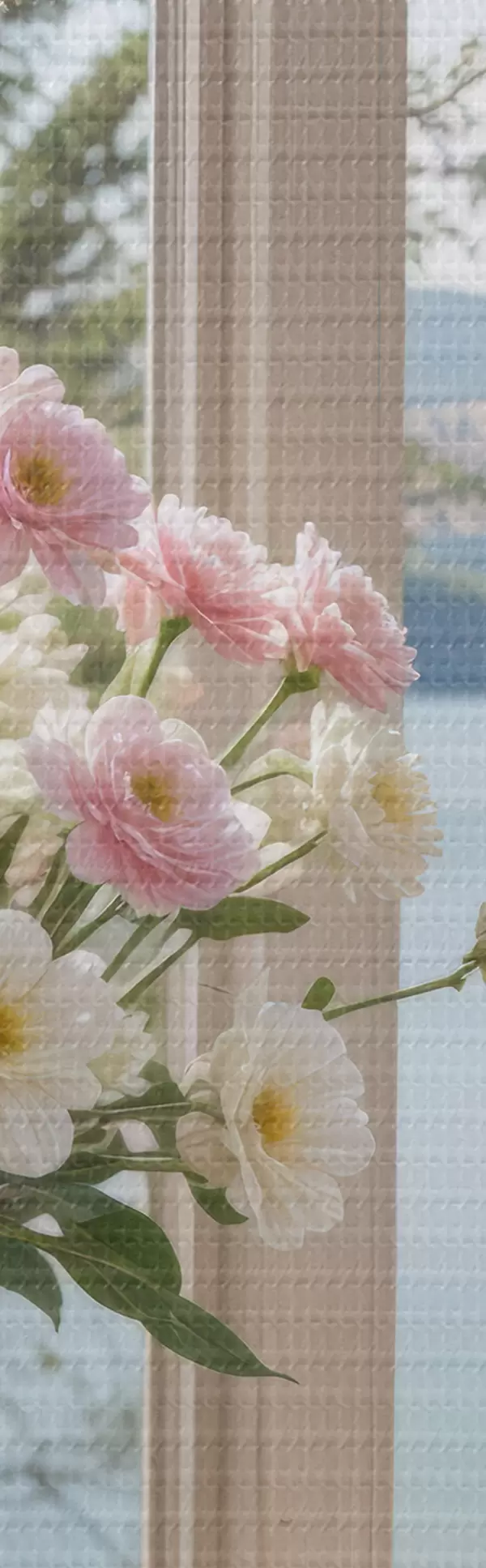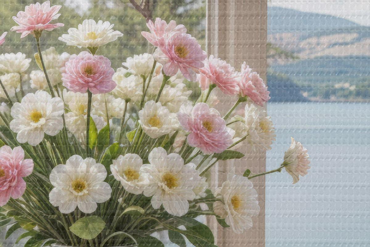 Foto Un ramo de flores rosas y blancas en un jarrón de vidrio colocado en el alféizar de una ventana, con un pintoresco lago y montañas Nr r40151