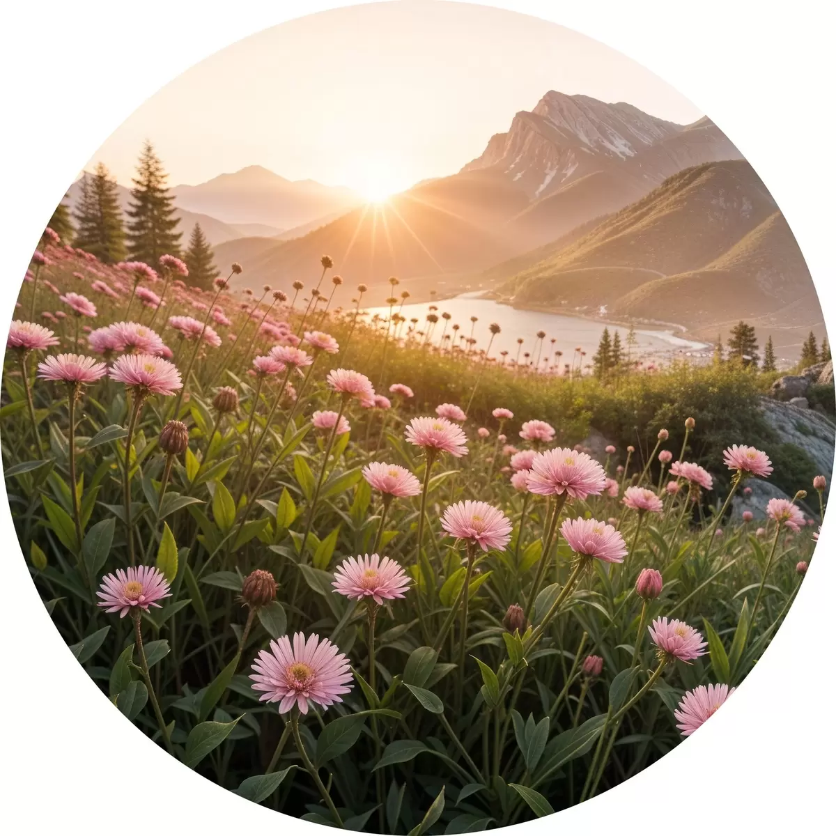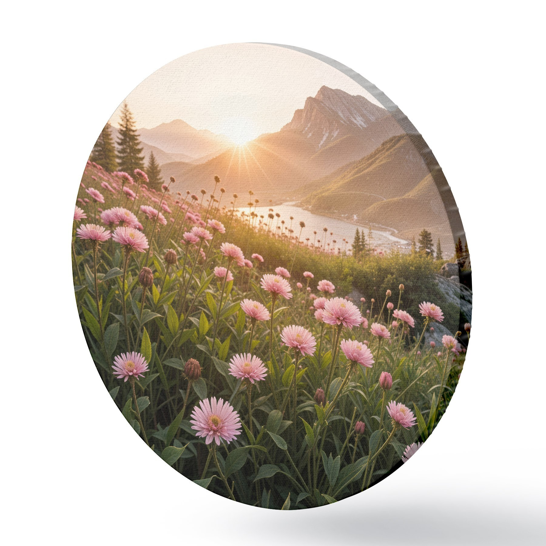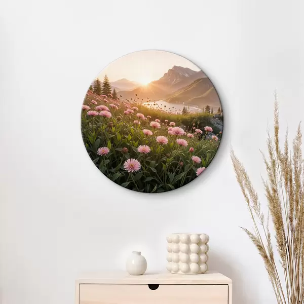 Cuadros redondos Un campo de flores rosas parecidas a margaritas en primer plano, con una gran cadena montañosa al fondo r40154