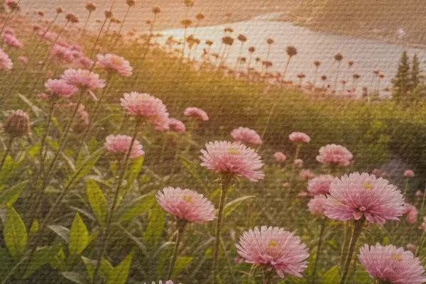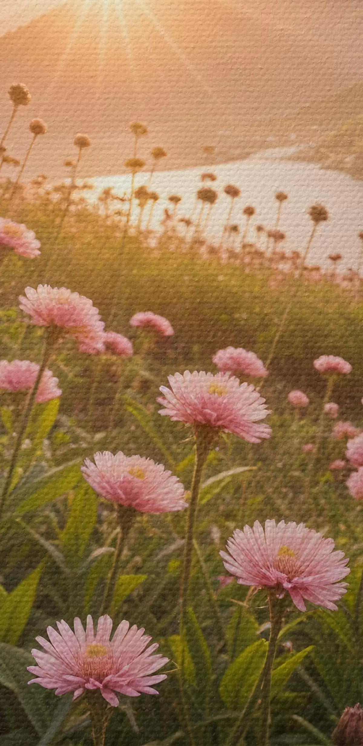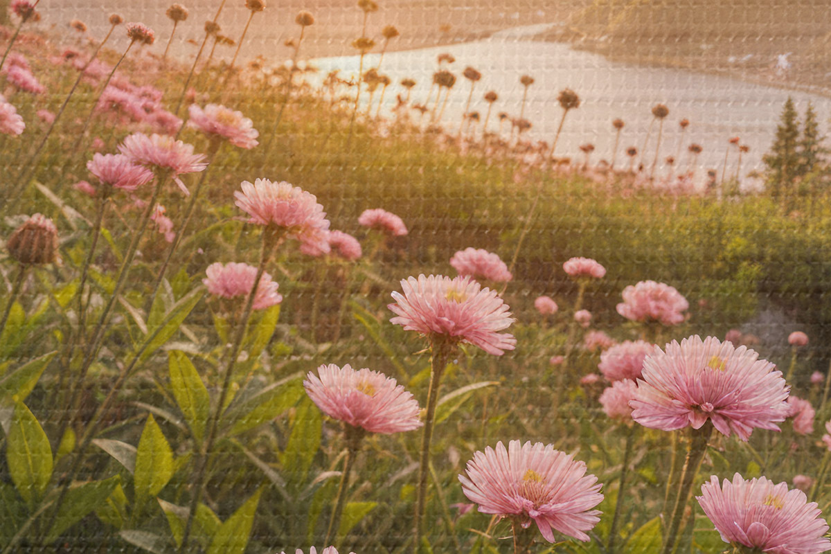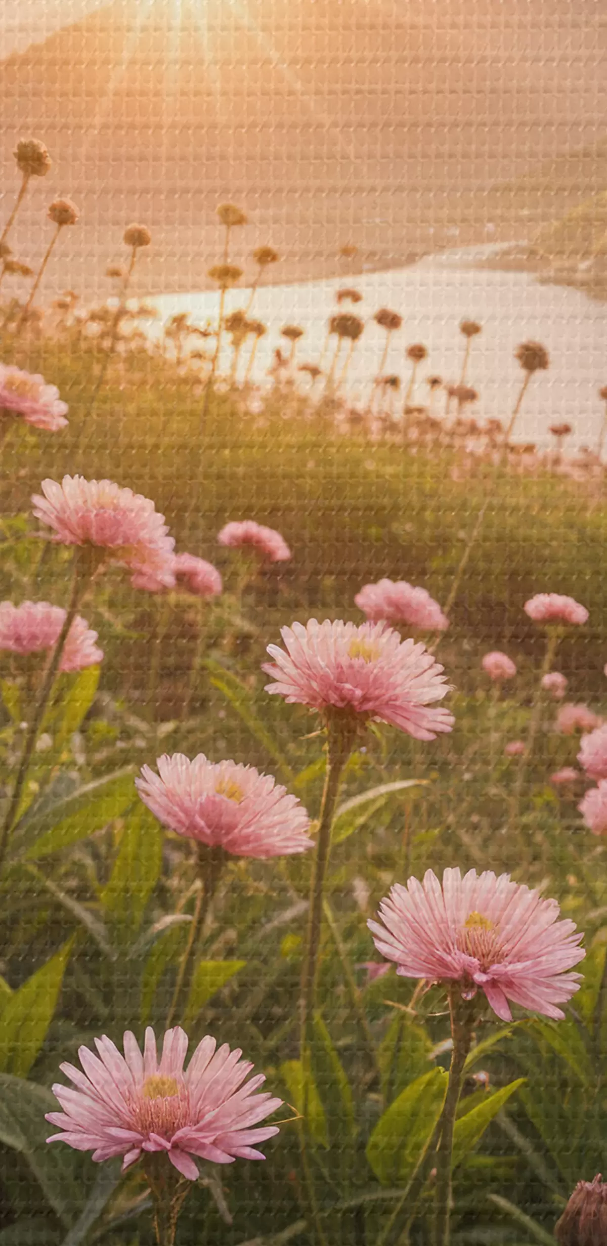 Foto Un campo de flores rosas parecidas a margaritas en primer plano, con una gran cadena montañosa al fondo Nr r40154