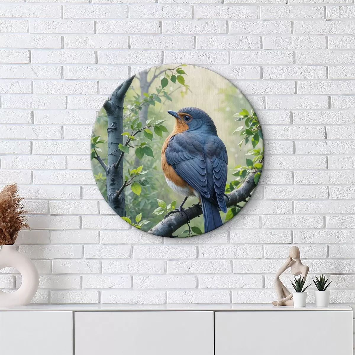 Cuadros redondos Dos pájaros azules y naranjas posados en la rama de un árbol con hojas verdes en el fondo r40156