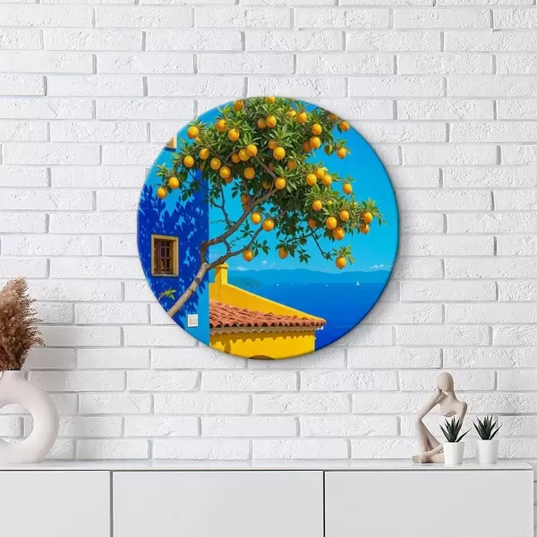 Cuadros redondos Un naranjo con frutos maduros que crece en un edificio con una pared azul y un techo de tejas con vista al océano r40159