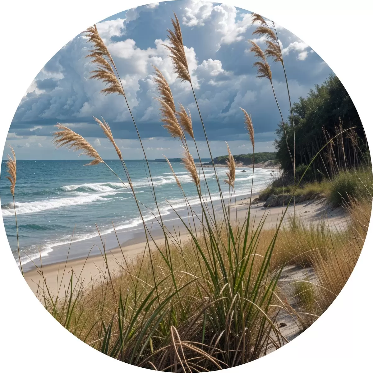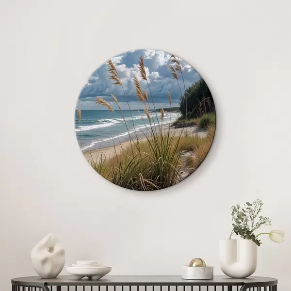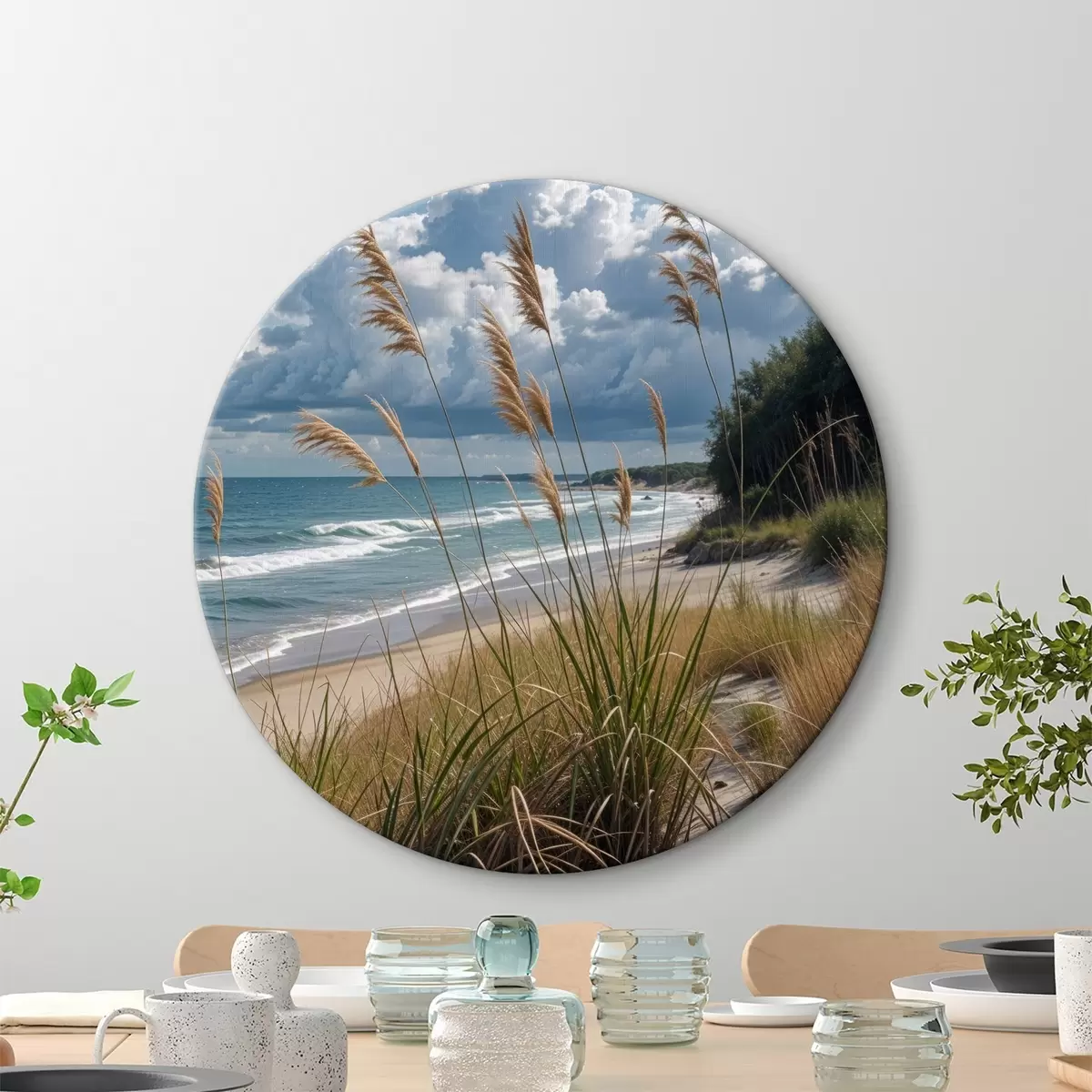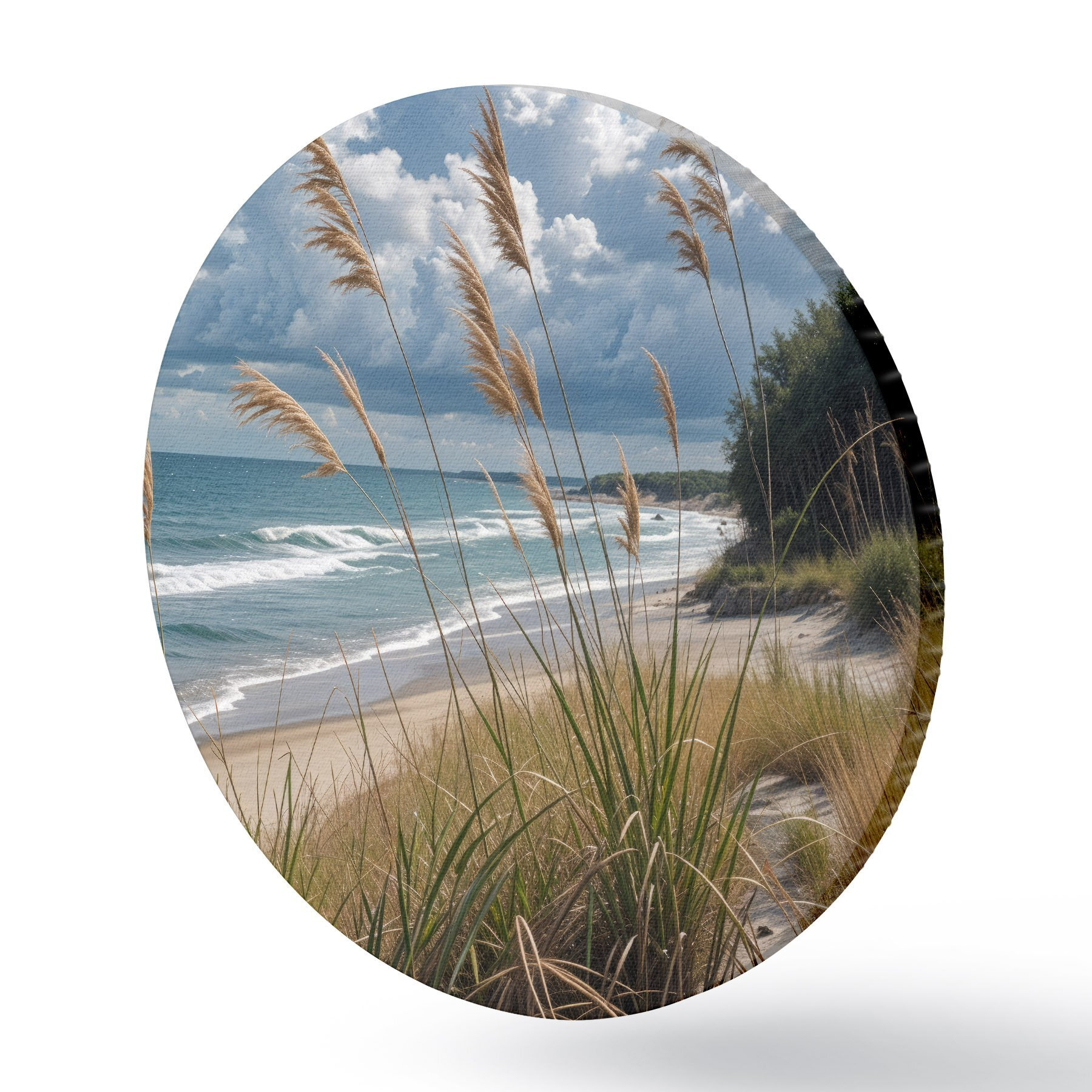 Cuadros redondos Una playa pintoresca con hierba alta meciéndose con el viento, con vista al océano con olas rompientes y un cielo nublado r40161