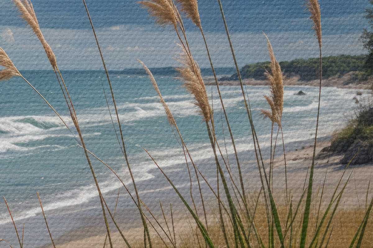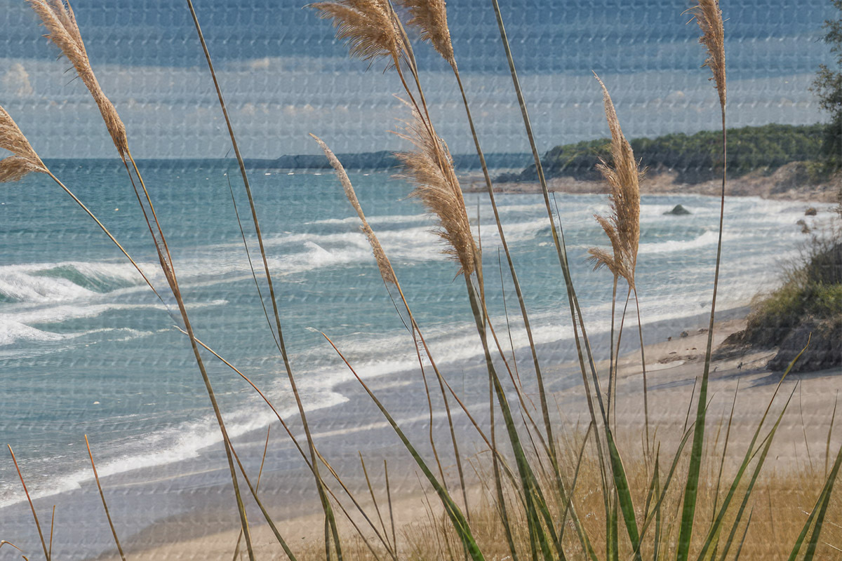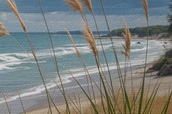 Foto Una playa pintoresca con hierba alta meciéndose con el viento, con vista al océano con olas rompientes y un cielo nublado Nr r40161