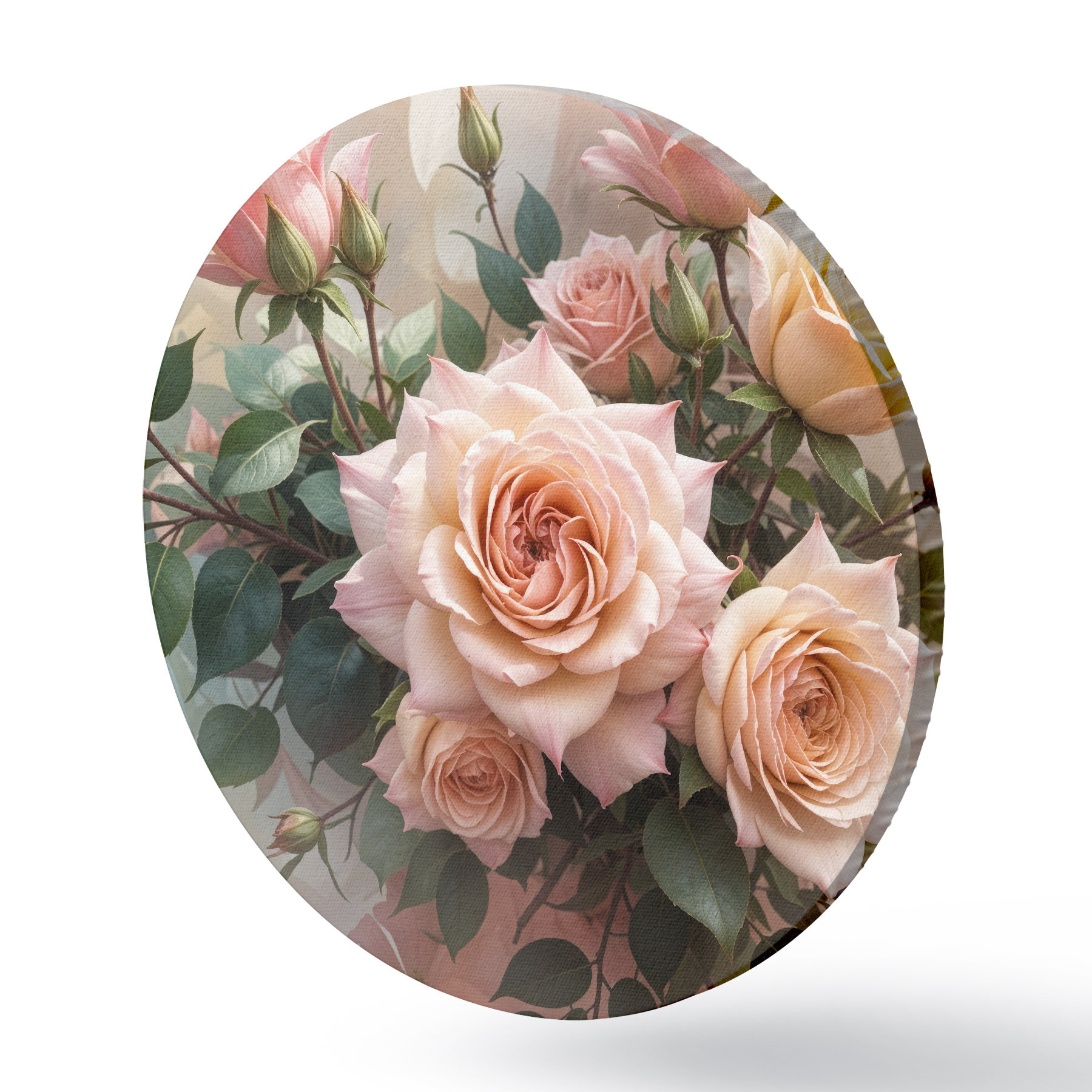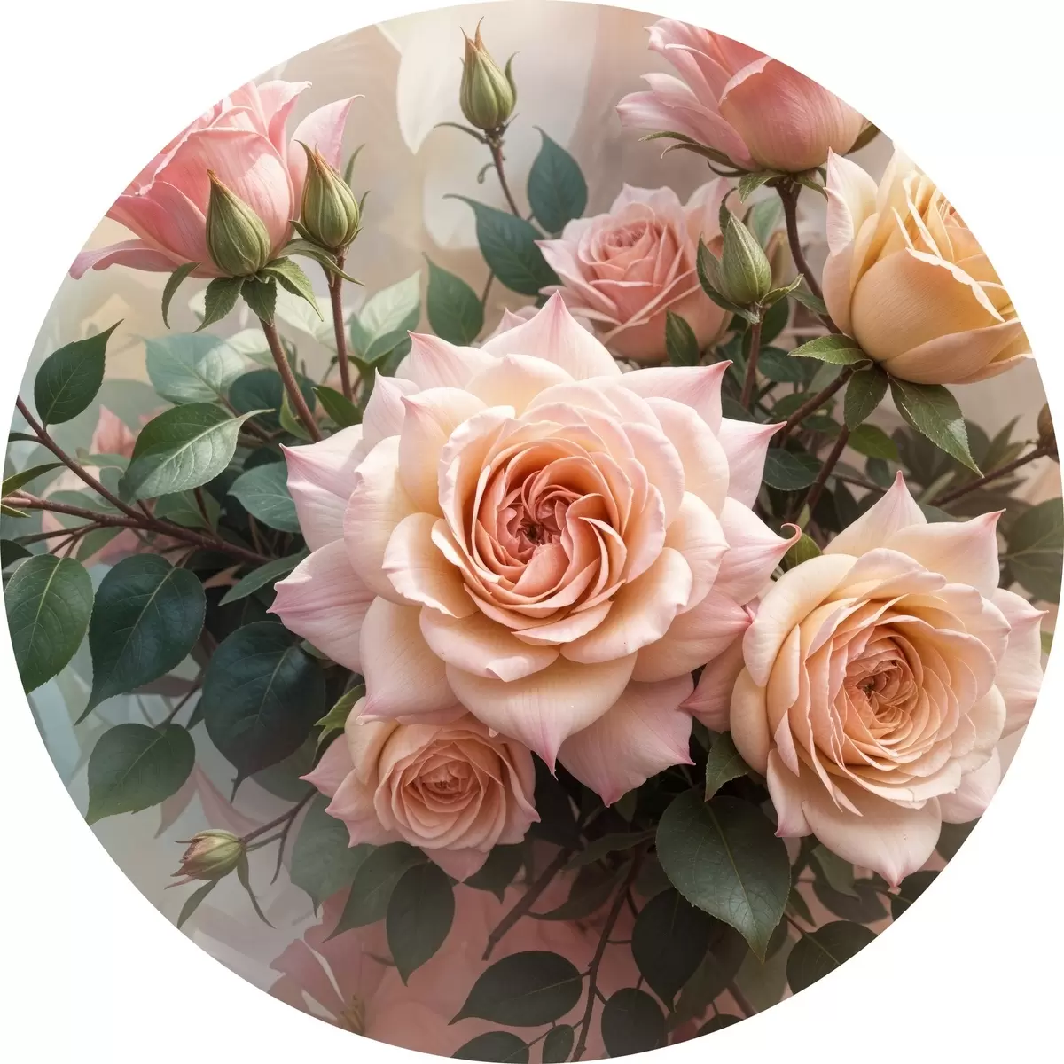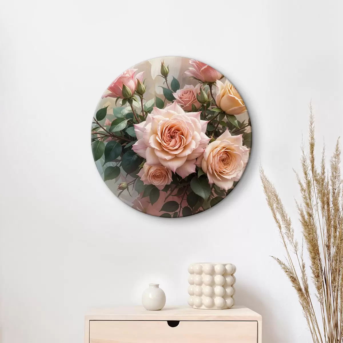Cuadros redondos Un ramo de hermosas rosas rosadas con hojas verdes sobre un fondo suave y borroso r40168