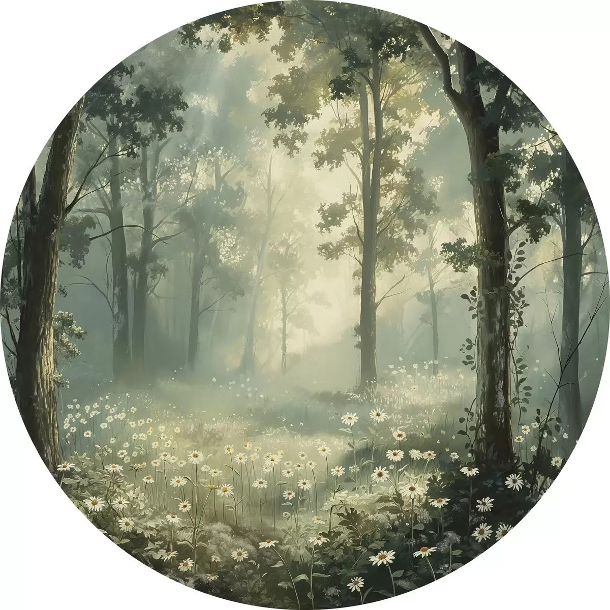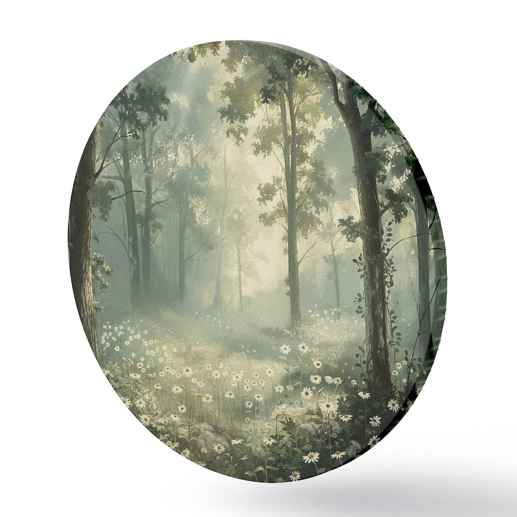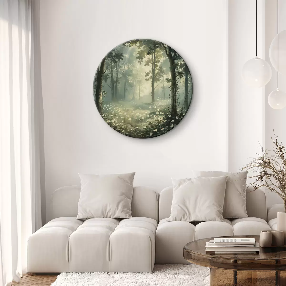 Cuadros redondos Bosque con suave luz solar, flores de manzanilla, árboles, hierba verde, dibujo acrílico r40228