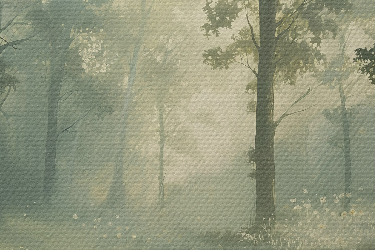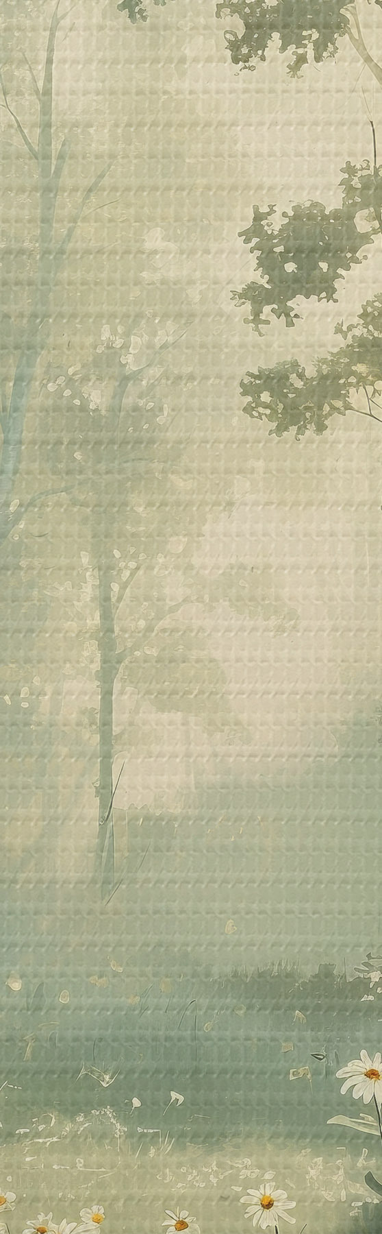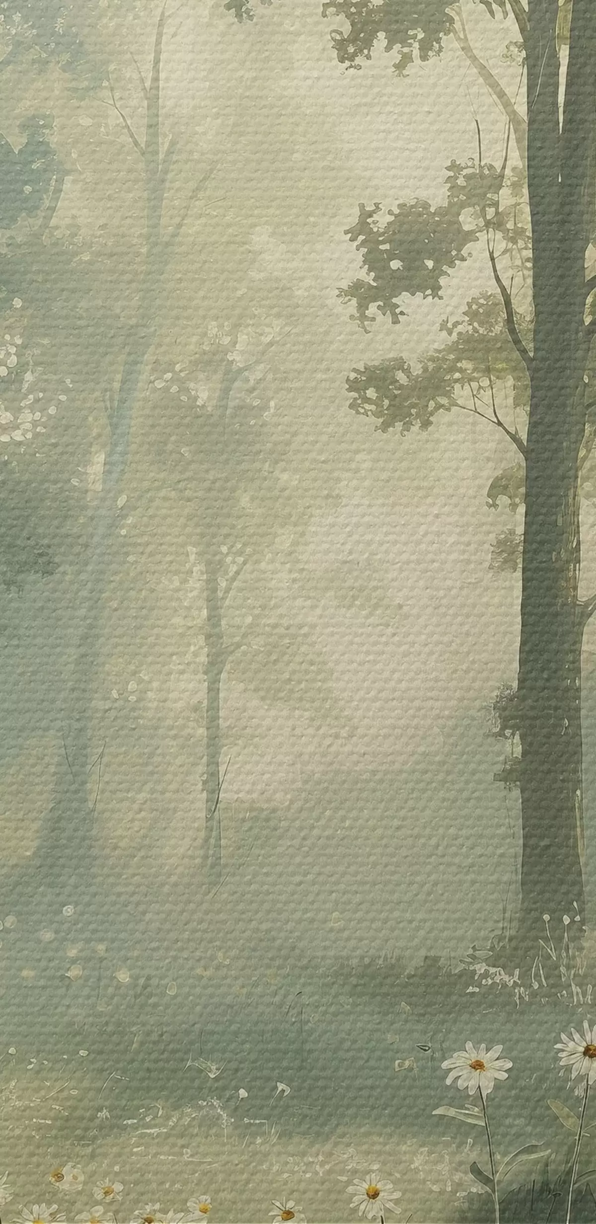 Foto Bosque con suave luz solar, flores de manzanilla, árboles, hierba verde, dibujo acrílico Nr r40228