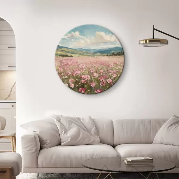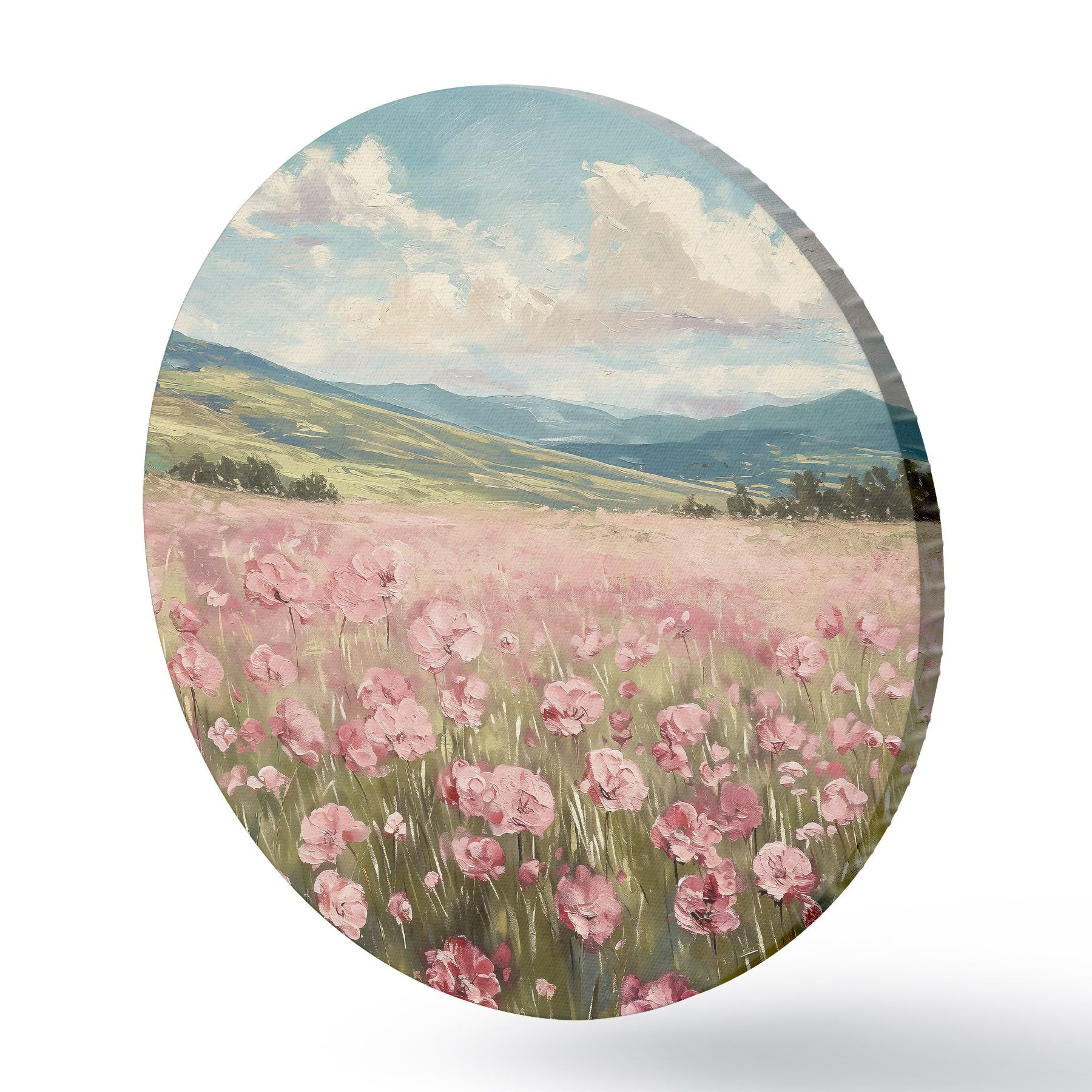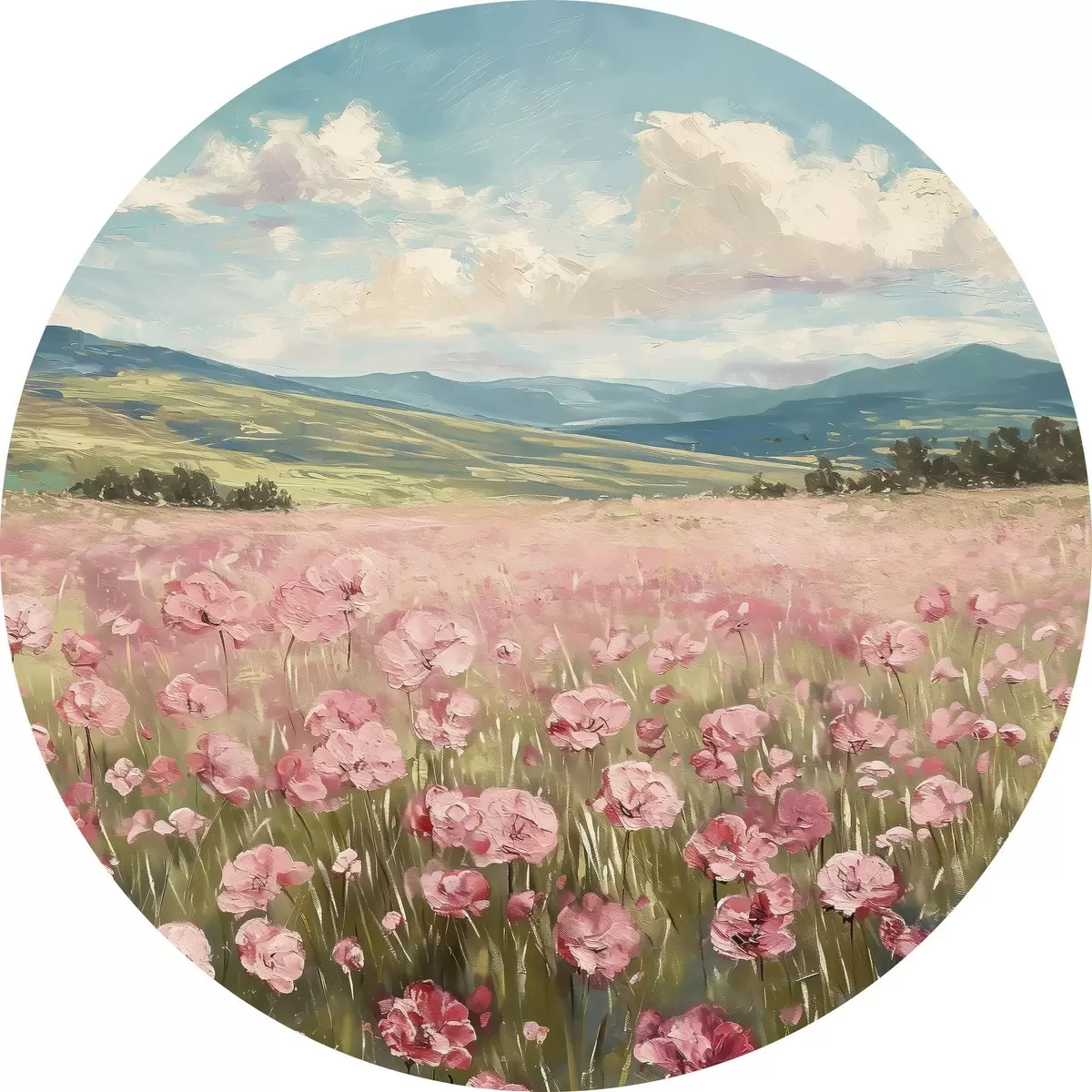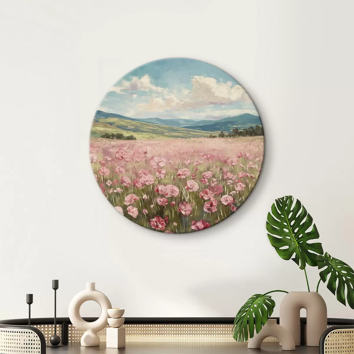 Cuadros redondos Prado con flores rosas, montañas, paisaje natural, cielo azul con nubes, acrílico r40232