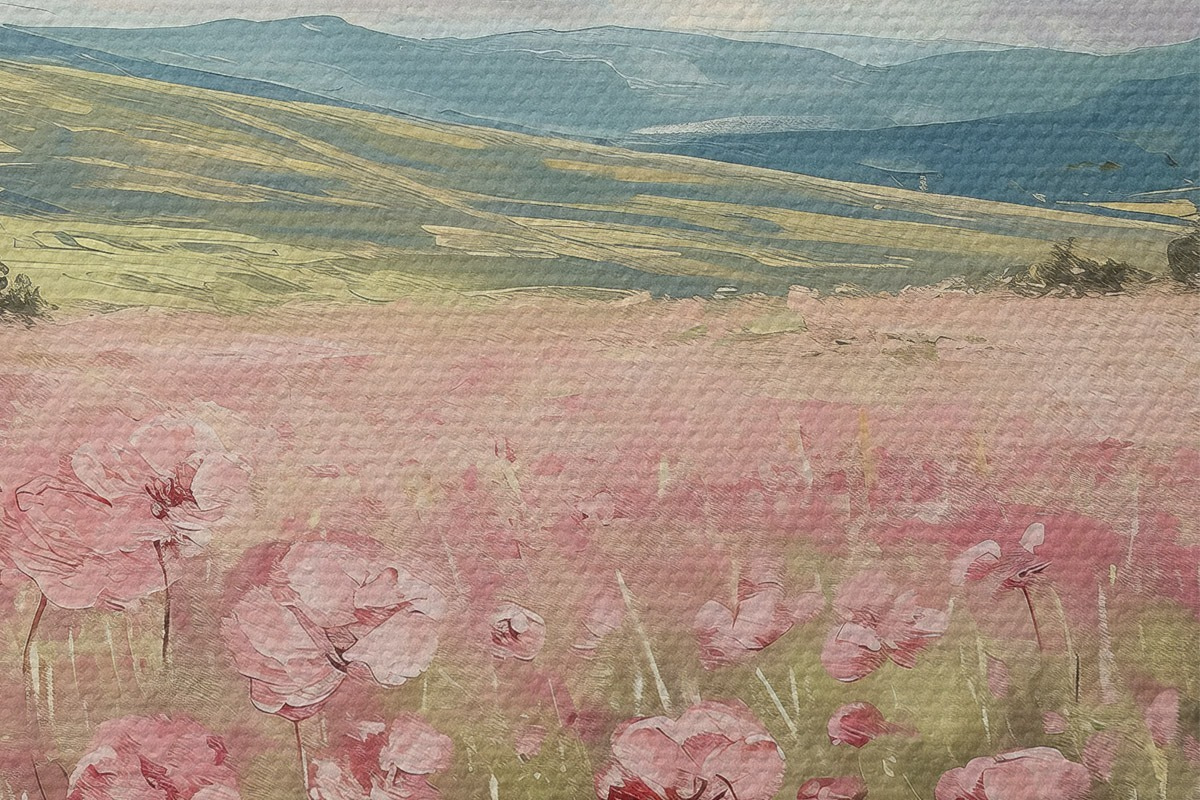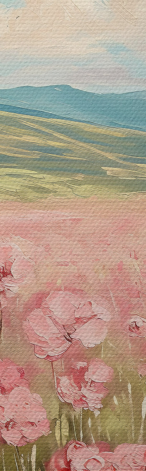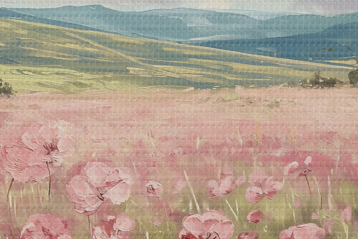 Foto Prado con flores rosas, montañas, paisaje natural, cielo azul con nubes, acrílico Nr r40232