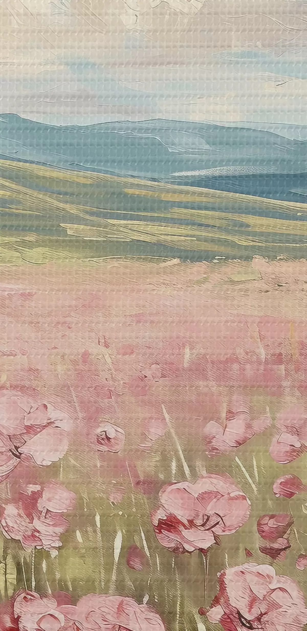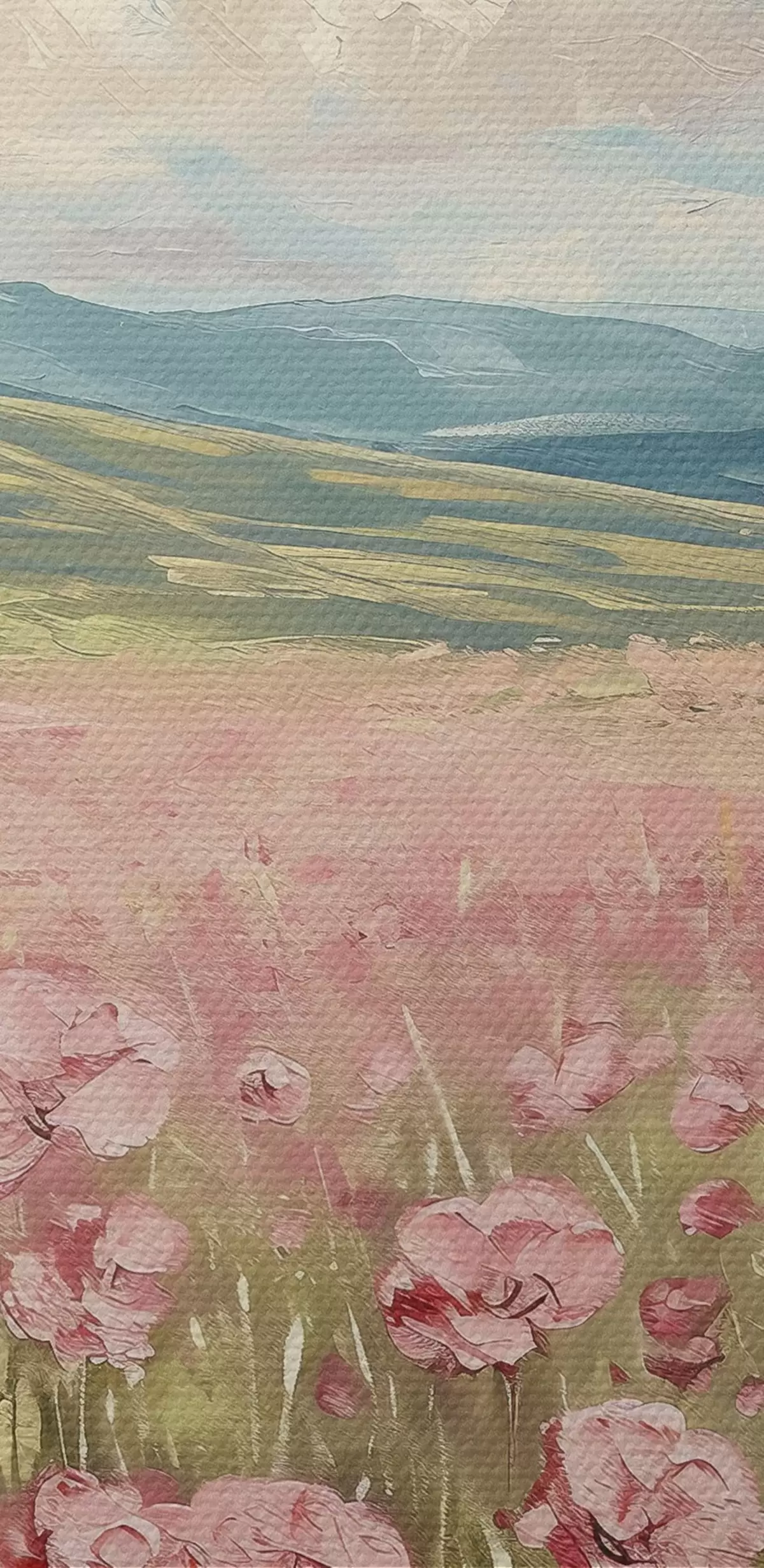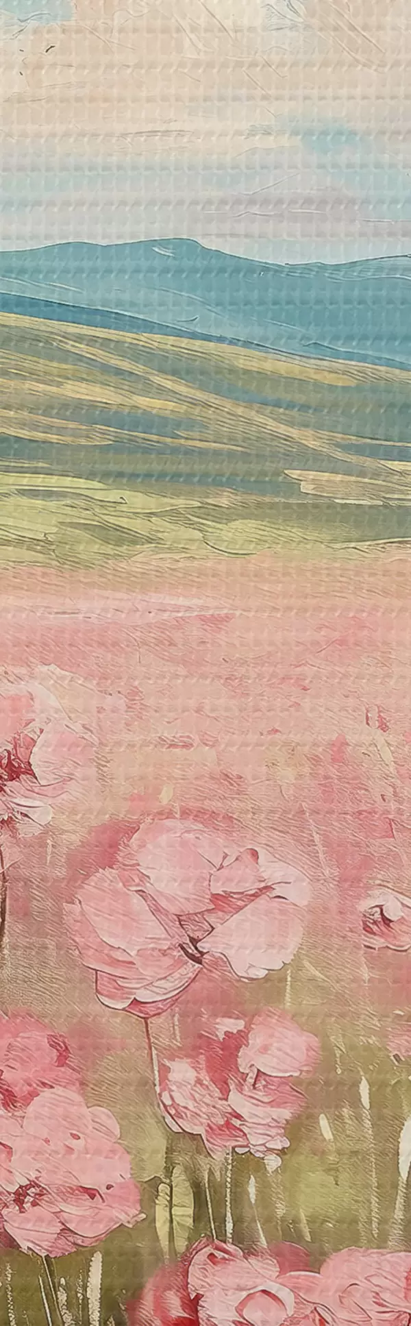 Foto Prado con flores rosas, montañas, paisaje natural, cielo azul con nubes, acrílico Nr r40232