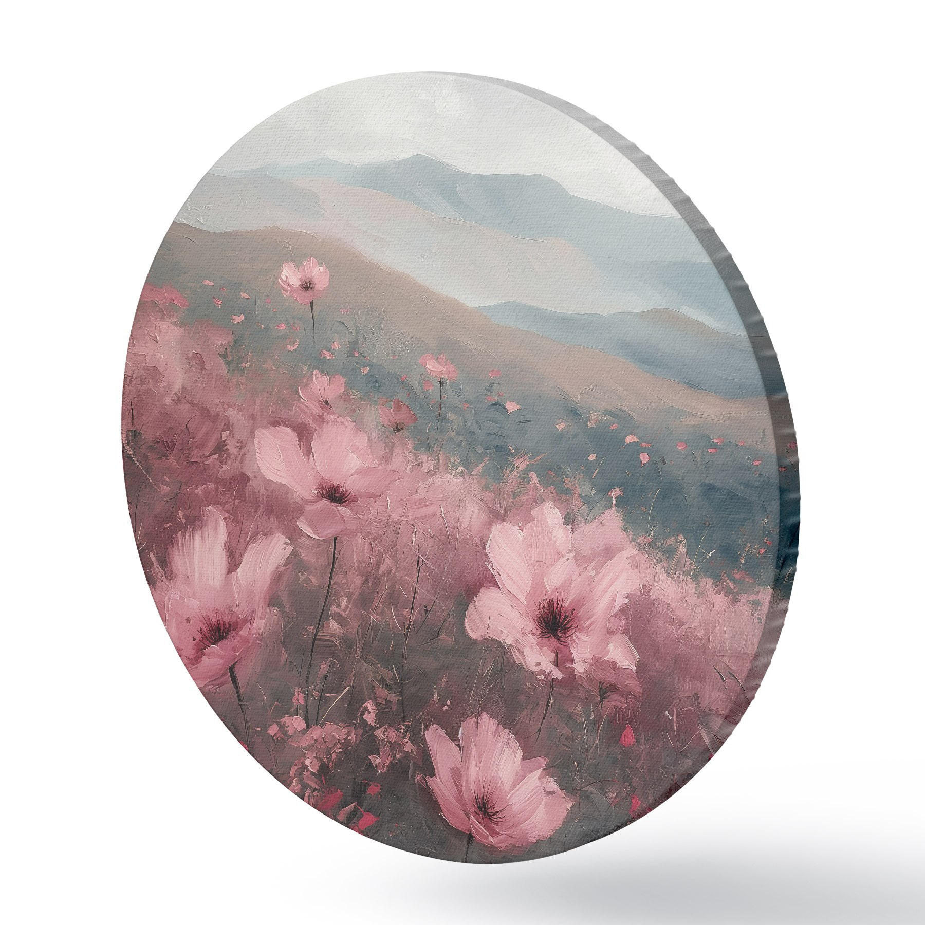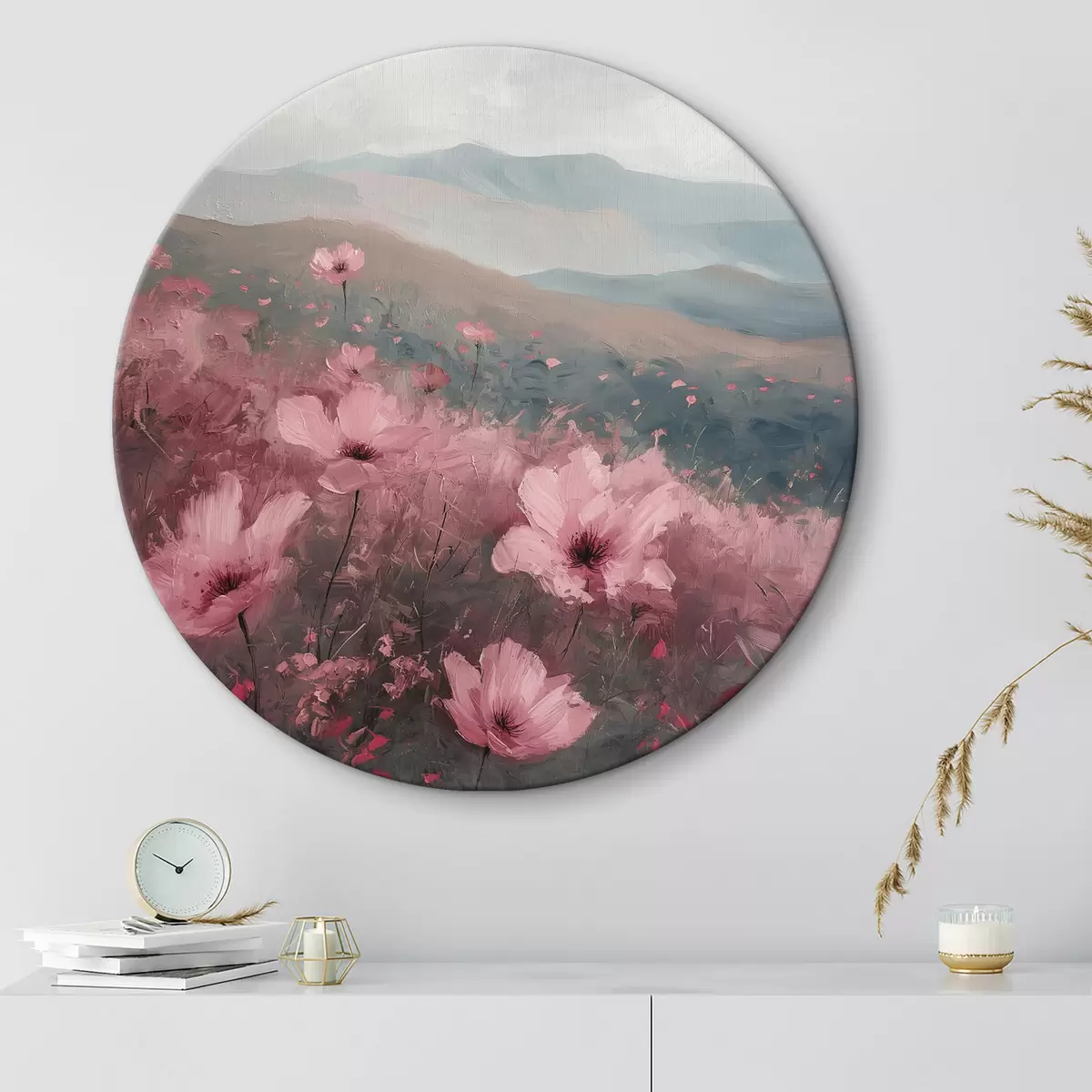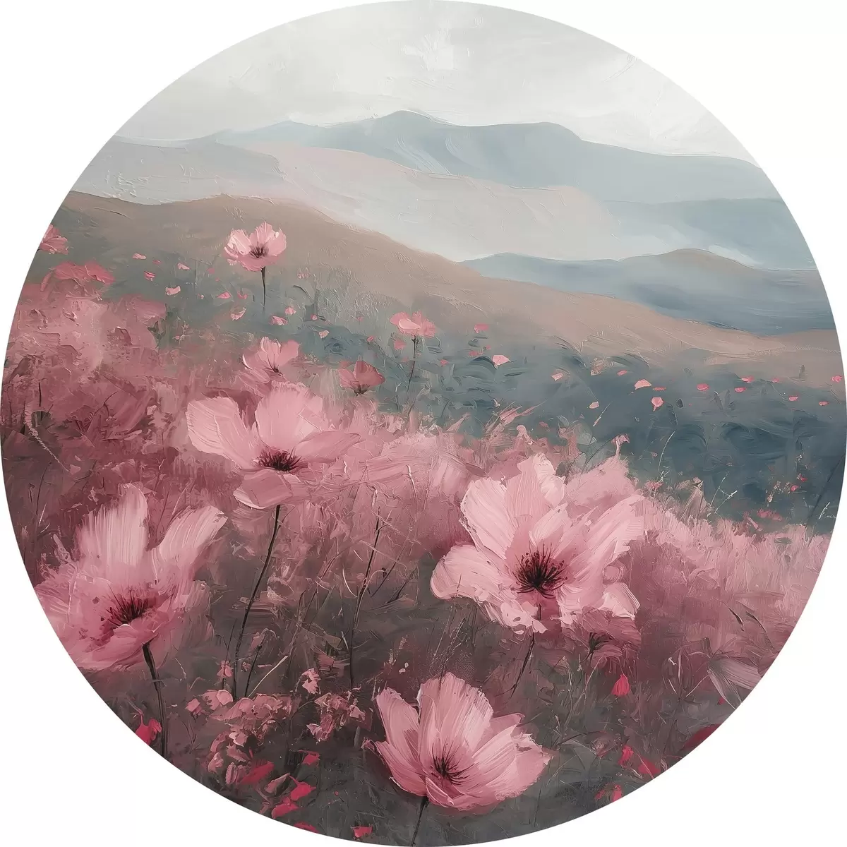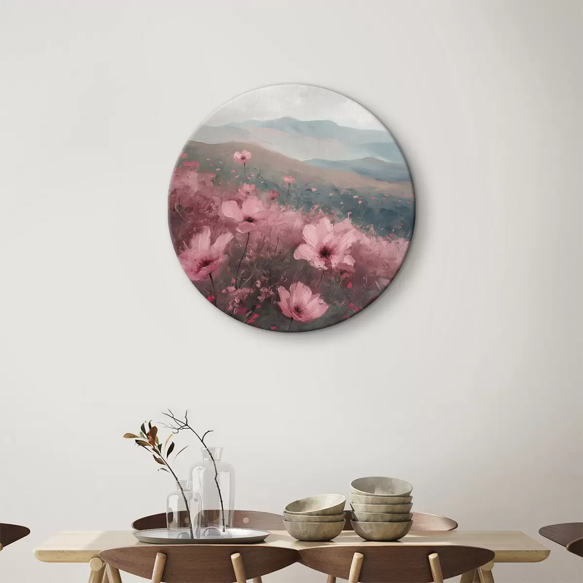 Cuadros redondos Flores rosas en el prado, paisaje natural, montañas, pintura al óleo, pinceladas vívidas r40233
