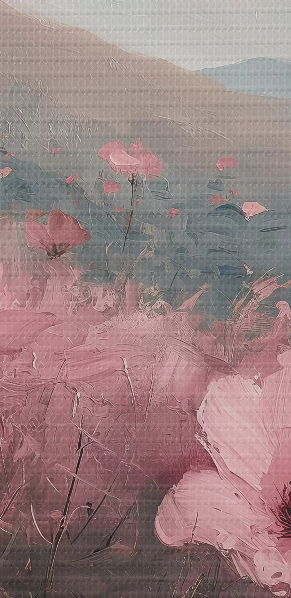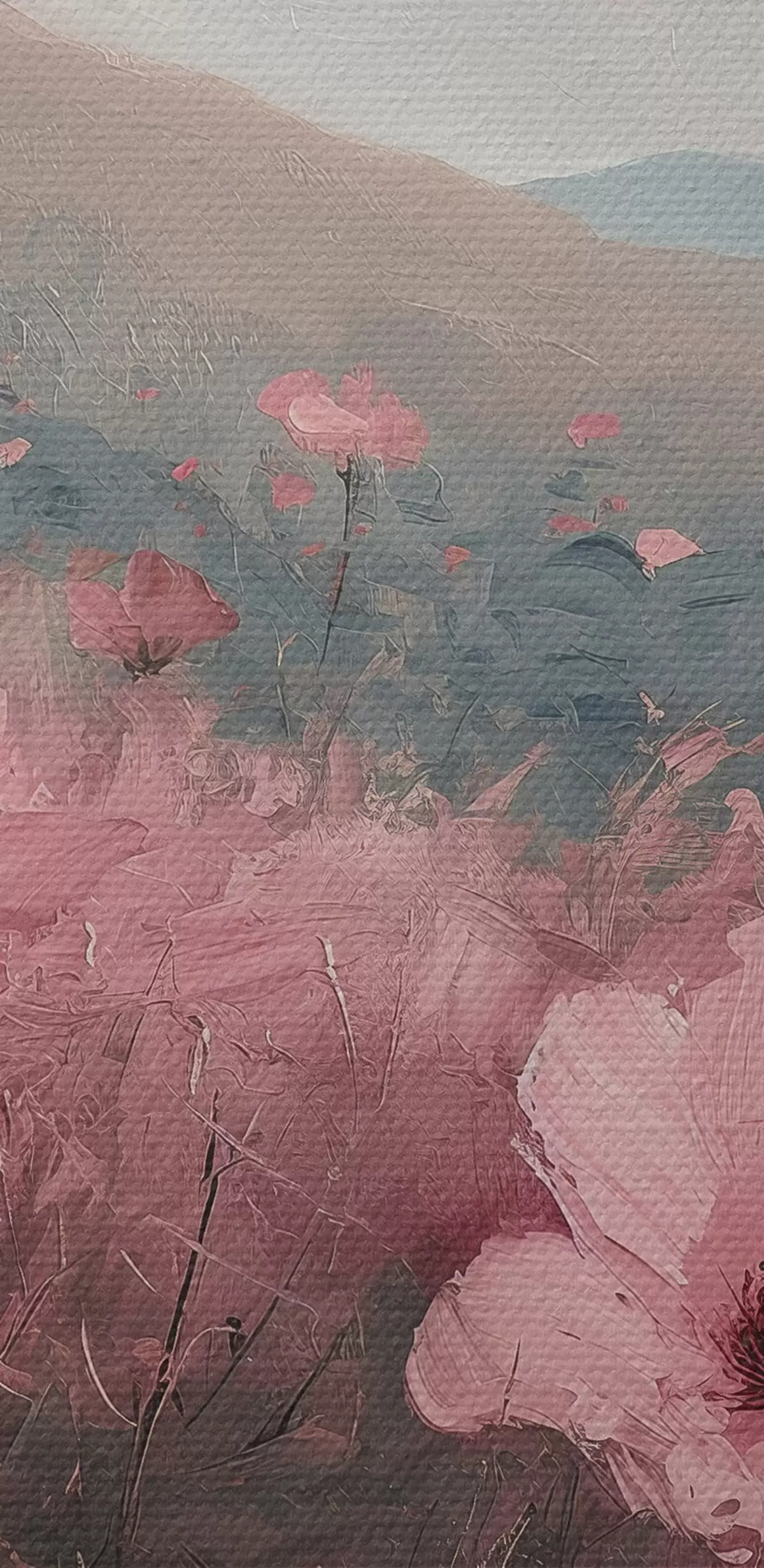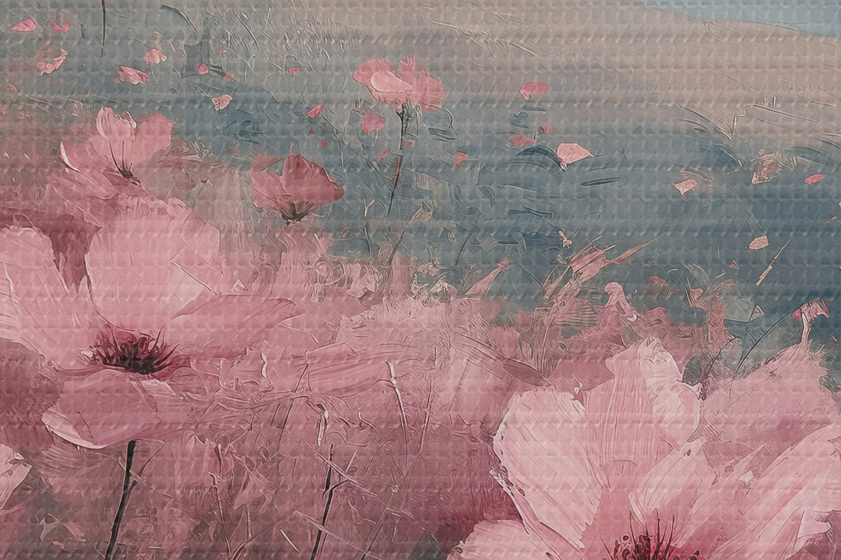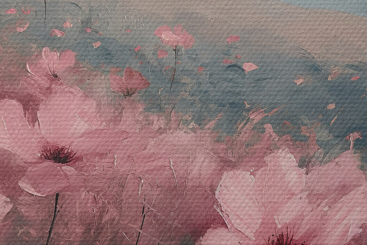 Foto Flores rosas en el prado, paisaje natural, montañas, pintura al óleo, pinceladas vívidas Nr r40233