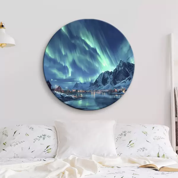 Cuadros redondos Noruega pueblo de invierno, aurora boreal, cielo nocturno r40300