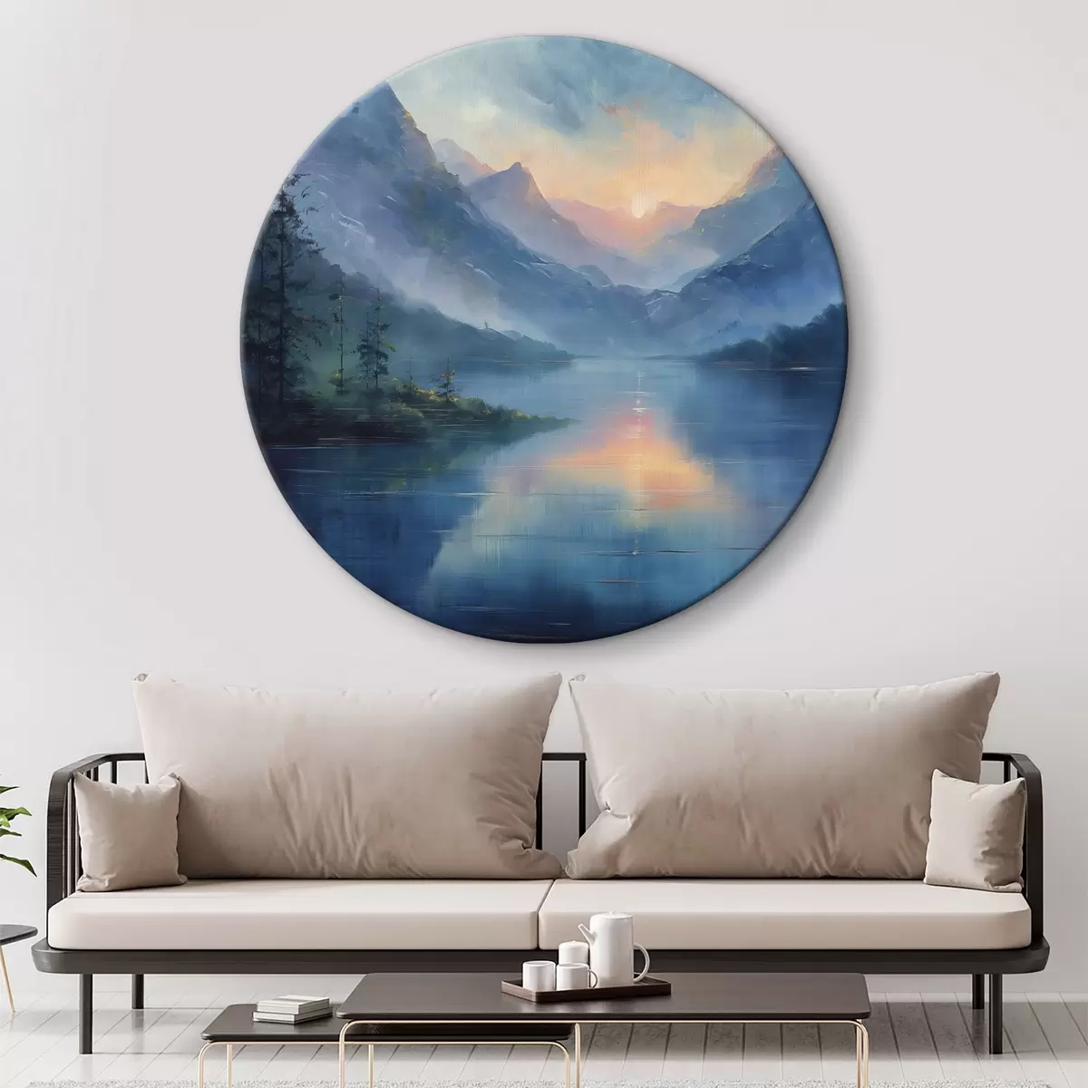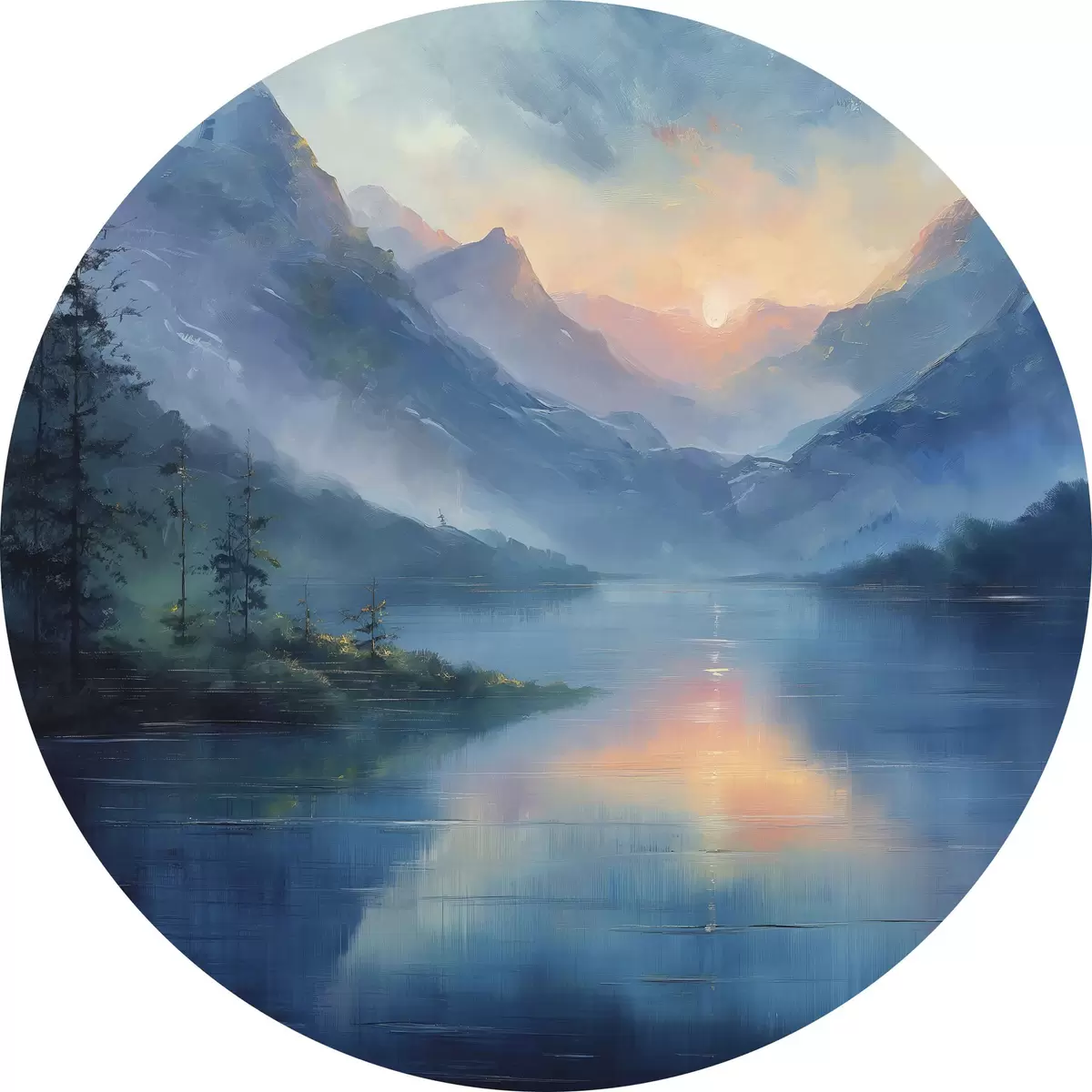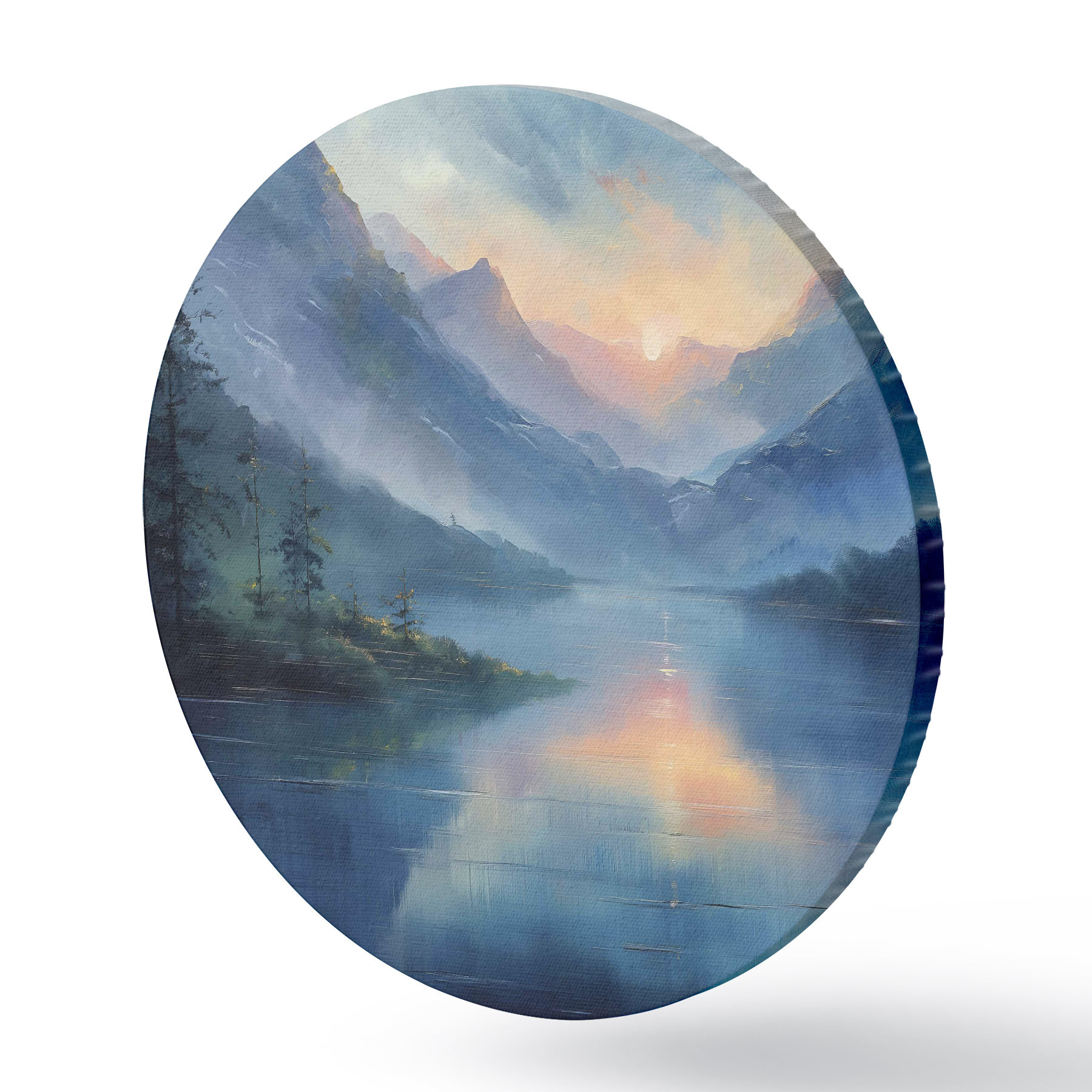 Cuadros redondos Puesta de sol en las montañas, niebla, río, bosque, pintura al óleo r40302