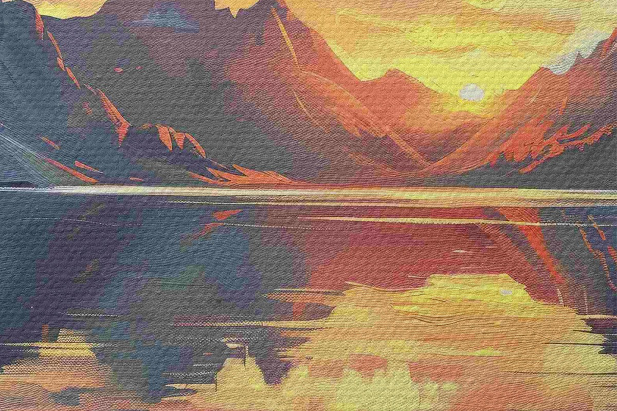 Foto Puesta de sol en las montañas, río, paisajes de naturaleza, pintura acrílica Nr r40306