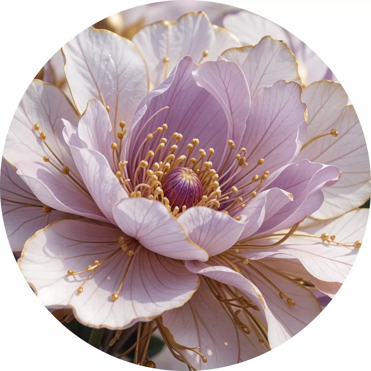 Cuadros redondos Un primer plano de una gran flor de peonía de color rosa pálido con pétalos delicados y un centro de color amarillo brillante r40384