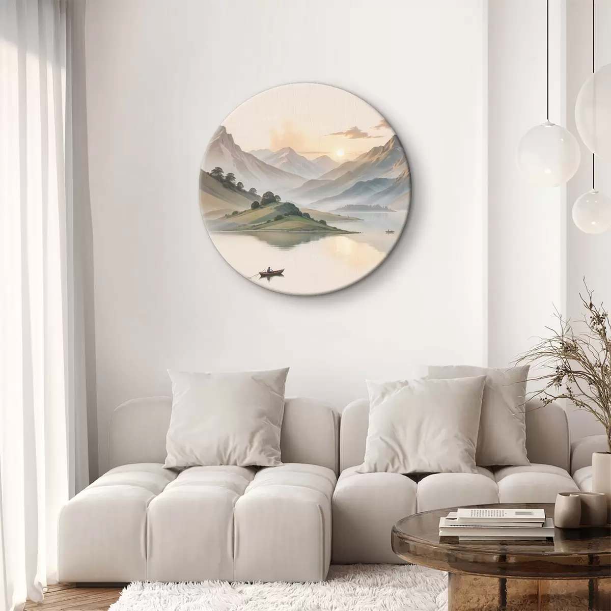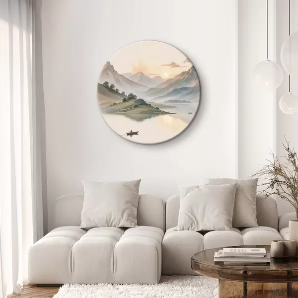 Cuadros redondos Un paisaje sereno con un lago que refleja las montañas en el fondo con un pequeño bote en el agua tranquila r40391