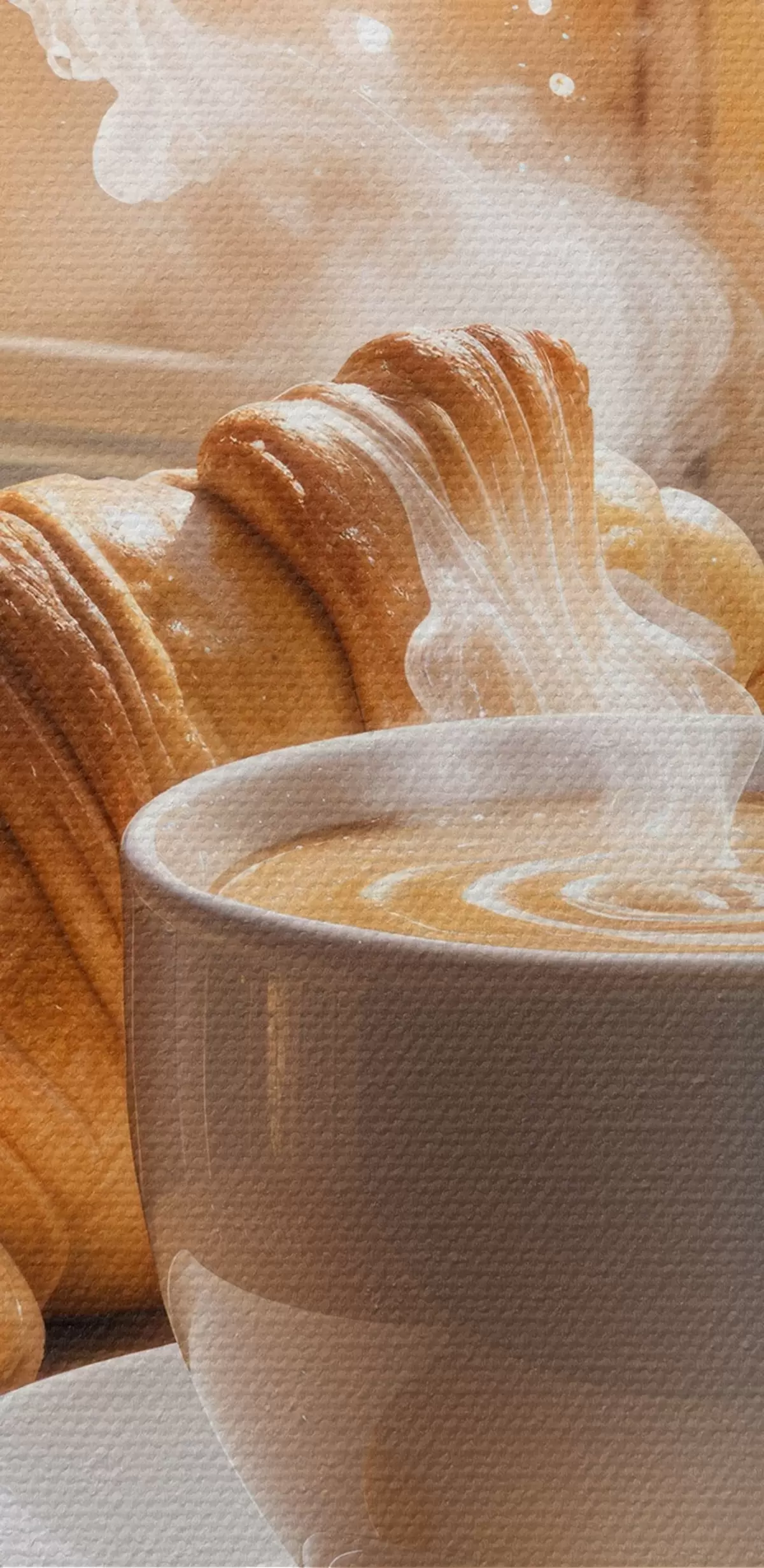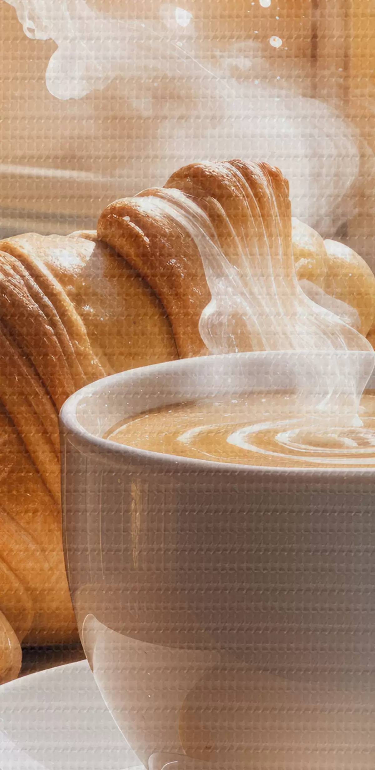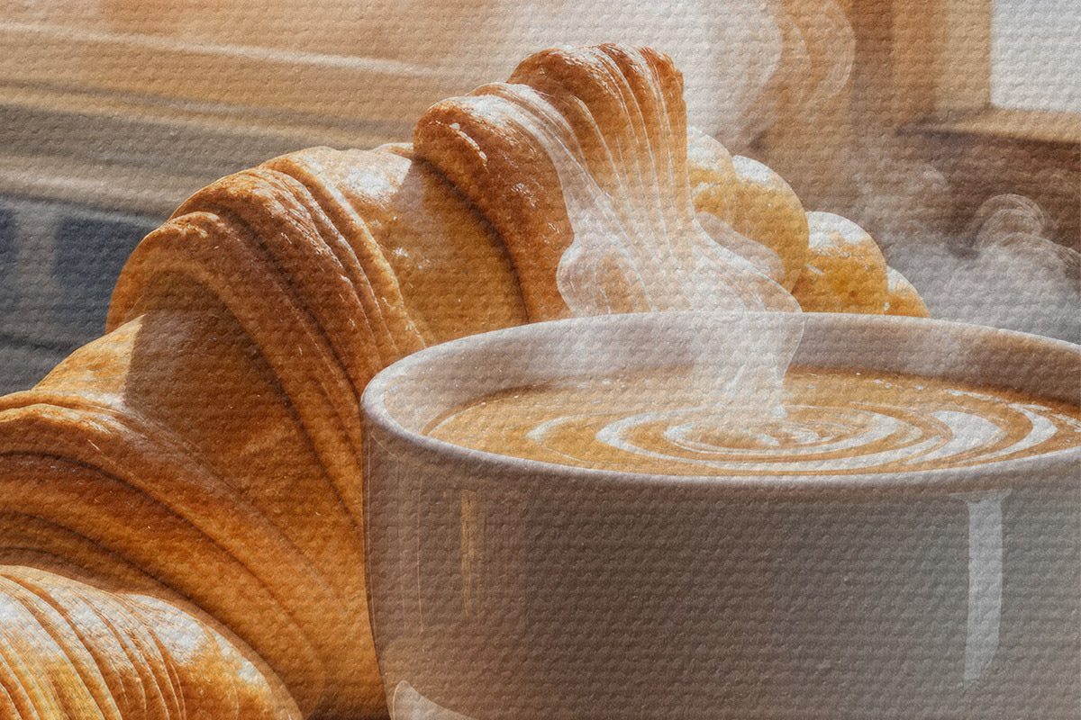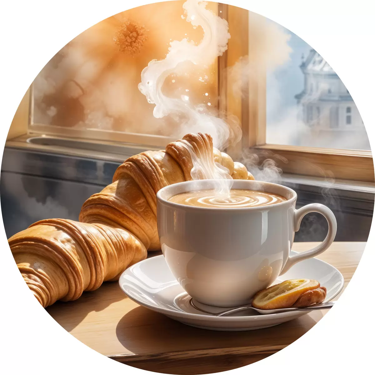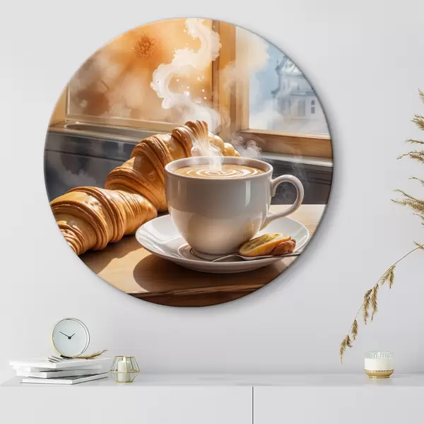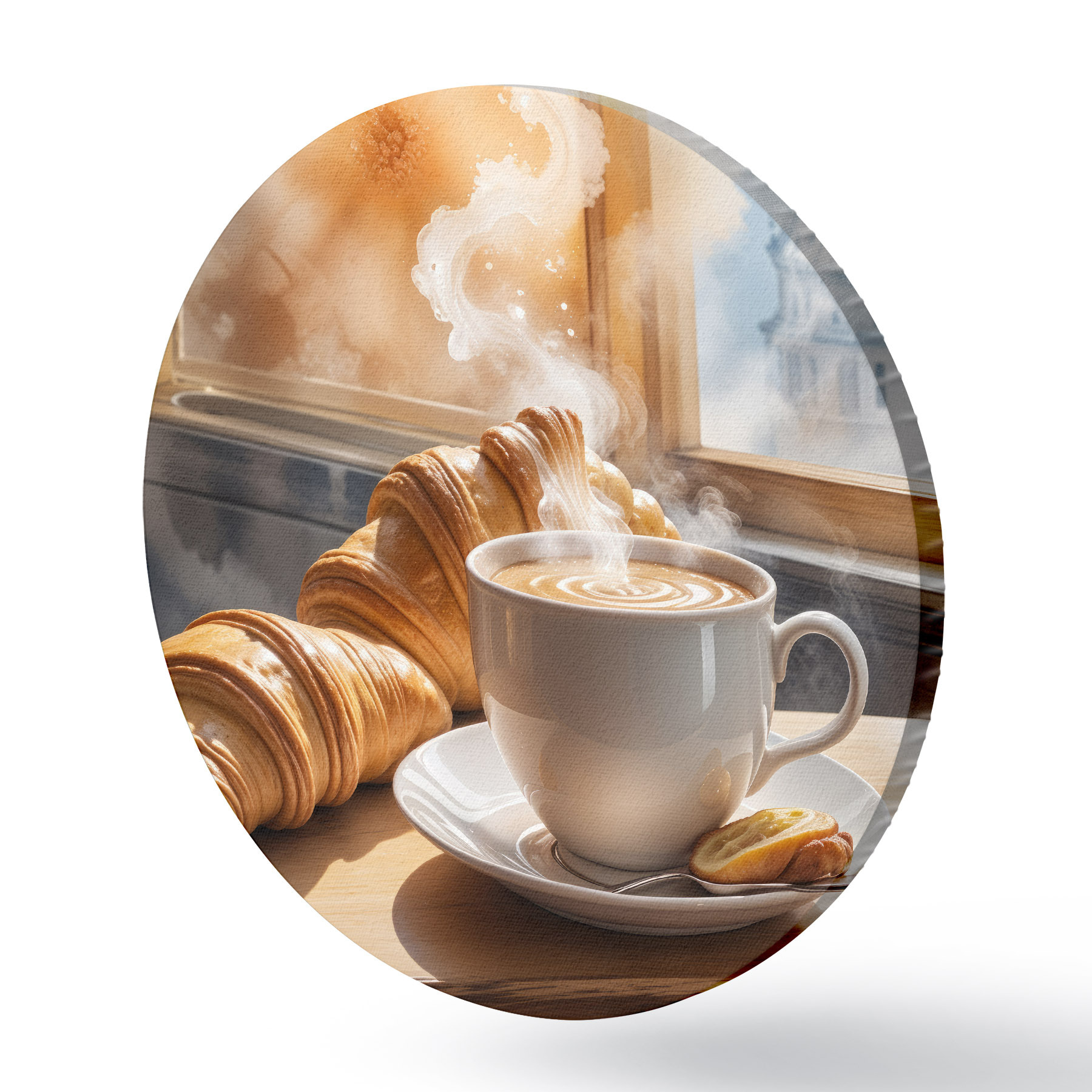Cuadros redondos Una taza de café caliente con vapor elevándose, colocada sobre una mesa junto a un croissant, con vista a un edificio histórico r40405