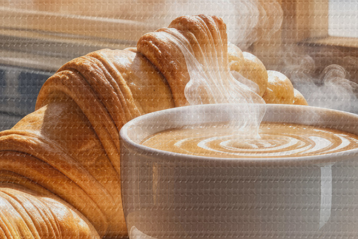 Foto Una taza de café caliente con vapor elevándose, colocada sobre una mesa junto a un croissant, con vista a un edificio histórico Nr r40405