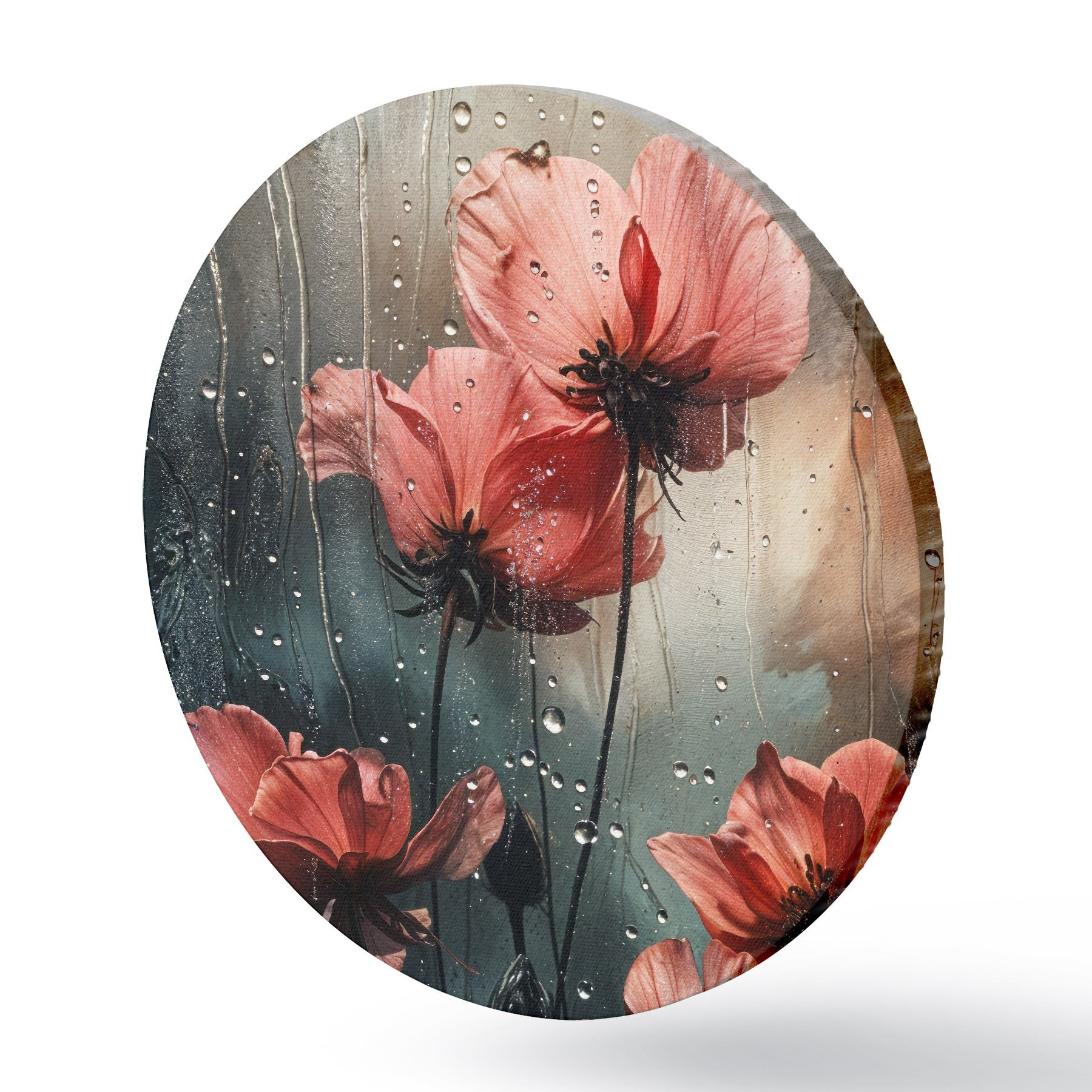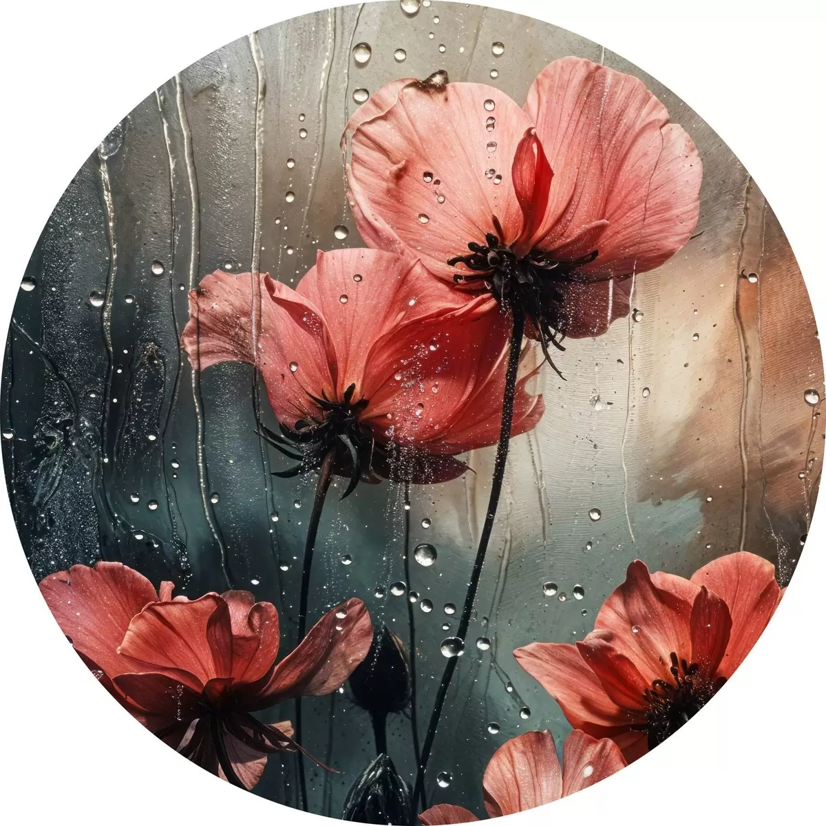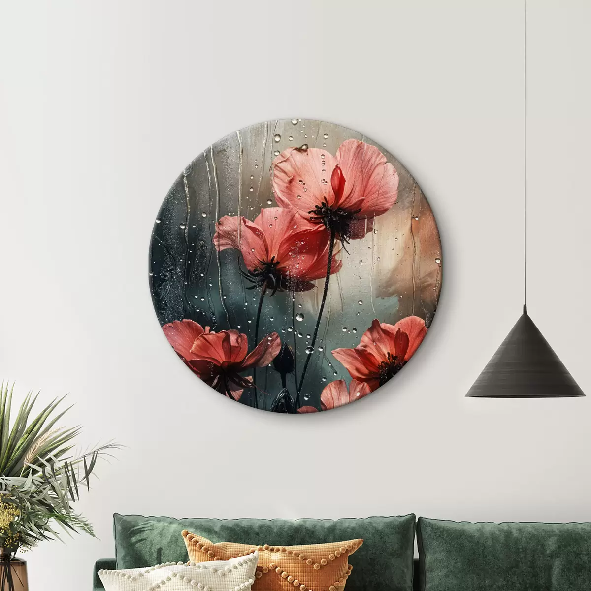 Cuadros redondos Flores rojas con gotas de agua sobre un fondo borroso r40412