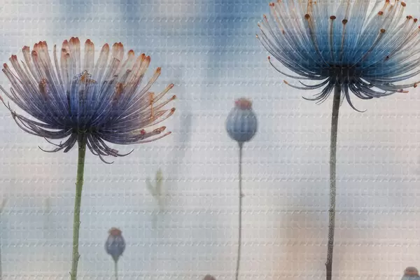 Cuadros redondos Flores altas de color púrpura similares a dientes de león con fondo borroso, creando una atmósfera serena y de ensueño r40414