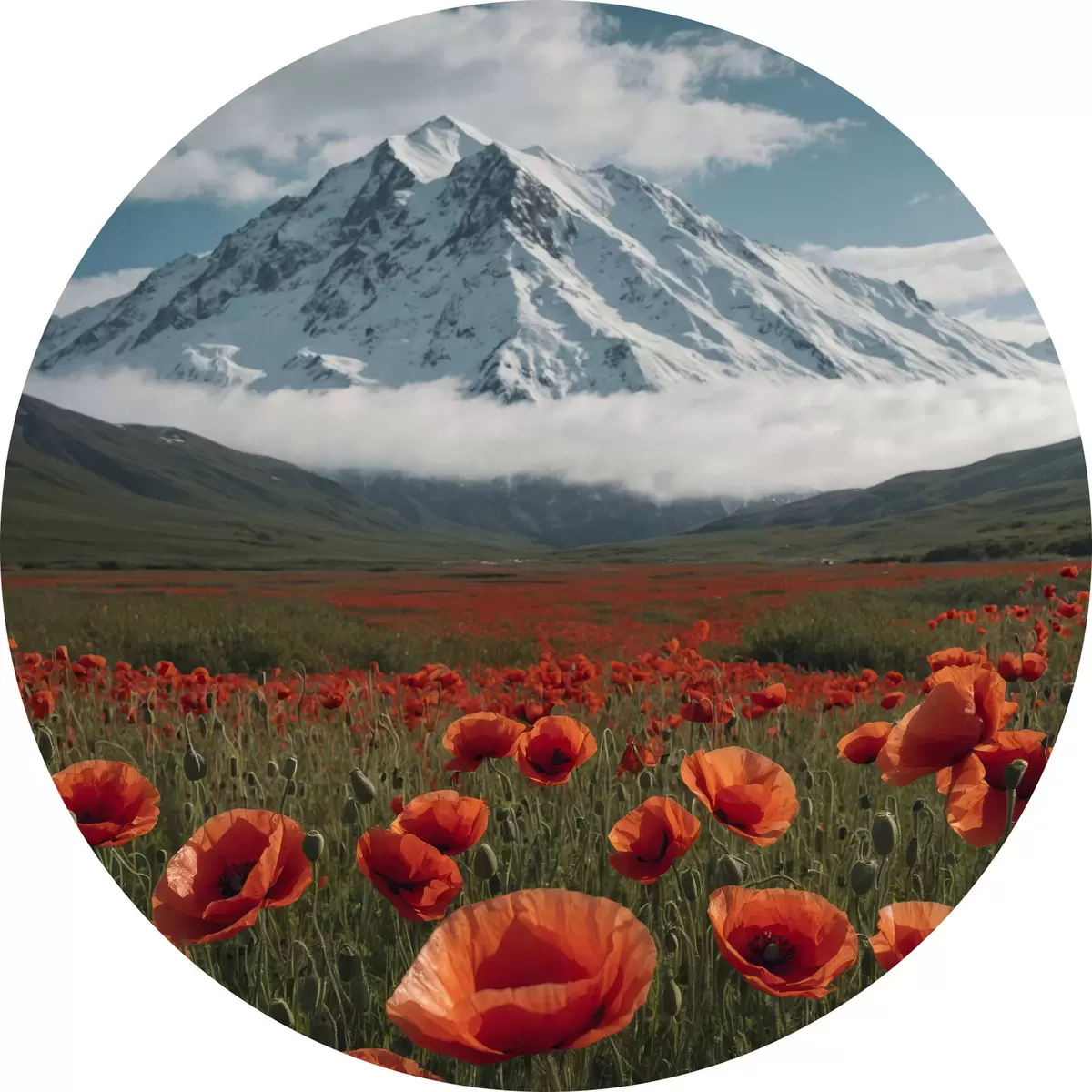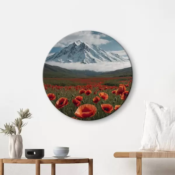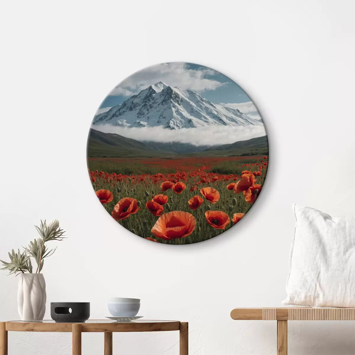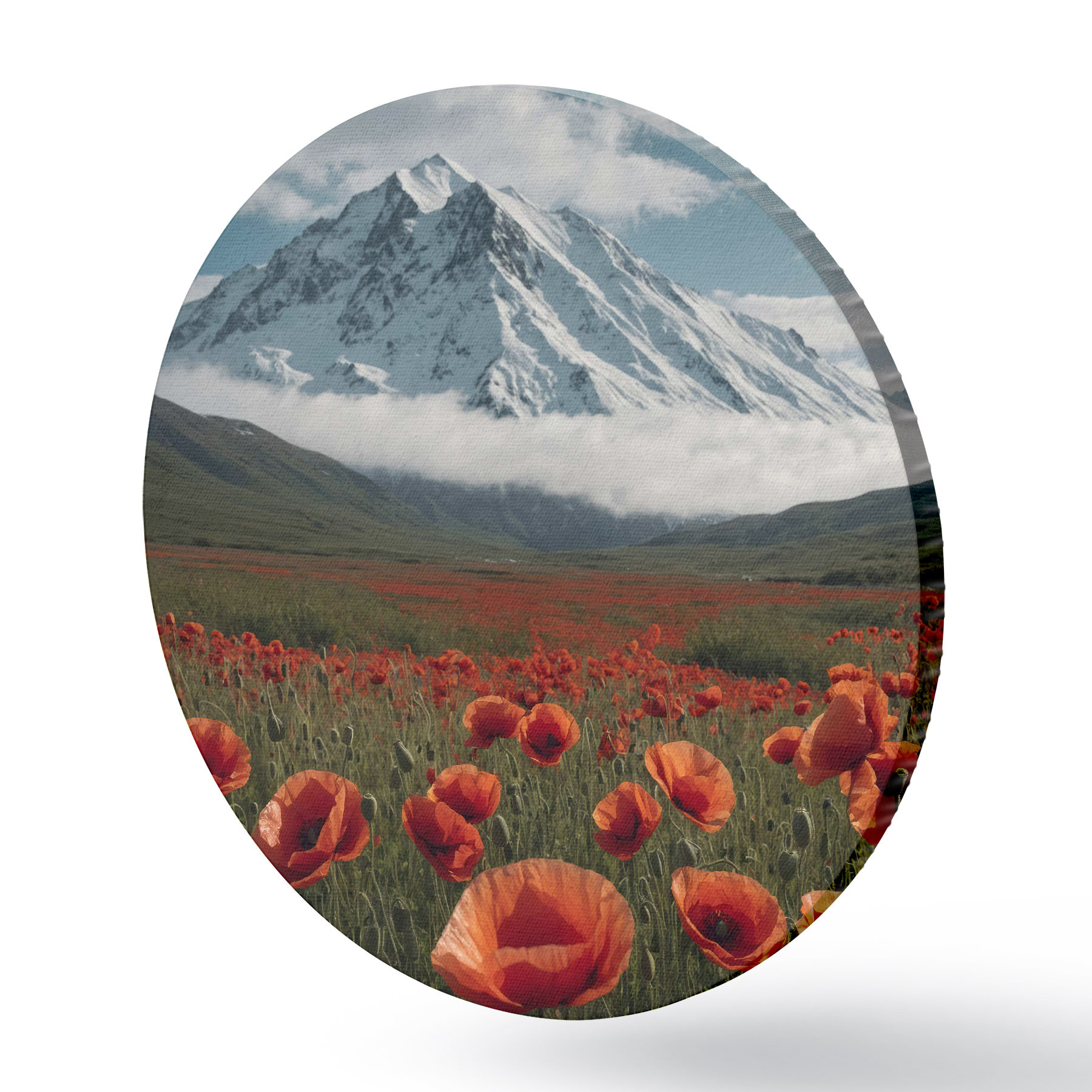 Cuadros redondos Un campo de amapolas sobre un fondo de montañas nevadas r40469