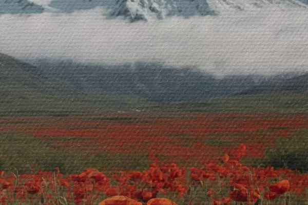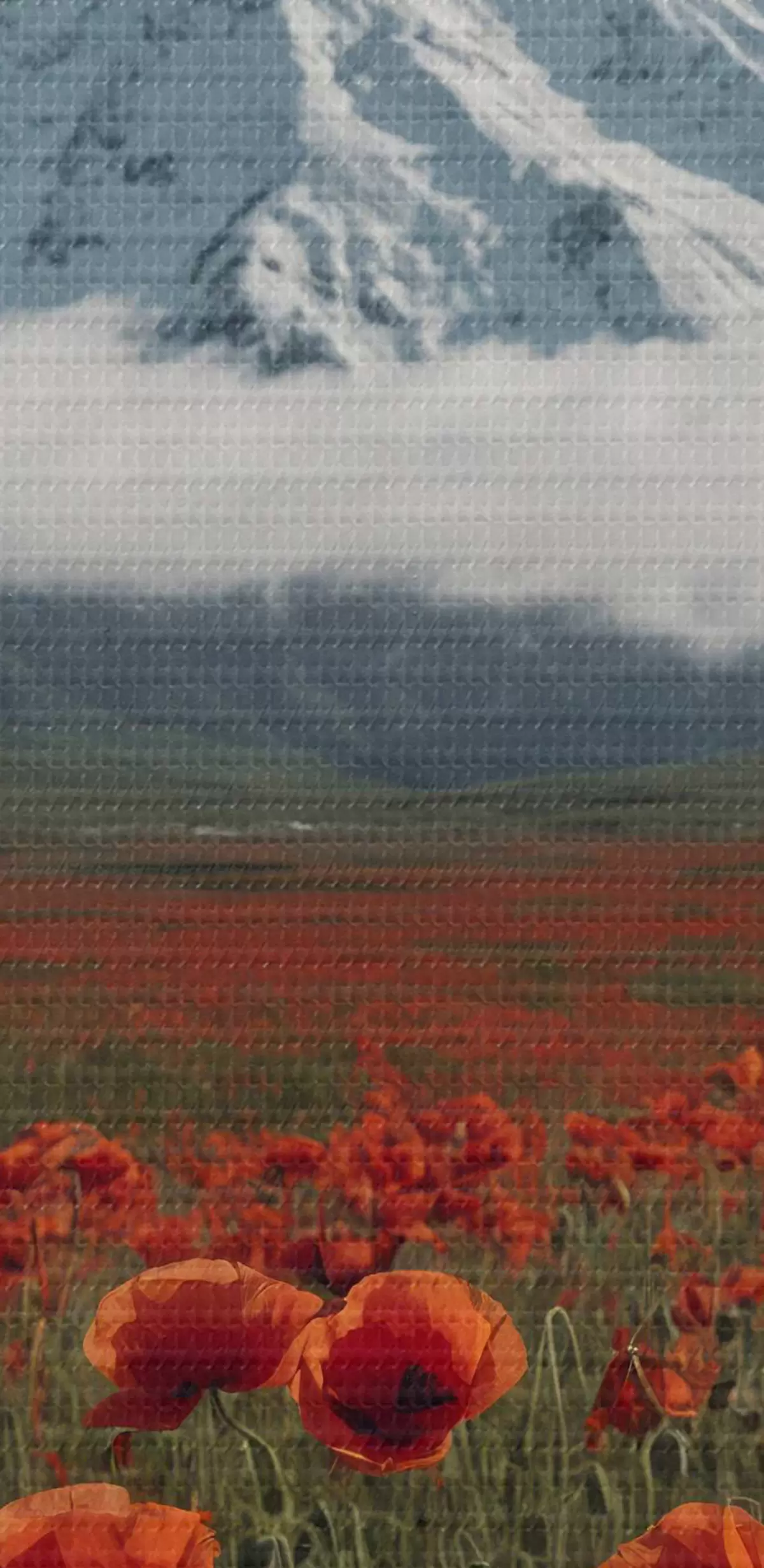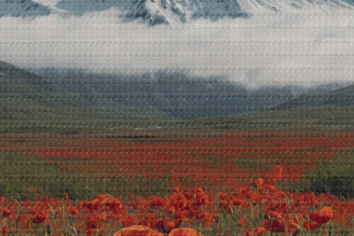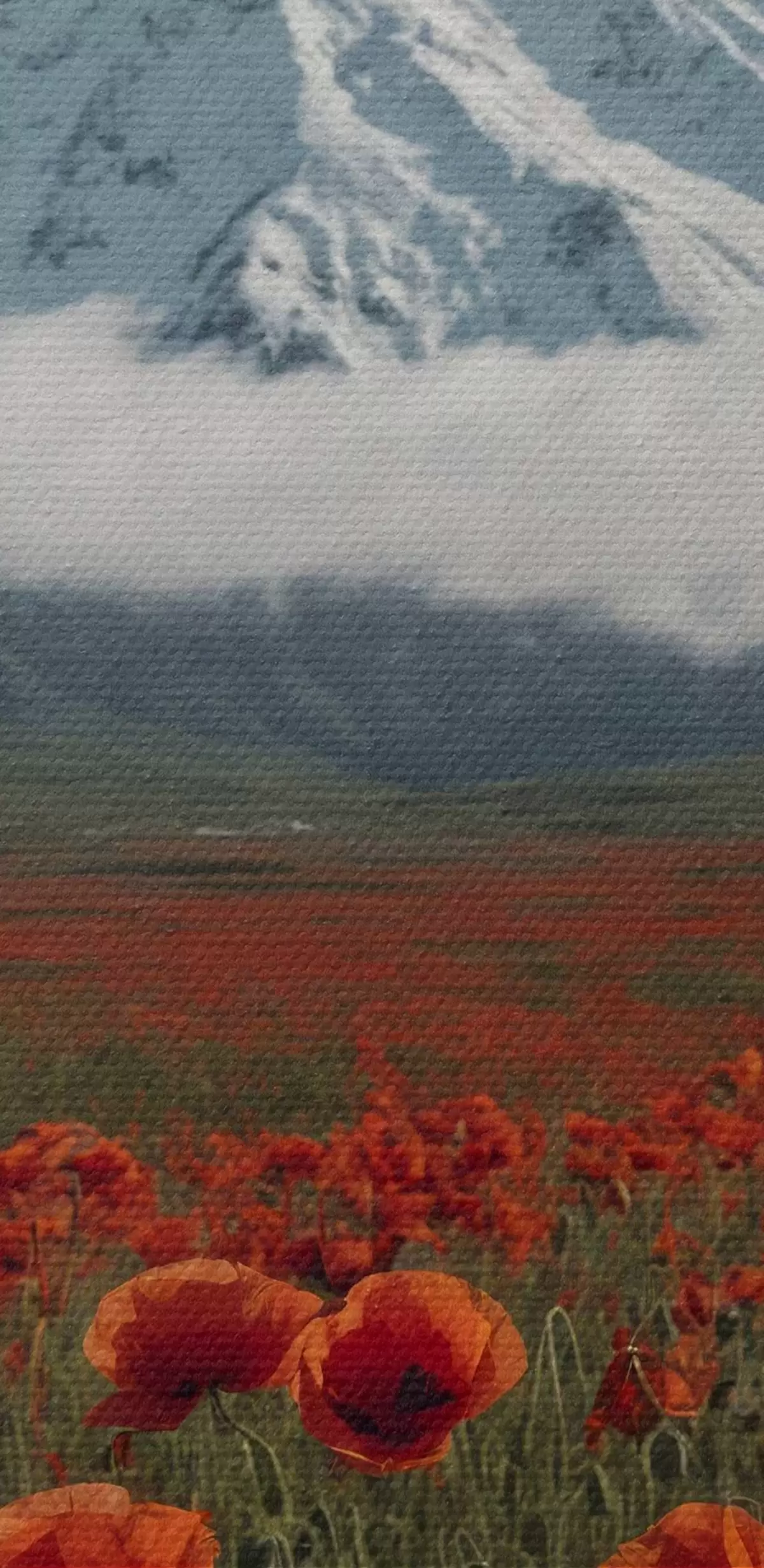Foto Un campo de amapolas sobre un fondo de montañas nevadas Nr r40469