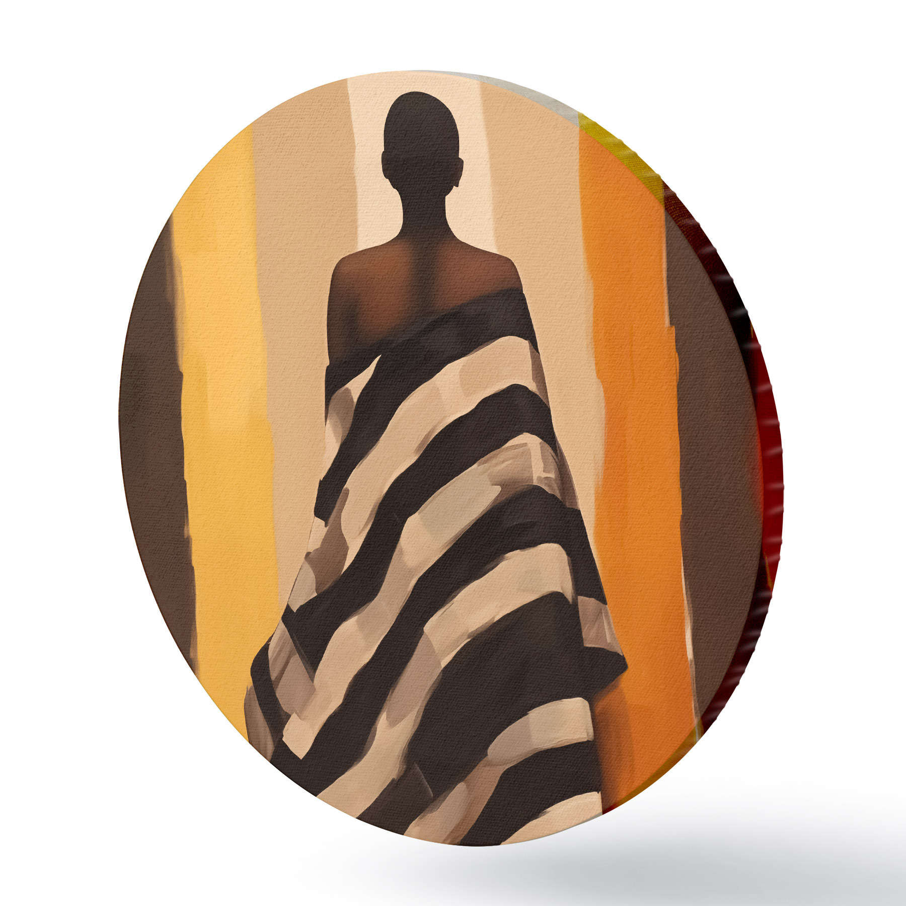 Cuadros redondos Silueta de una mujer afroamericana con una capa de rayas sobre un fondo con rayas verticales, negro, beige, amarillo, rojo, marrón r40487