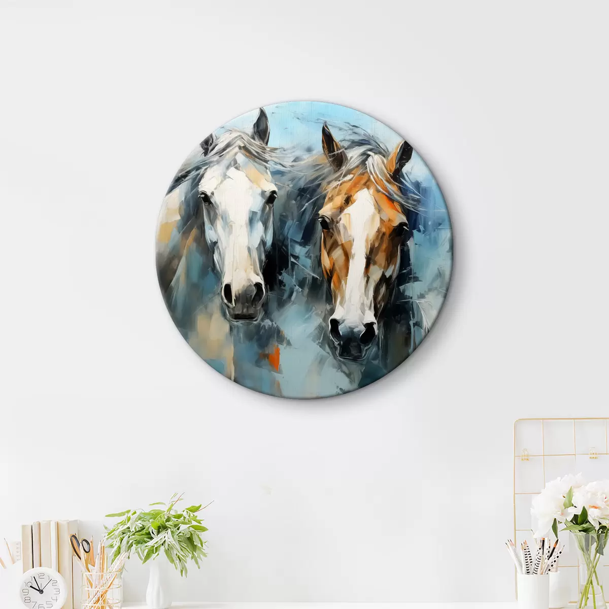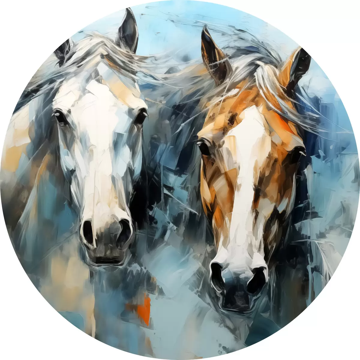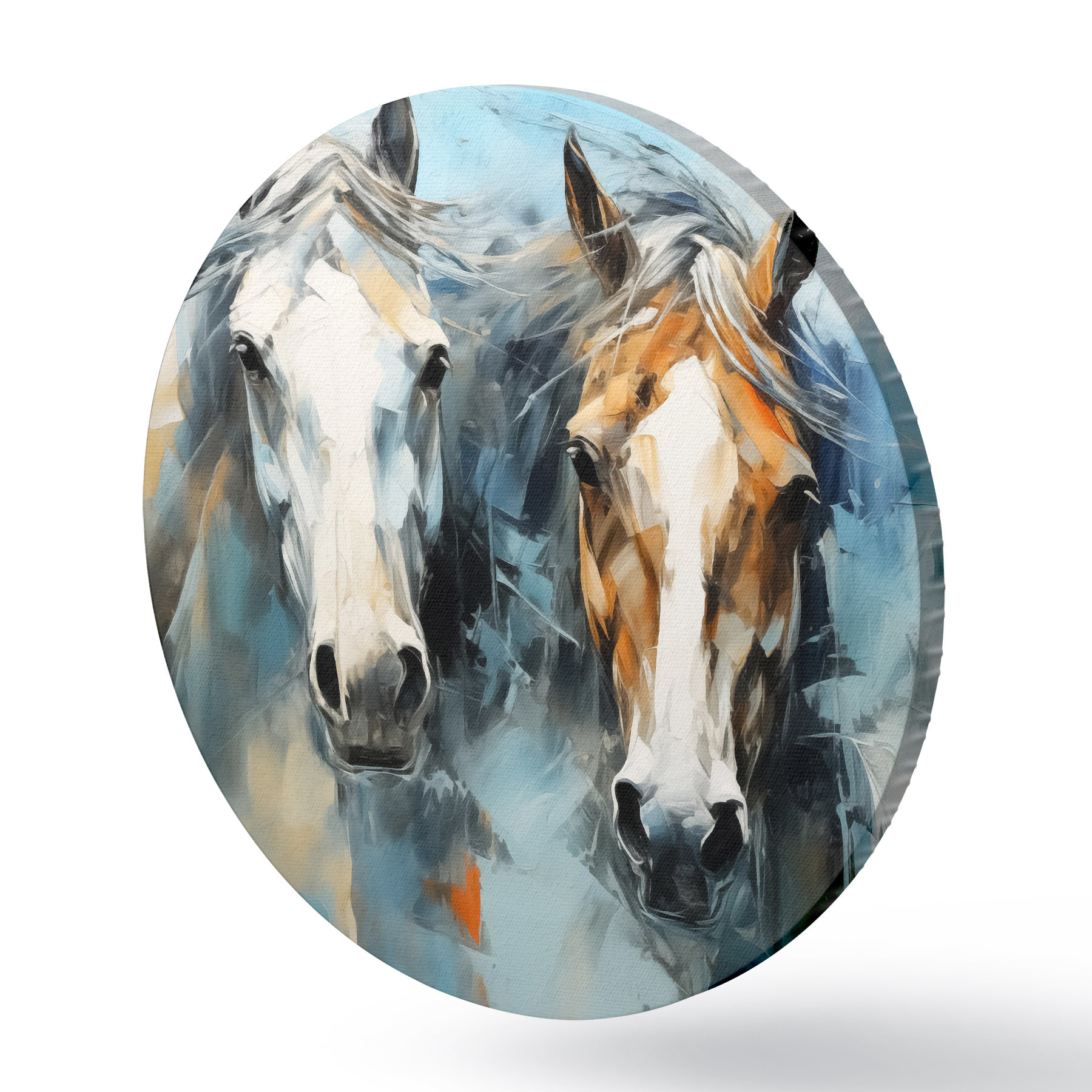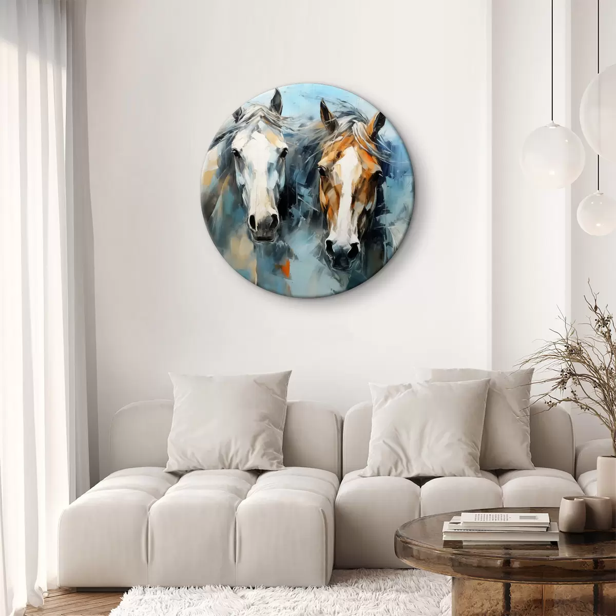 Cuadros redondos Cuadro abstracto de caballos, color blanco, azul y marrón r40493