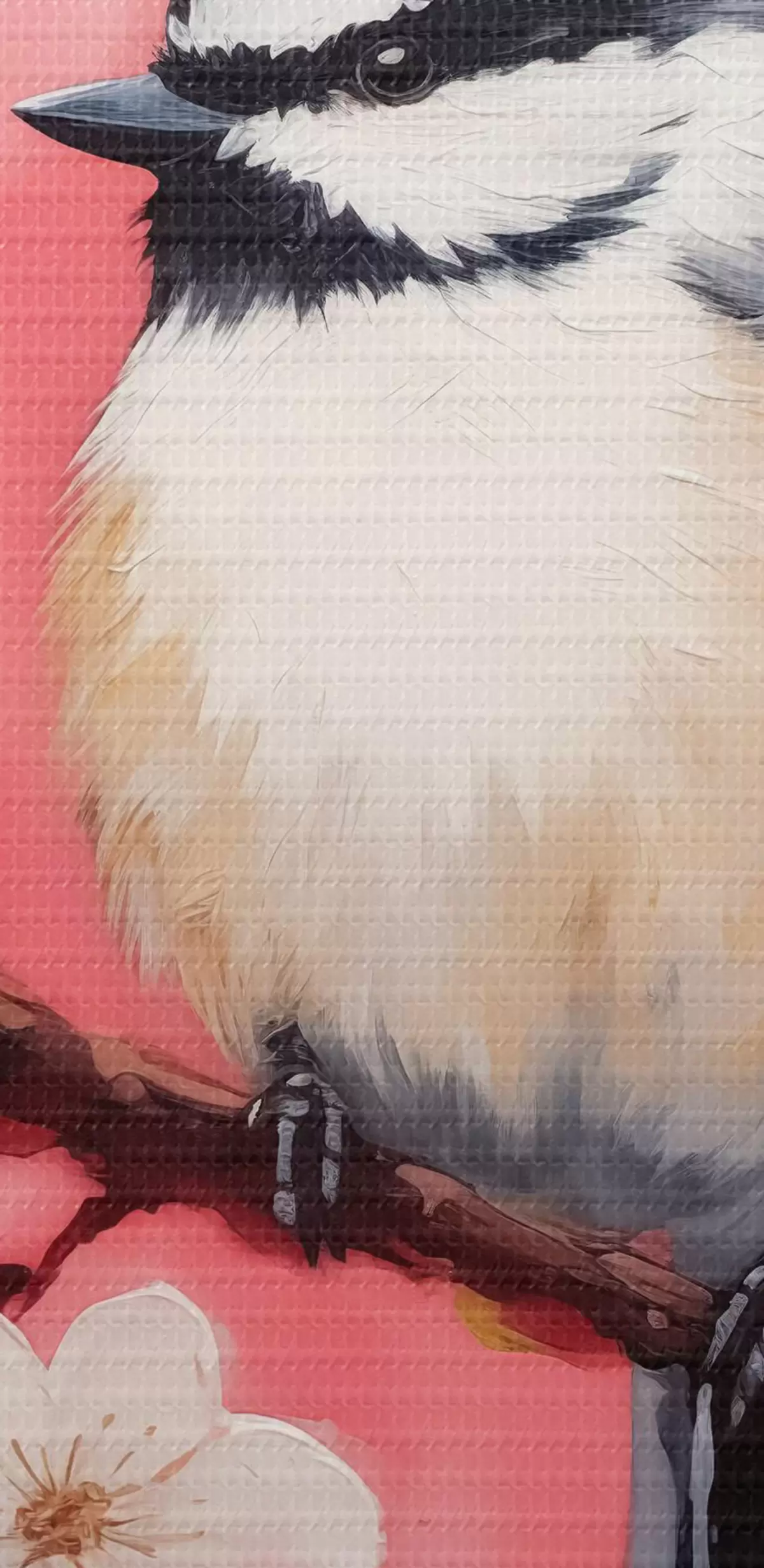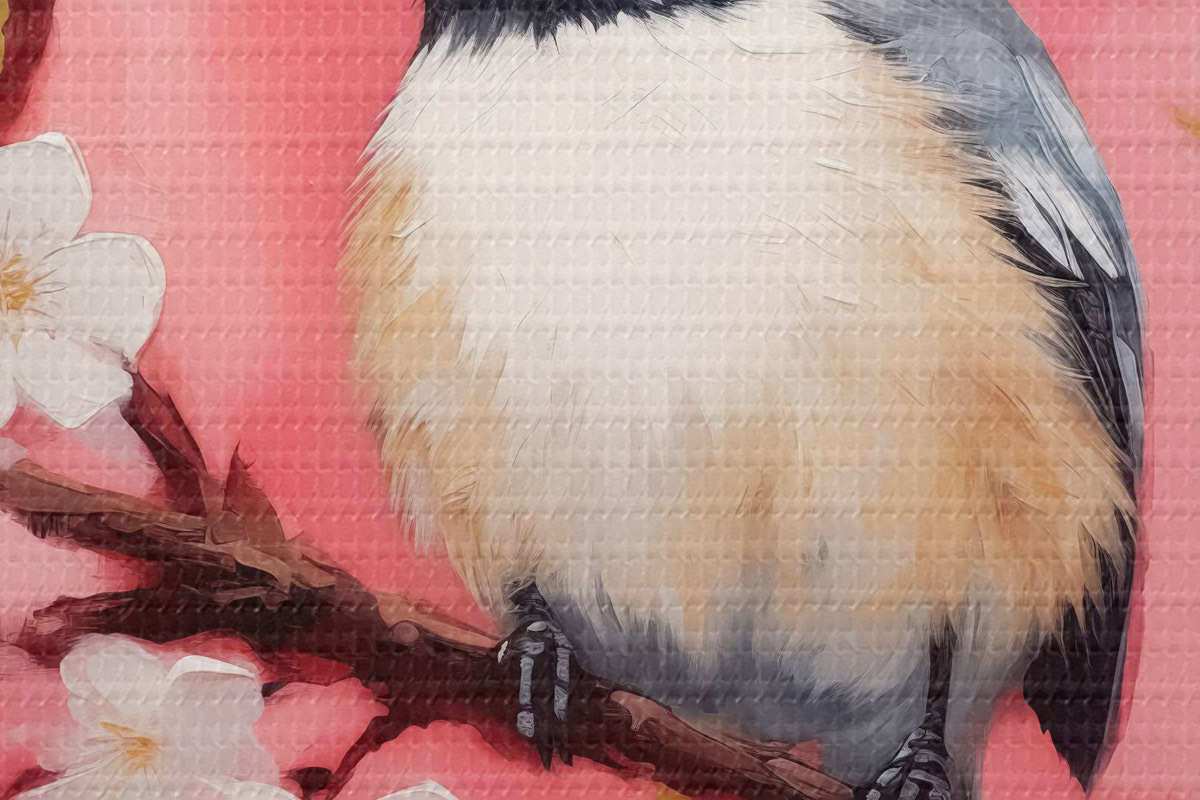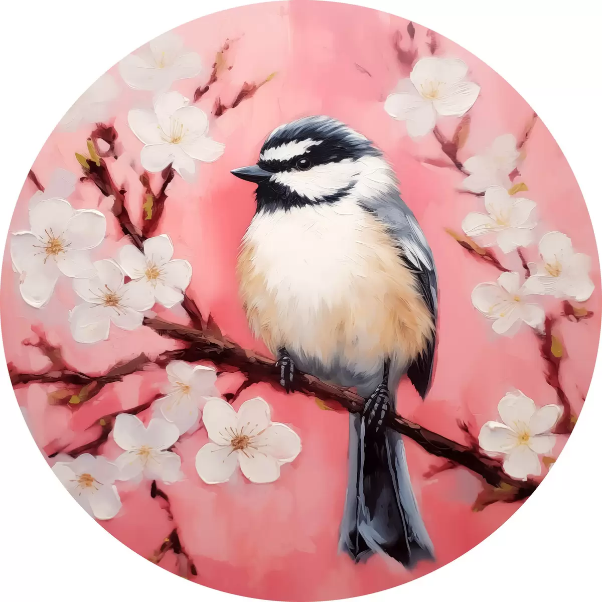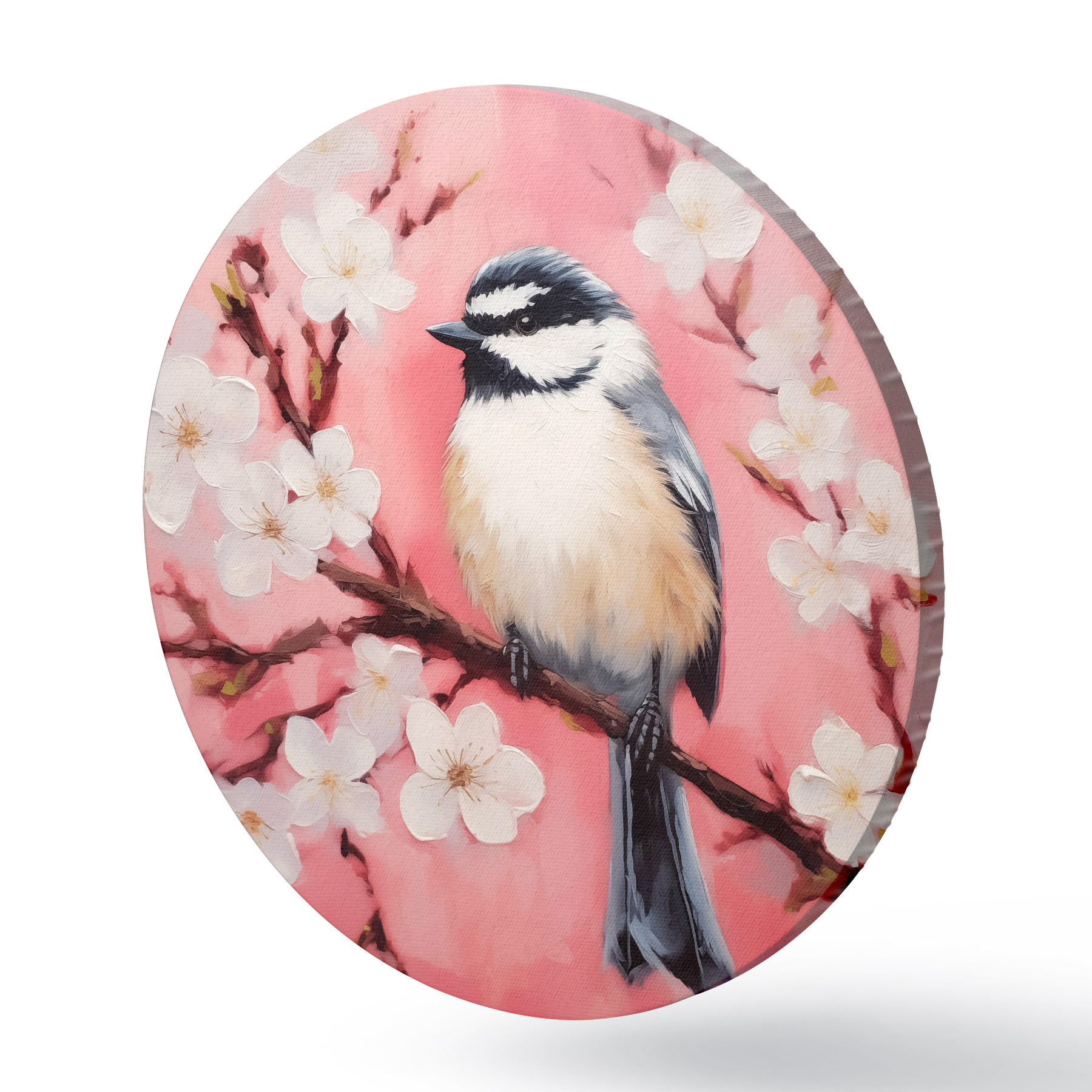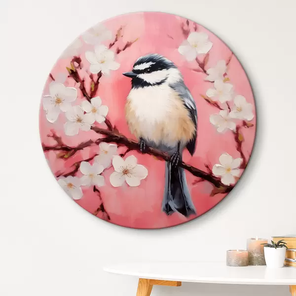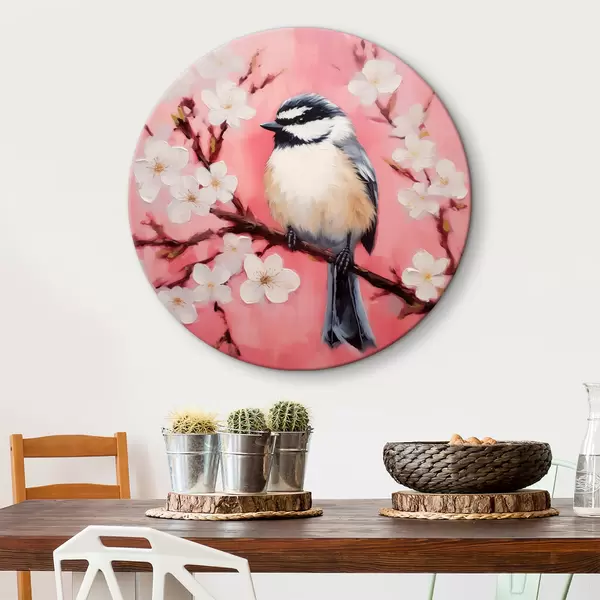 Cuadros redondos El pájaro está sentado en una rama con flores blancas sobre fondo rosa r40517