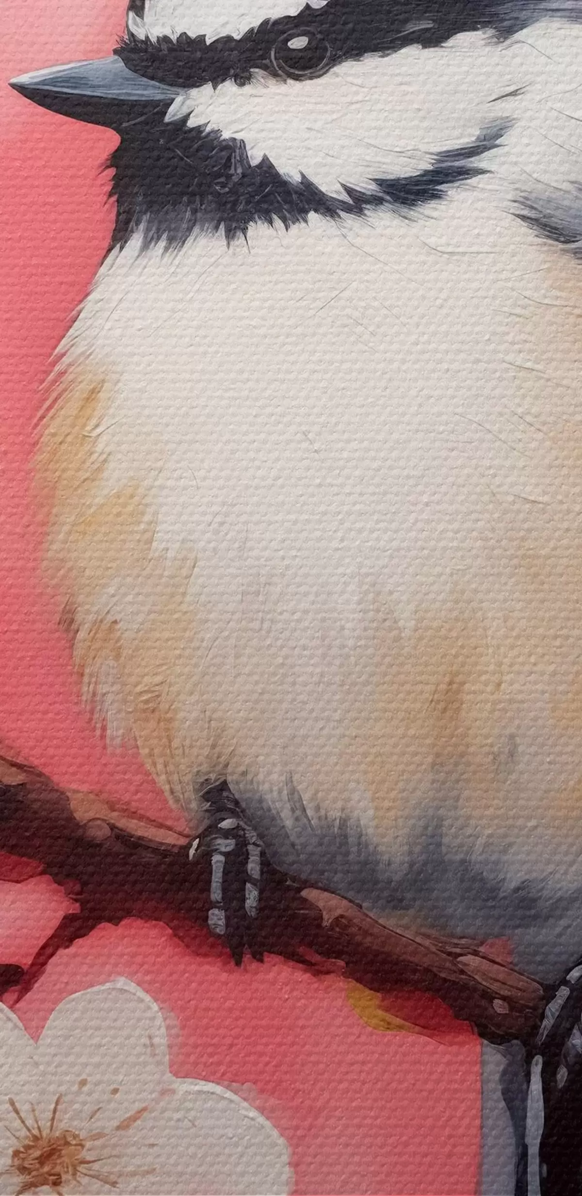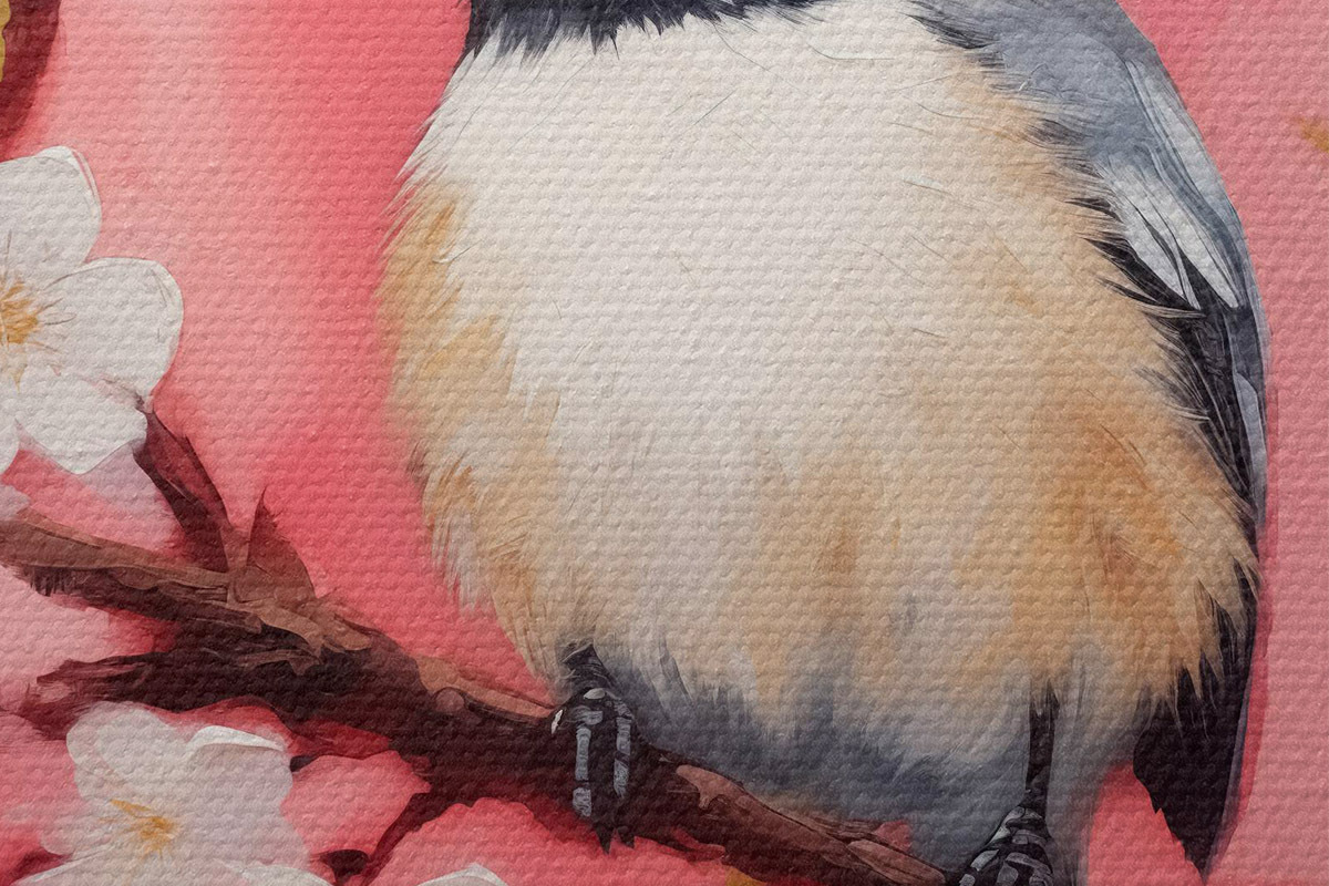 Foto El pájaro está sentado en una rama con flores blancas sobre fondo rosa Nr r40517