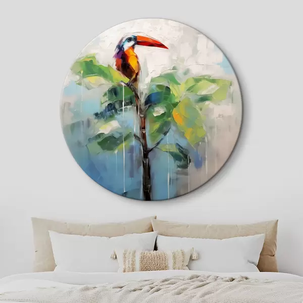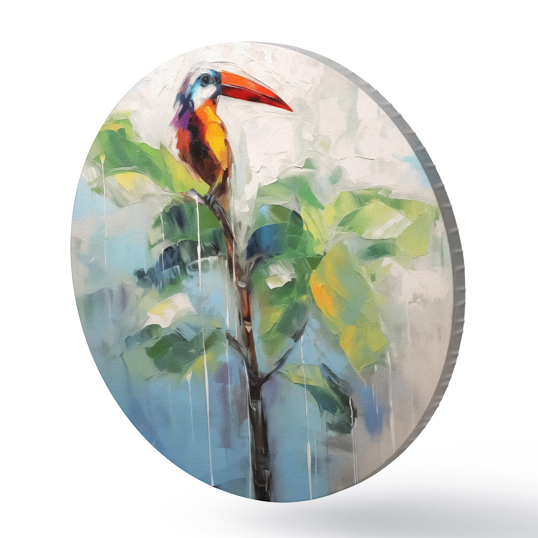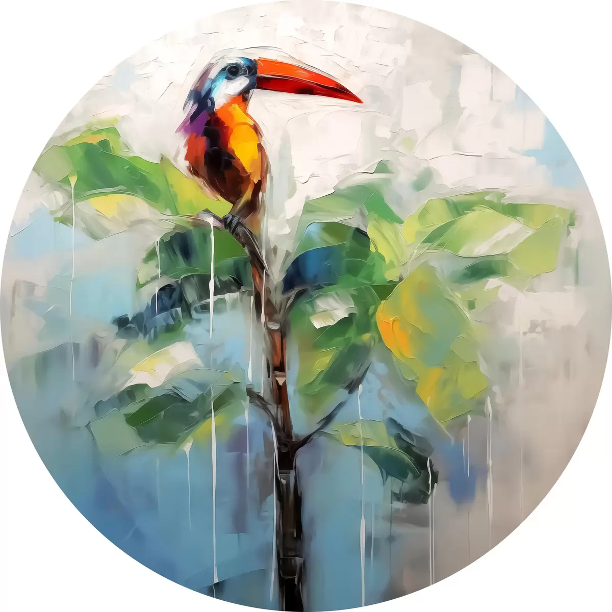 Cuadros redondos Abstracto tucán sentado en la palma de plátano, de color verde, azul, gris, amarillo, rojo r40518