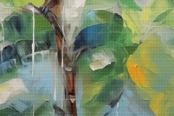 Foto Abstracto tucán sentado en la palma de plátano, de color verde, azul, gris, amarillo, rojo Nr r40518