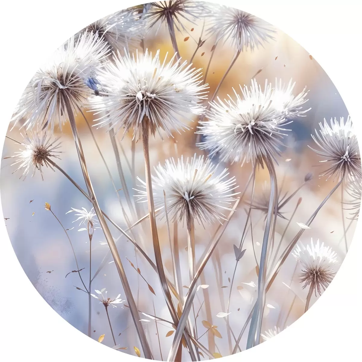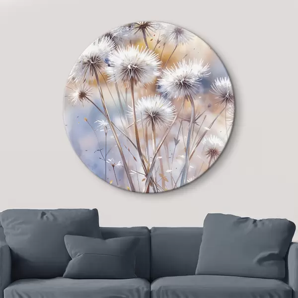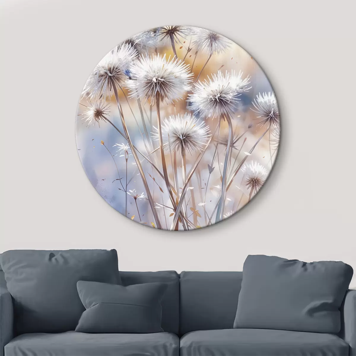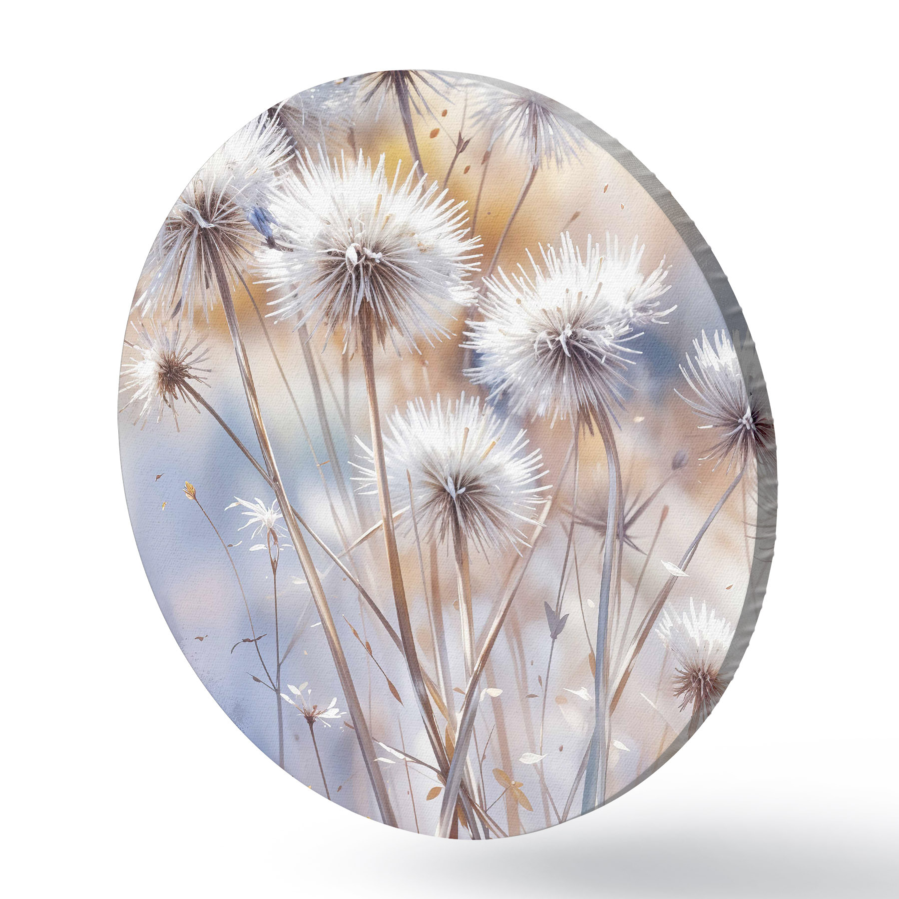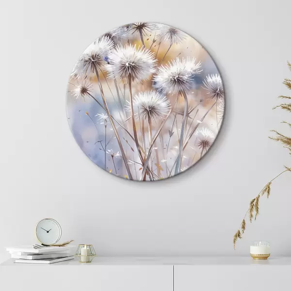 Cuadros redondos Esponjosas flores blancas de diente de león sobre fondo borroso de acuarela con iluminación cálida r40541