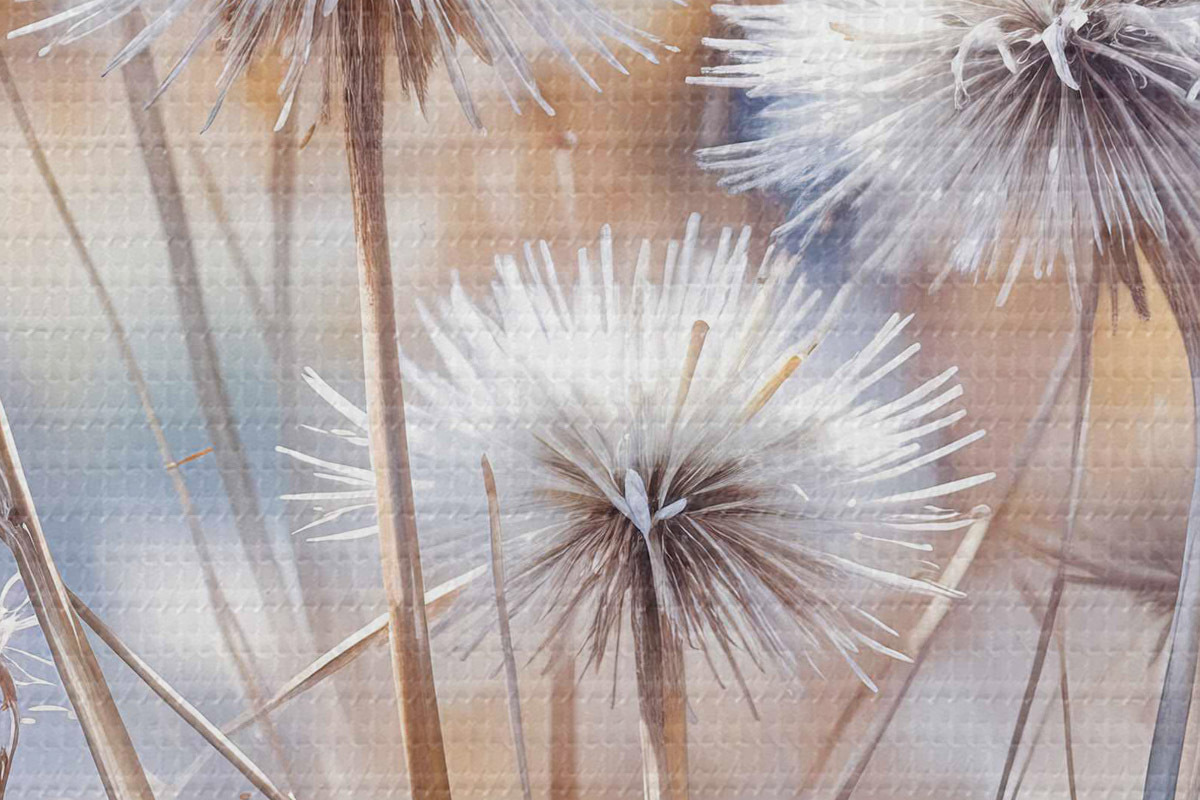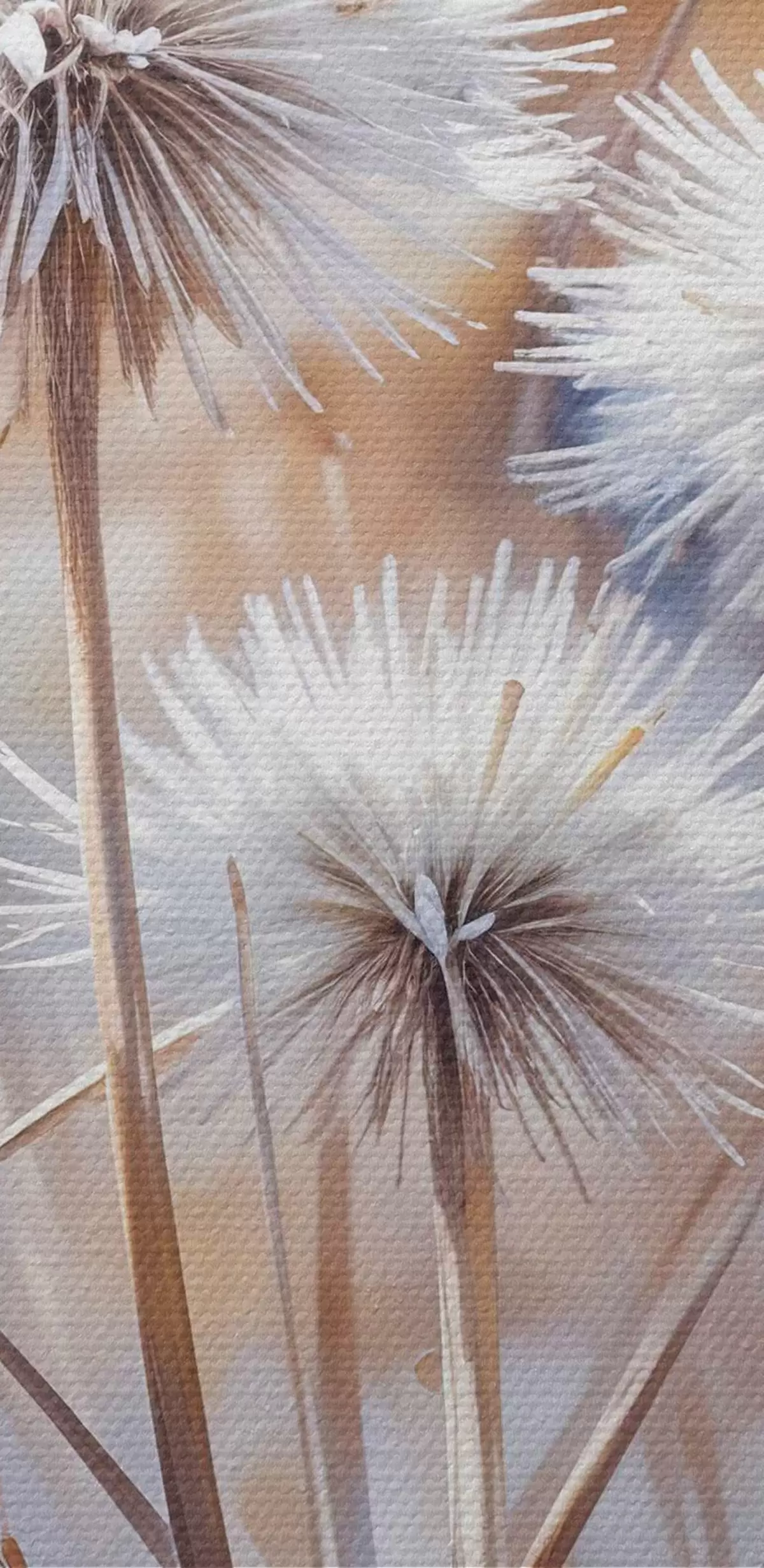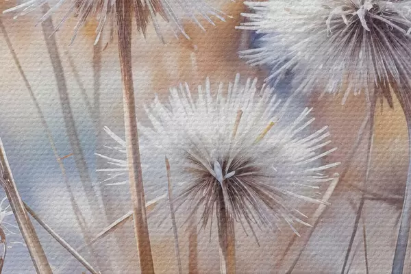 Foto Esponjosas flores blancas de diente de león sobre fondo borroso de acuarela con iluminación cálida Nr r40541