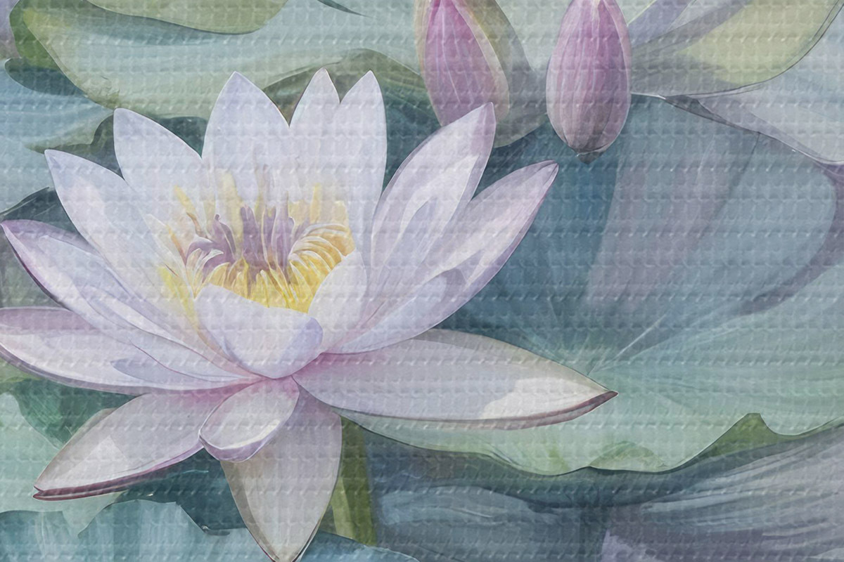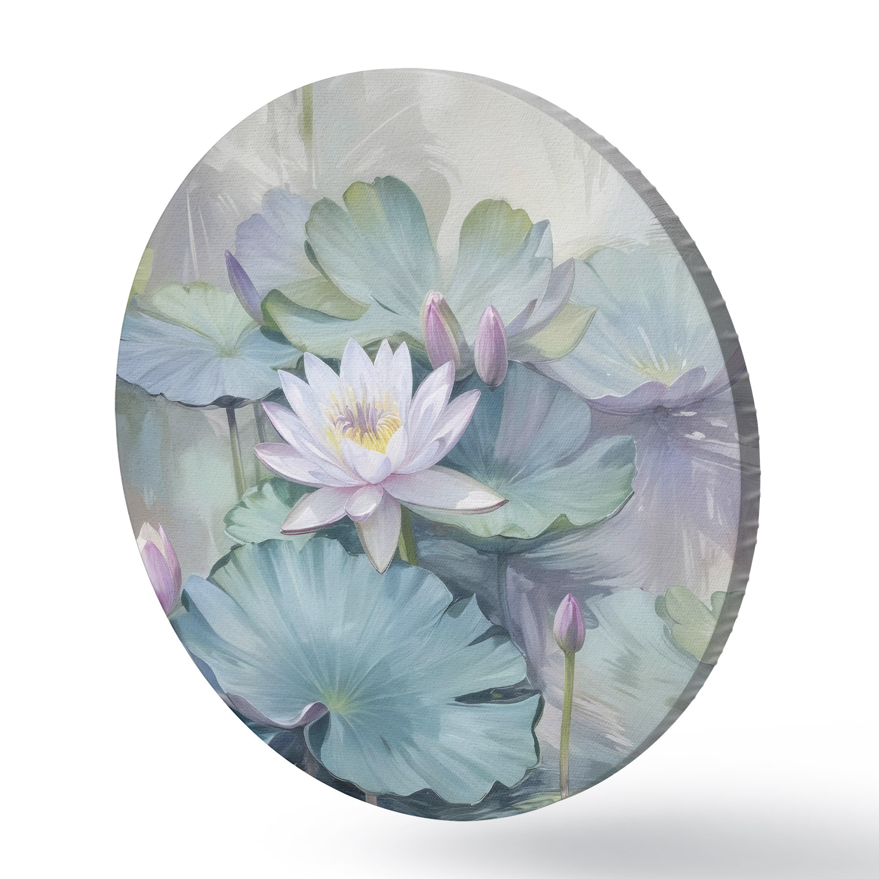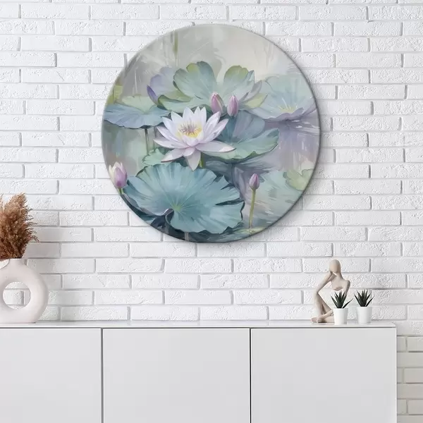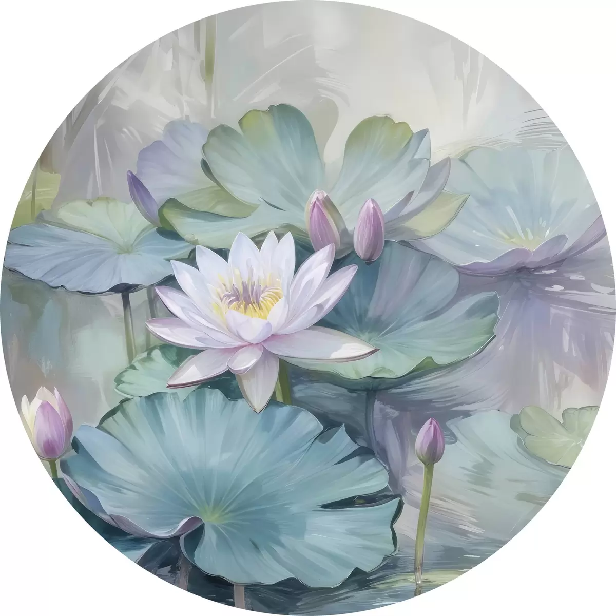 Cuadros redondos Tranquila imagen de un estanque con nenúfares y flores en colores pastel, rodeado de exuberantes hojas verdes de nenúfar r40542