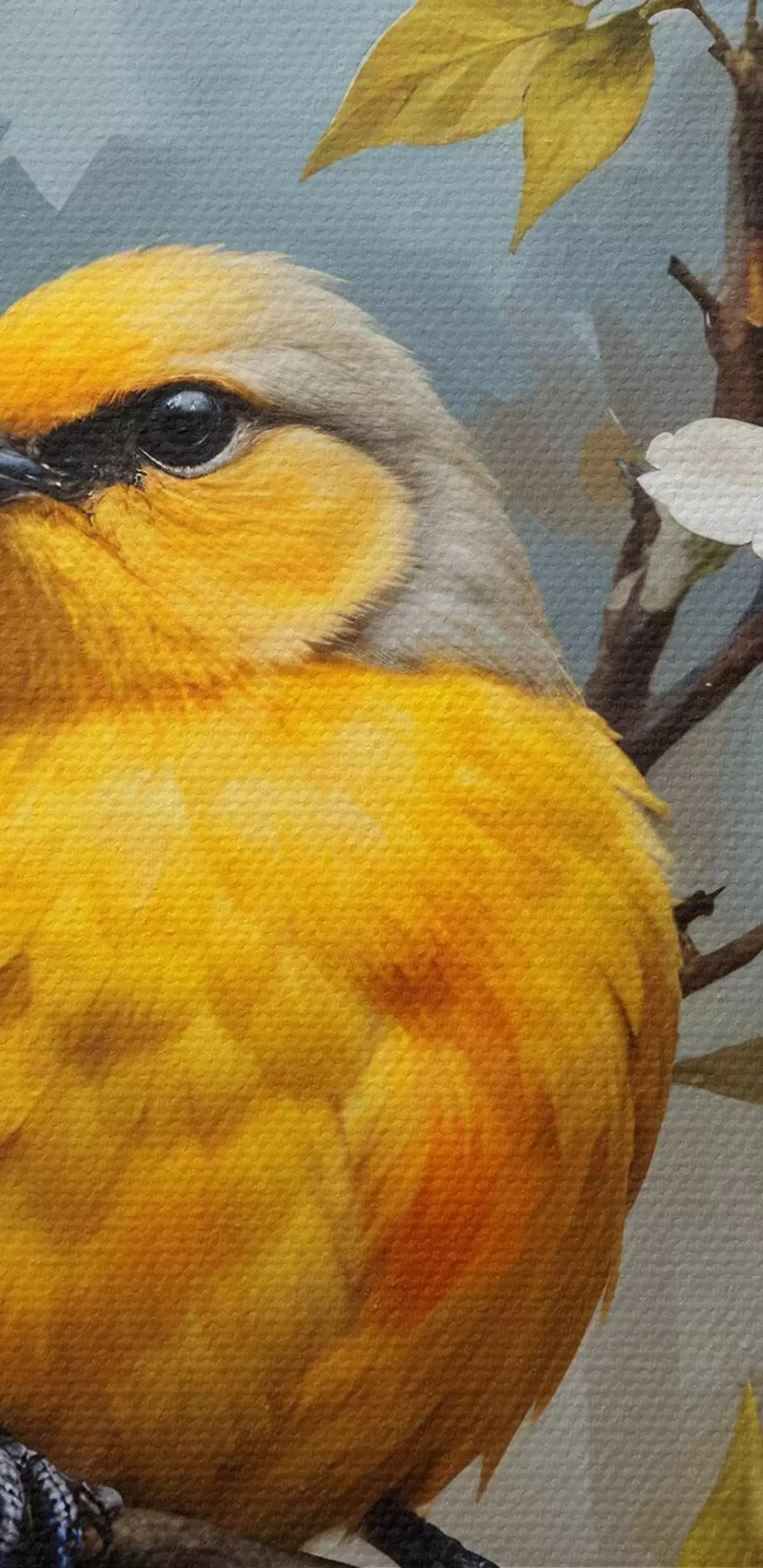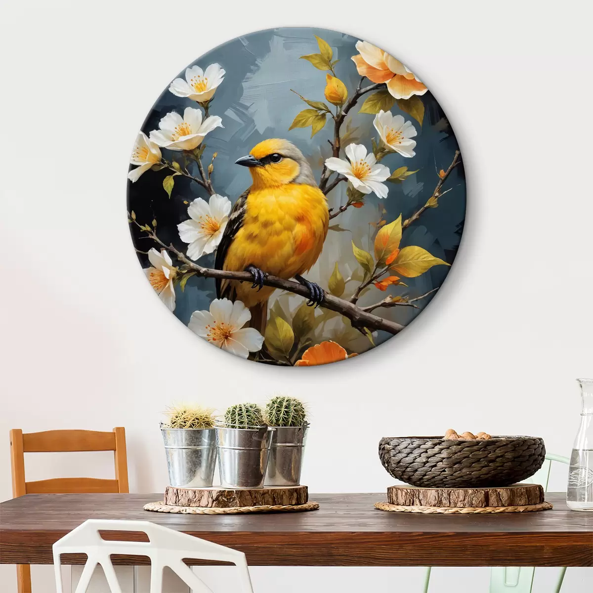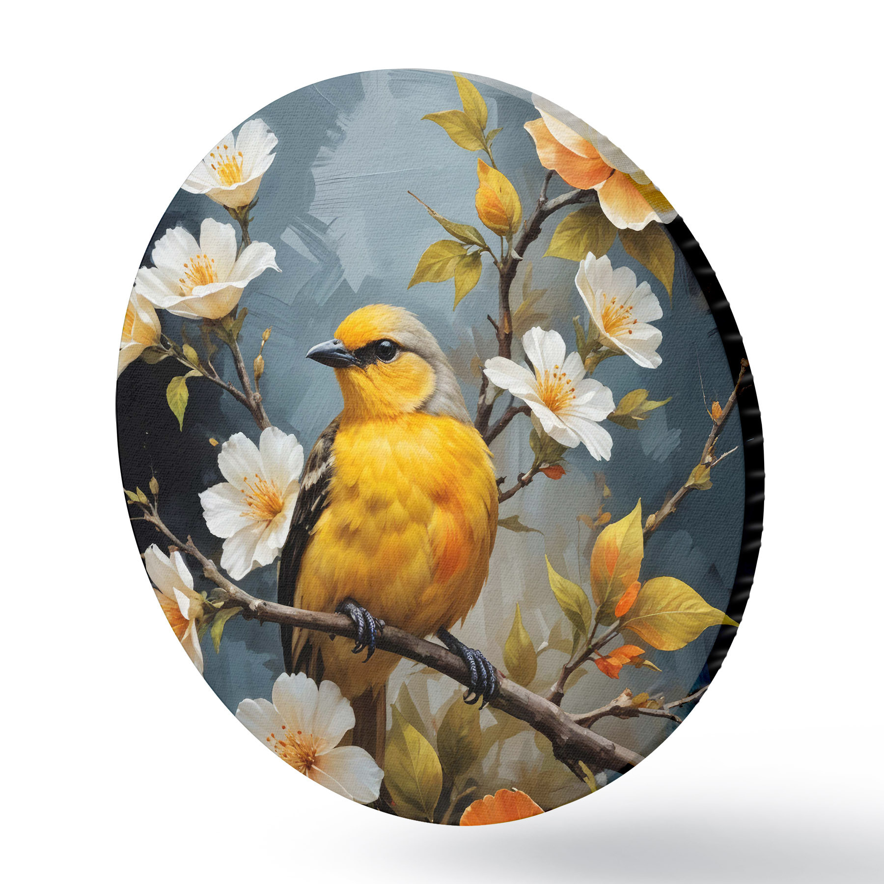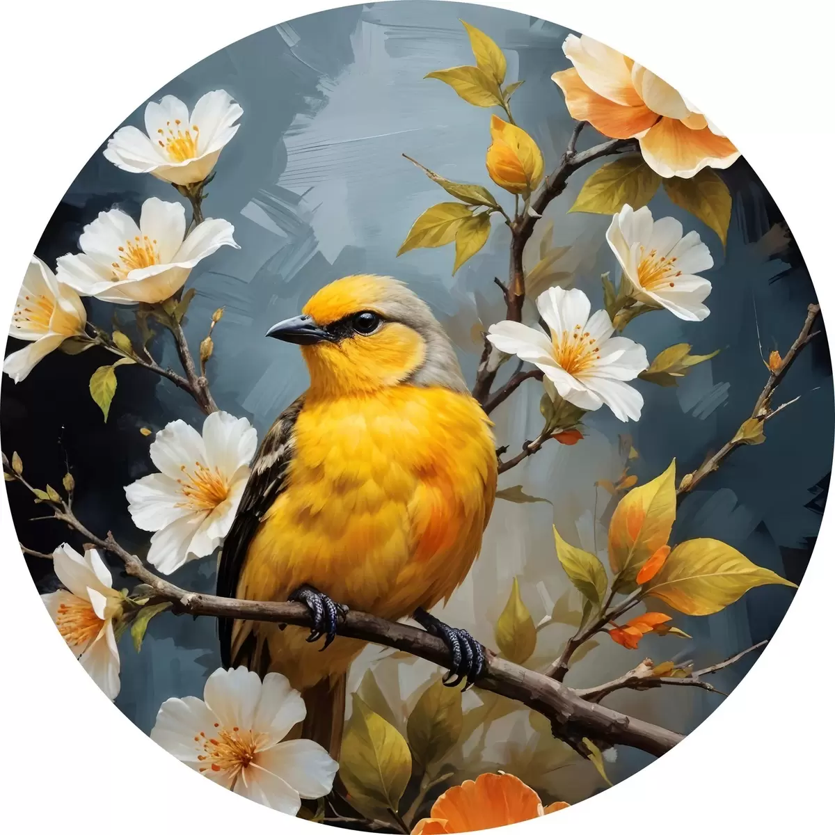 Cuadros redondos Un pájaro amarillo sentado en una rama con flores blancas y naranjas de fondo r40550