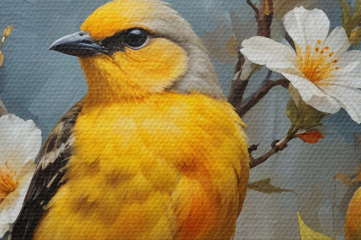 Foto Un pájaro amarillo sentado en una rama con flores blancas y naranjas de fondo Nr r40550