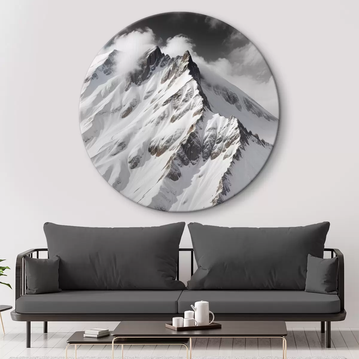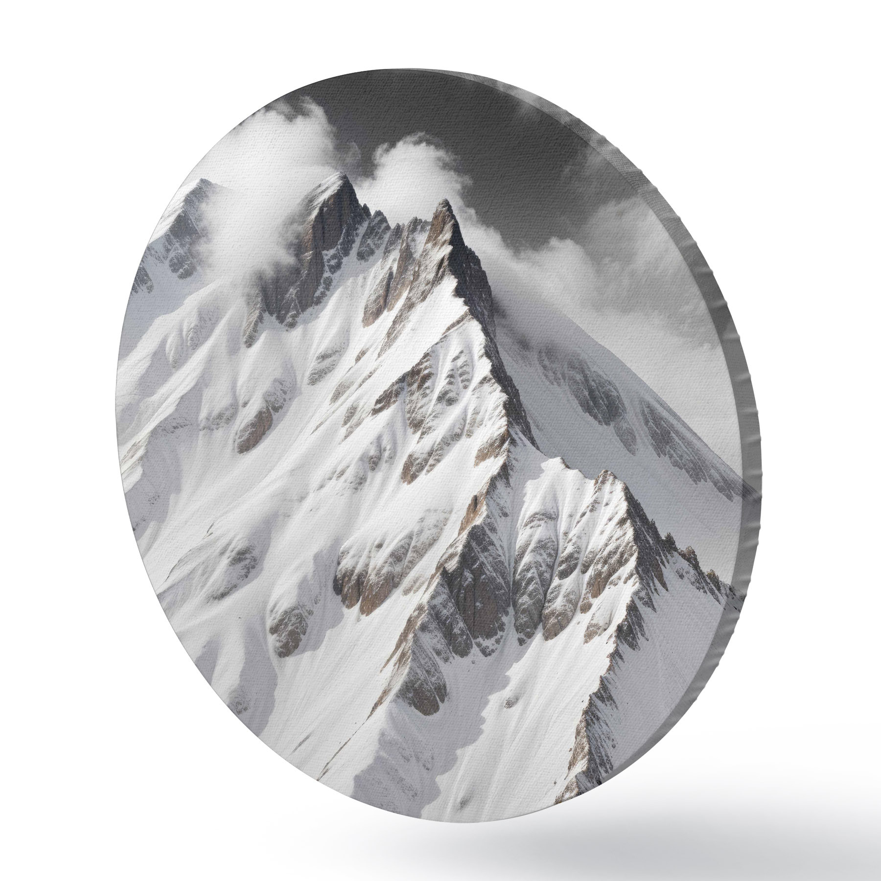 Cuadros redondos Picos montañosos blancos y negros cubiertos de nieve en un paisaje nublado y dramático r40553