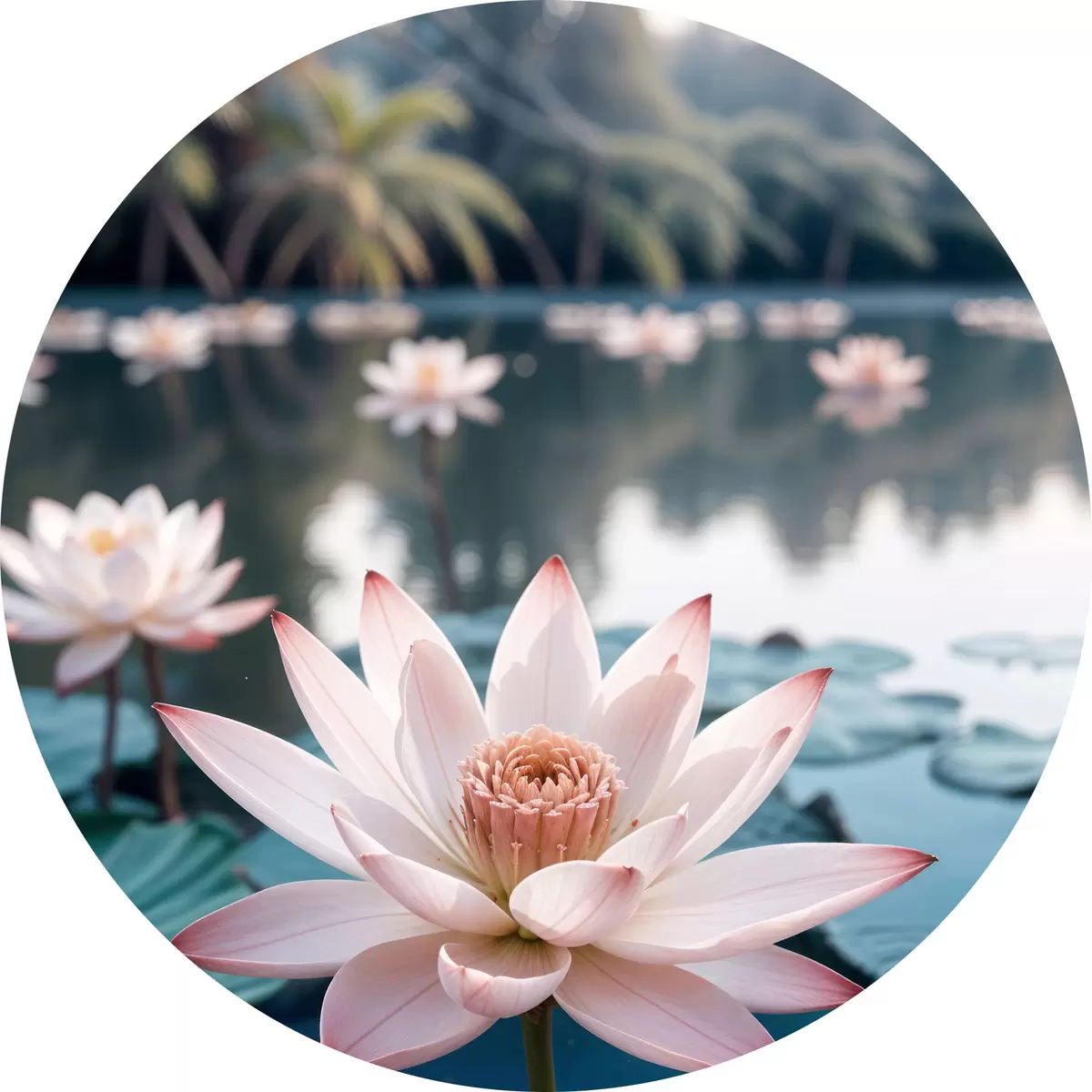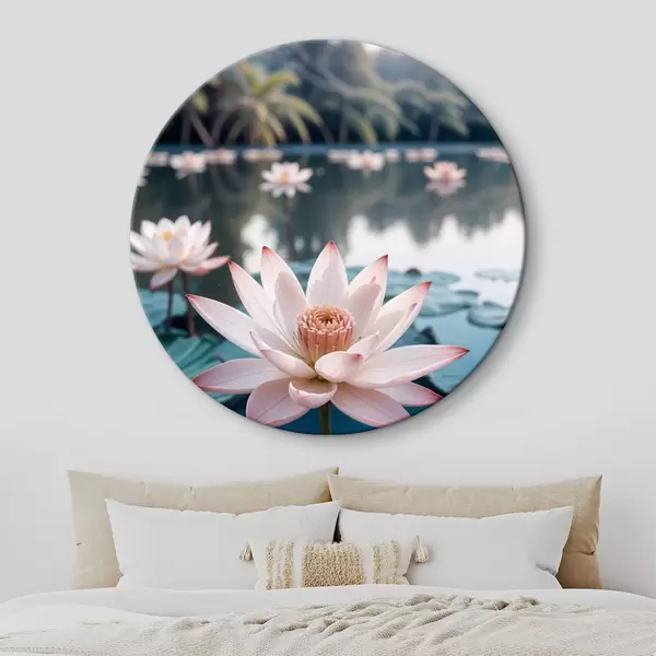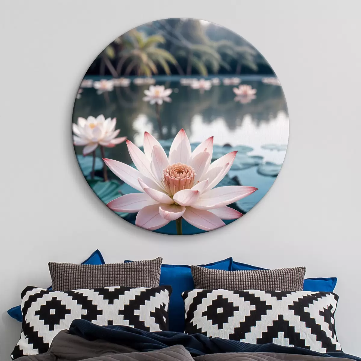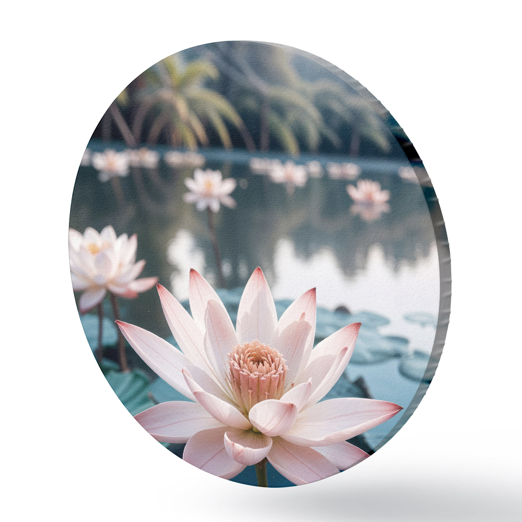 Cuadros redondos Un estanque con flores de loto rosadas flotando en la superficie, rodeado de exuberante vegetación y palmeras r40555