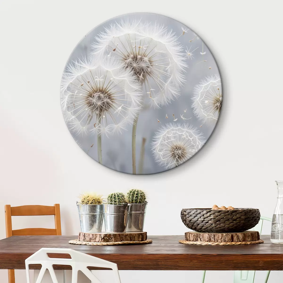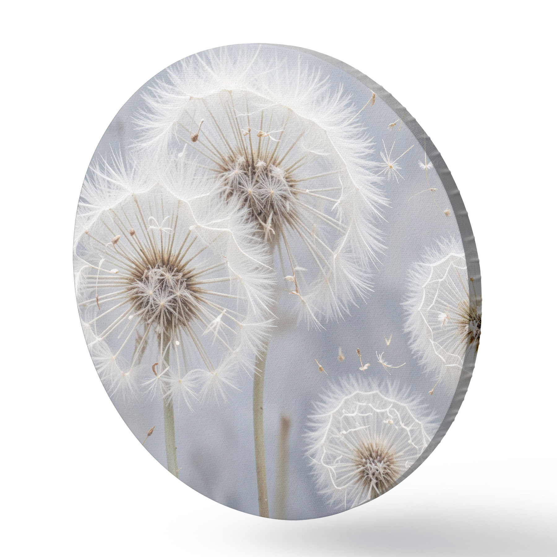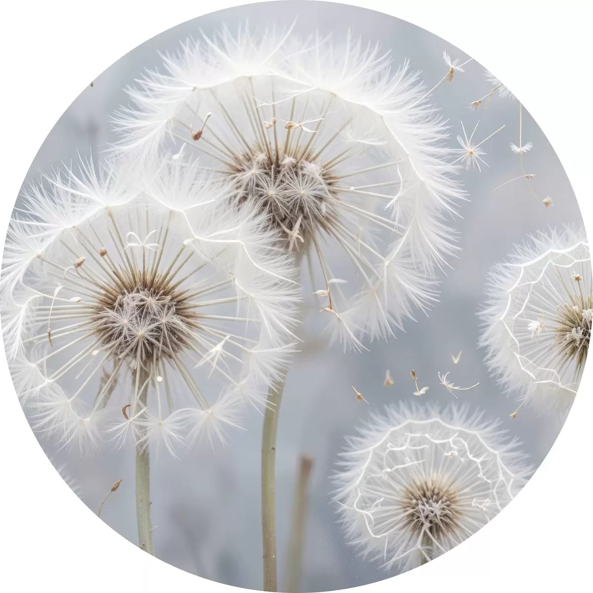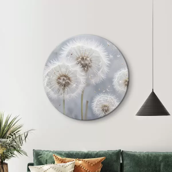Cuadros redondos Flores blancas de diente de león con semillas esponjosas sobre fondo gris borroso r40556